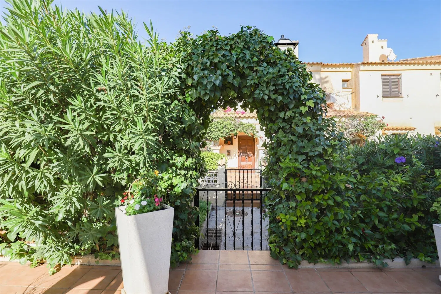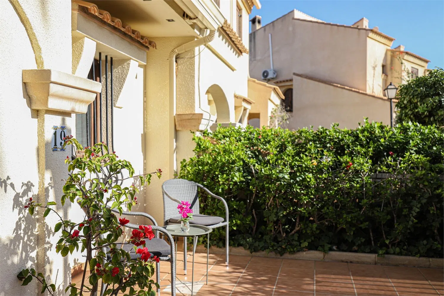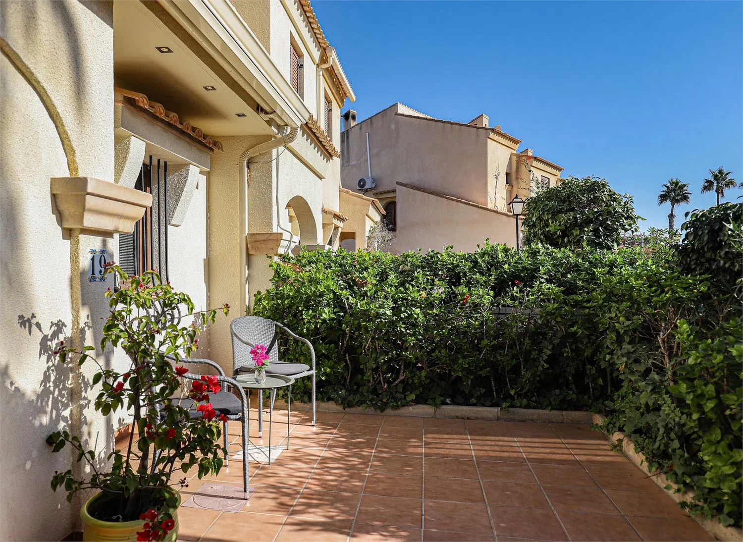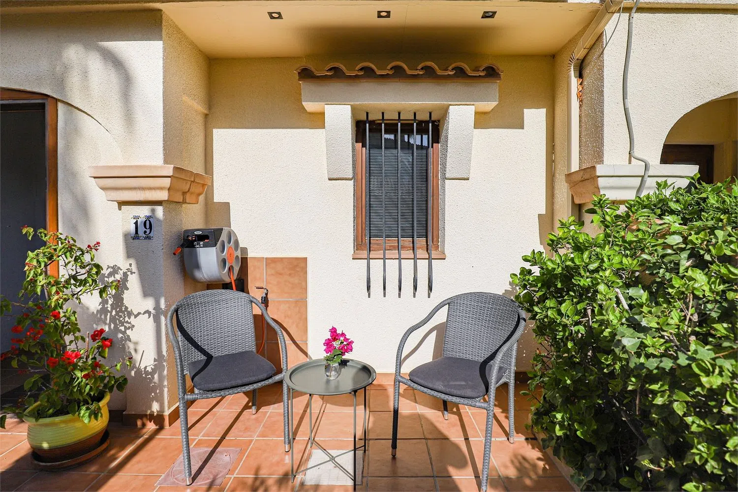 Сад, в основном вымощенный, включает фруктовые деревья, цветы и растения. Входная зона включает удобный холл с возможностями хранения. Первая спальня идеально подходит для гостей или в качестве рабочего кабинета. Есть также гостевой туалет с унитазом и раковиной, а рядом вестибюль с стиральной машиной.