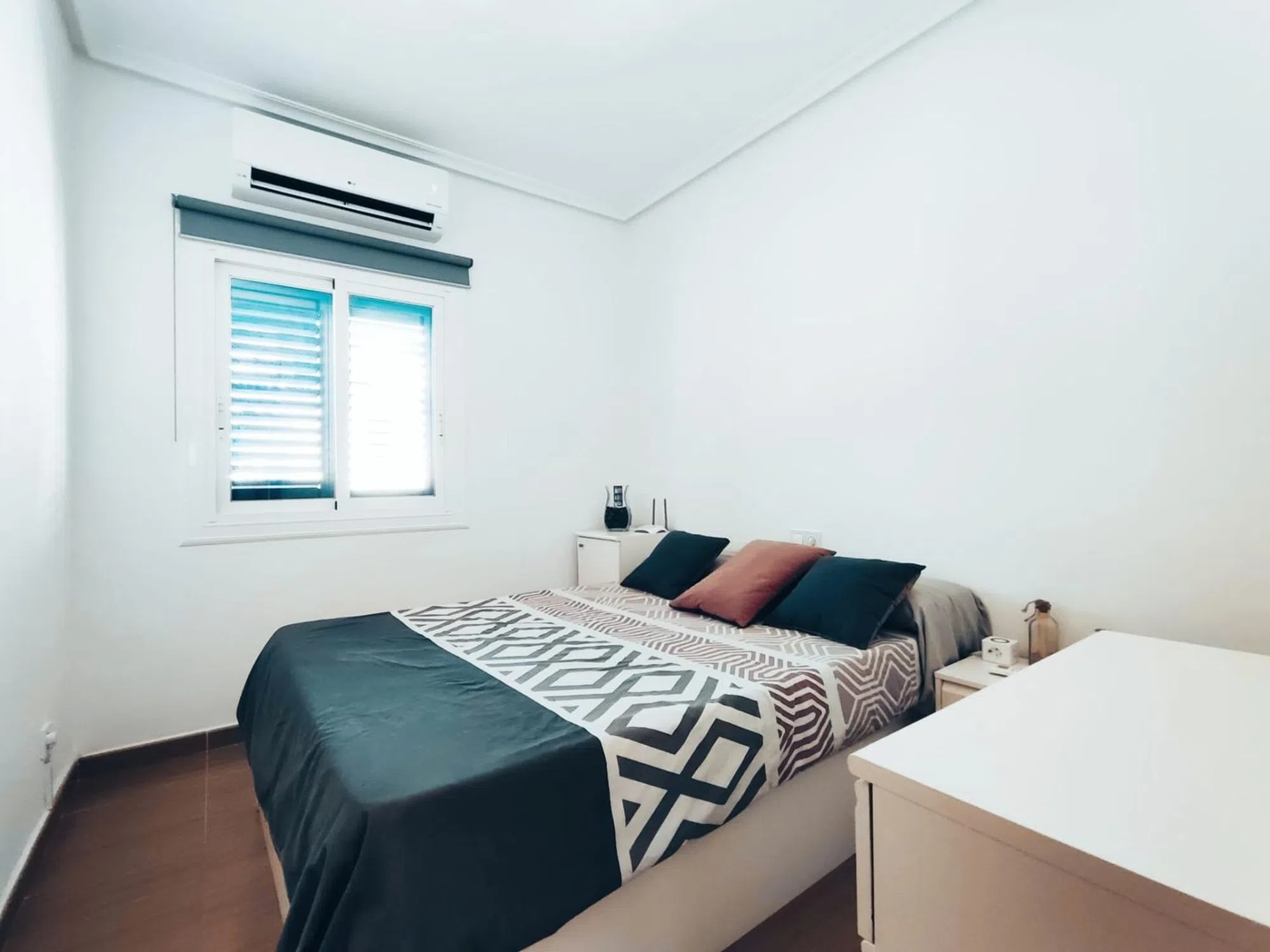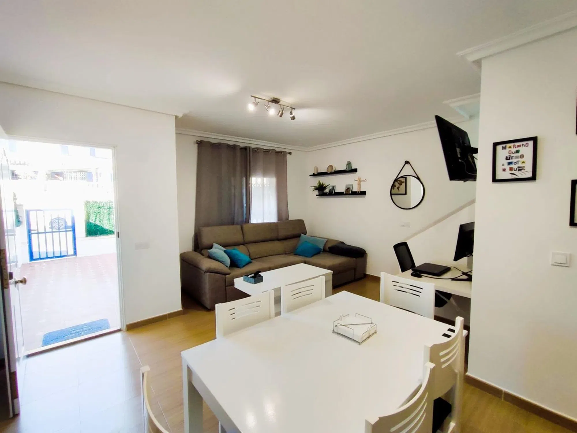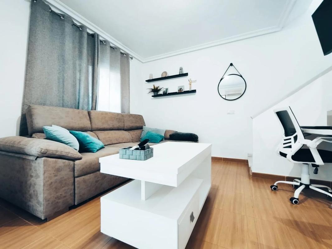 El Moncayo Properties pone a la venta este fantástico adosado en la exclusiva urbanización de Gran Alacant. La vivienda consta de 58m2 según catastro distribuidos en dos plantas más una amplia terraza. Esta exclusiva vivienda cuenta con entrada independiente directa a la terraza frontal, que cuenta con barbacoa y toldo y amplio espacio para disfrutar del clima mediterráneo. Entramos a la vivienda y nos encontramos con un amplio salón comedor con cocina abierta, completamente amueblado con muebles y electrodomésticos además de split de aire acondicionado y un pequeño aseo con lavabo, inodoro y lavadora. Mediante una escalera interior accedemos a la segunda planta donde nos encontramos dos dormitorios amplios con camas dobles y armarios empotrados, ambos orientados al sur con ventanas exteriores y un baño completo con plato de ducha, lavabo e inodoro. La urbanización cuenta con una piscina comunitaria con maravillosas vistas a toda la bahía de Alicante. Ubicado junto a la zona principal de comercios, servicios y restaurantes, a tan solo 800m de las playas. A 10 minutos al norte tenemos la ciudad de Alicante y al sur nos encontramos con Santa Pola. Un lugar exclusivo para vivir todo el año. ¡Llámanos y ven a visitarlo!