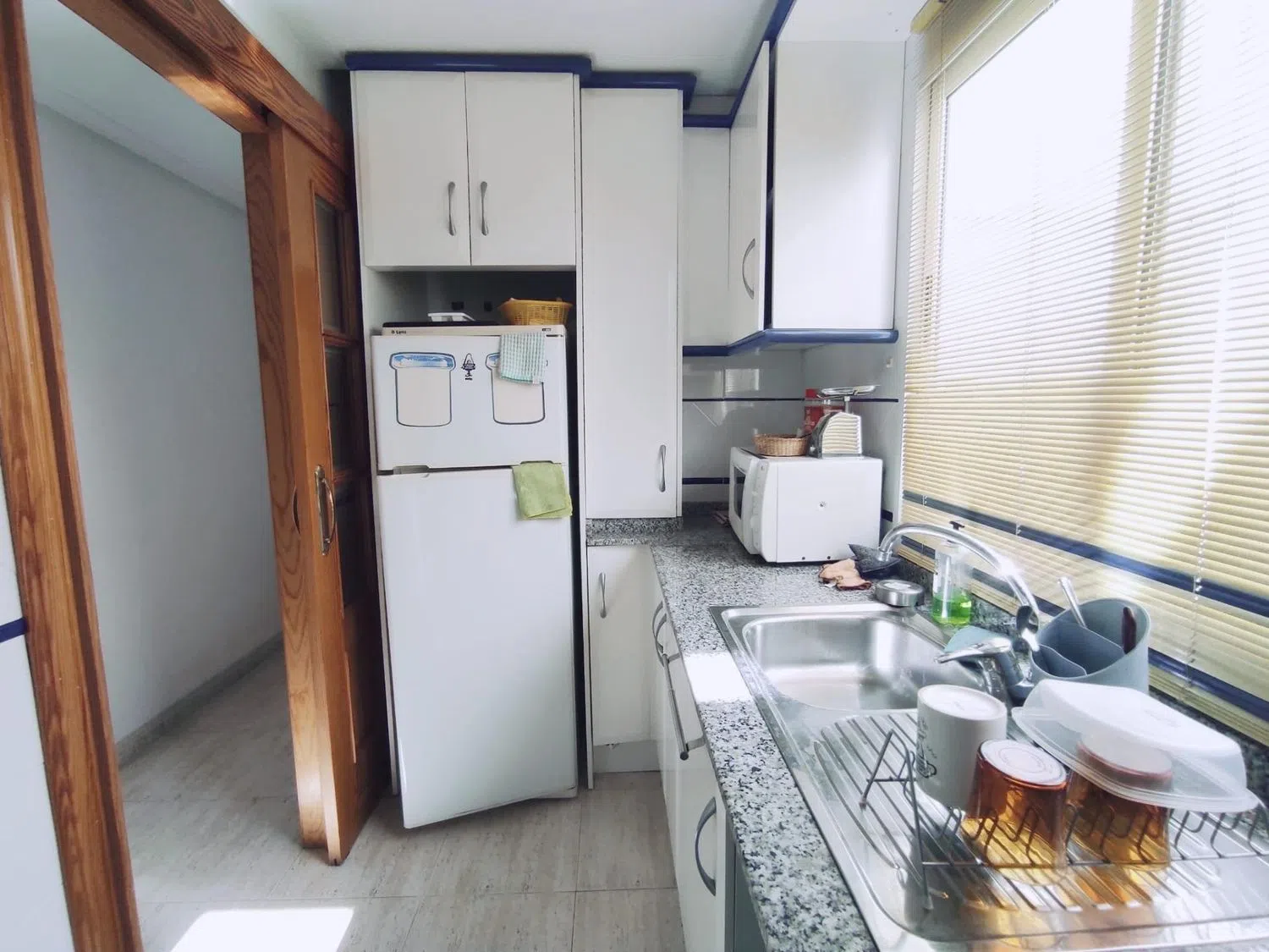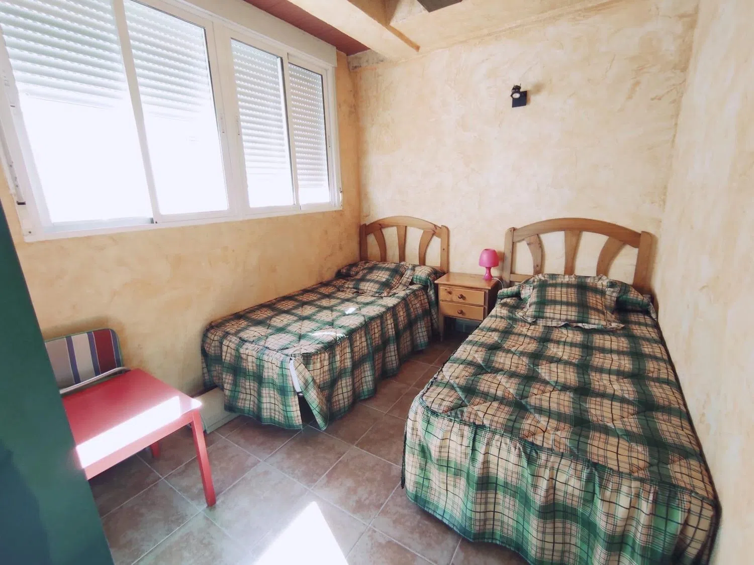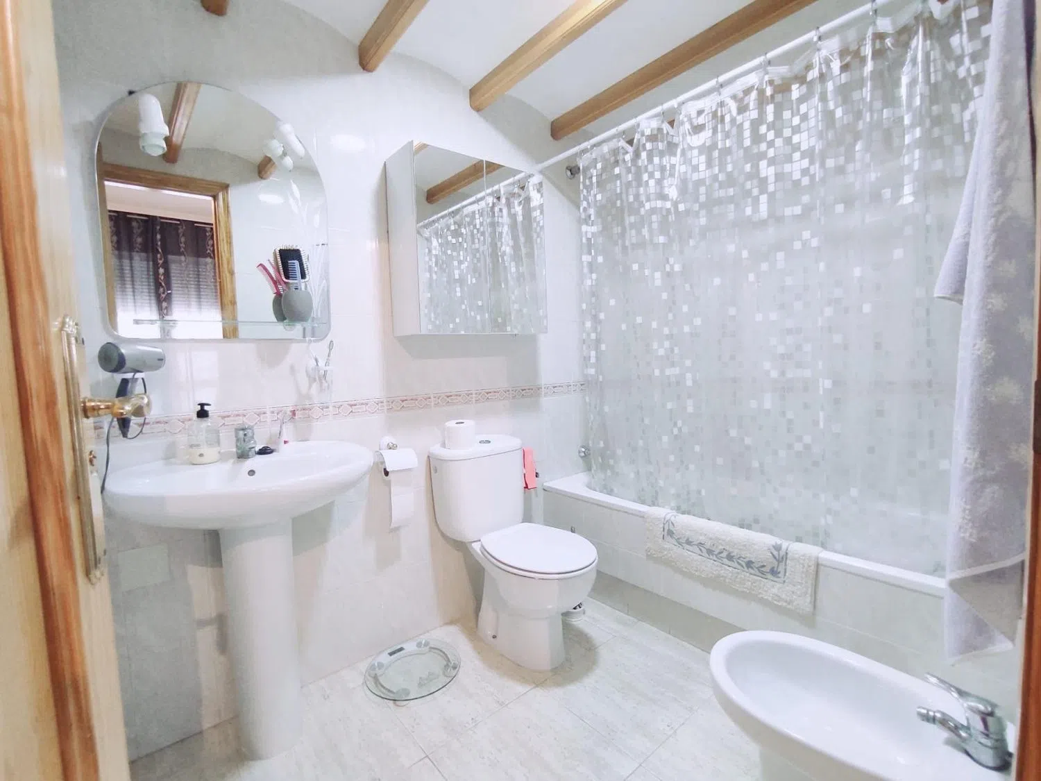 На первом этаже расположены: два просторных спальни, одна из которых оборудована двуспальной кроватью и встроенным шкафом, а вторая — также с двуспальной кроватью, встроенным шкафом и собственной ванной комнатой; два полных санузла, в которых есть раковина, биде, унитаз и ванна; отдельная кухня, оснащенная мебелью и бытовой техникой; а также просторная меблированная гостиная-столовая с выходом на небольшую террасу, ориентированную на север, и лестницей, ведущей на второй этаж.