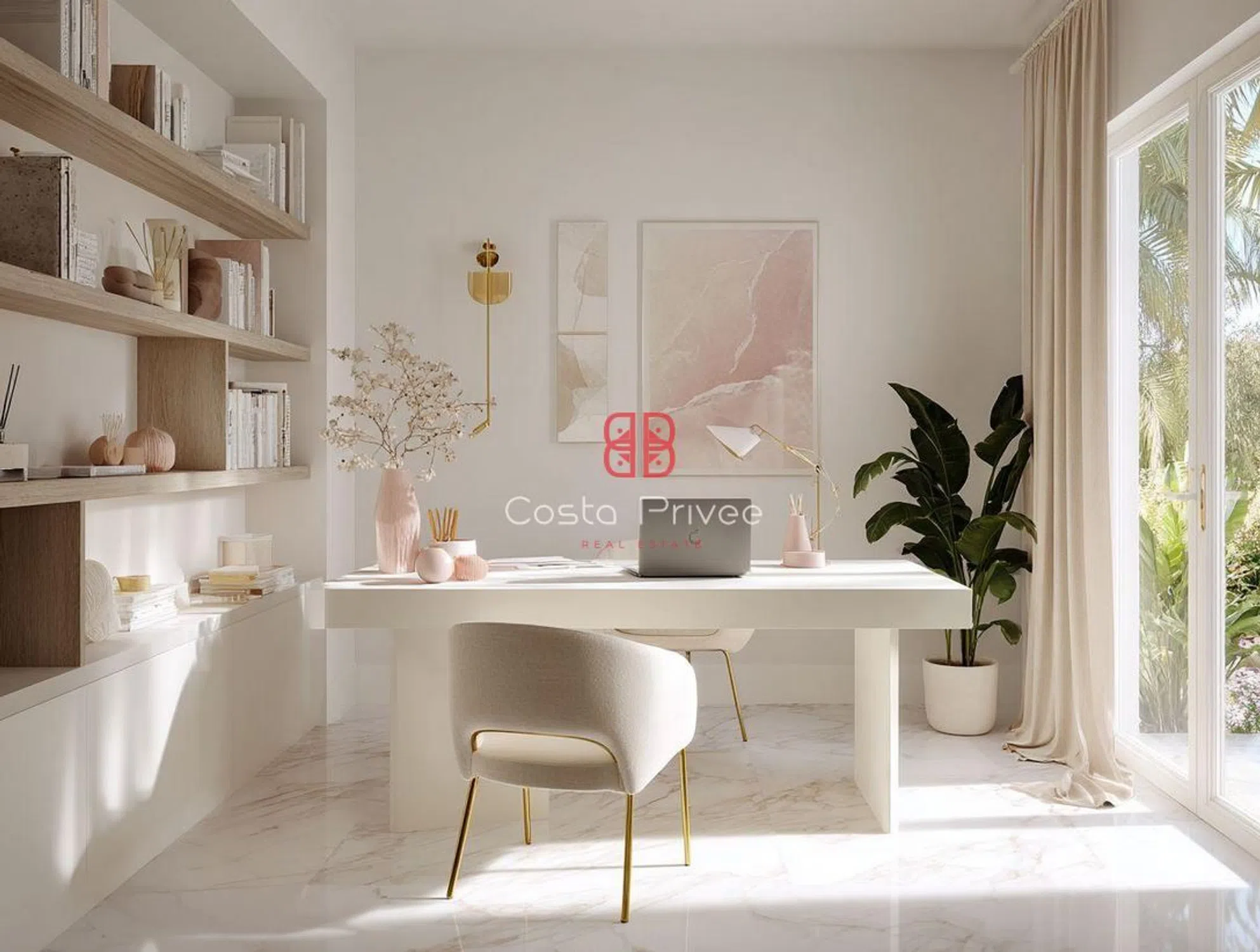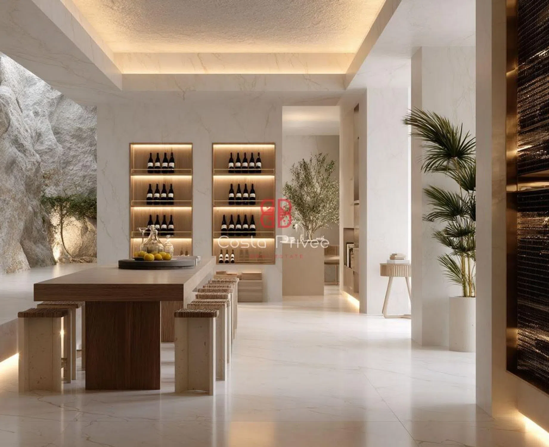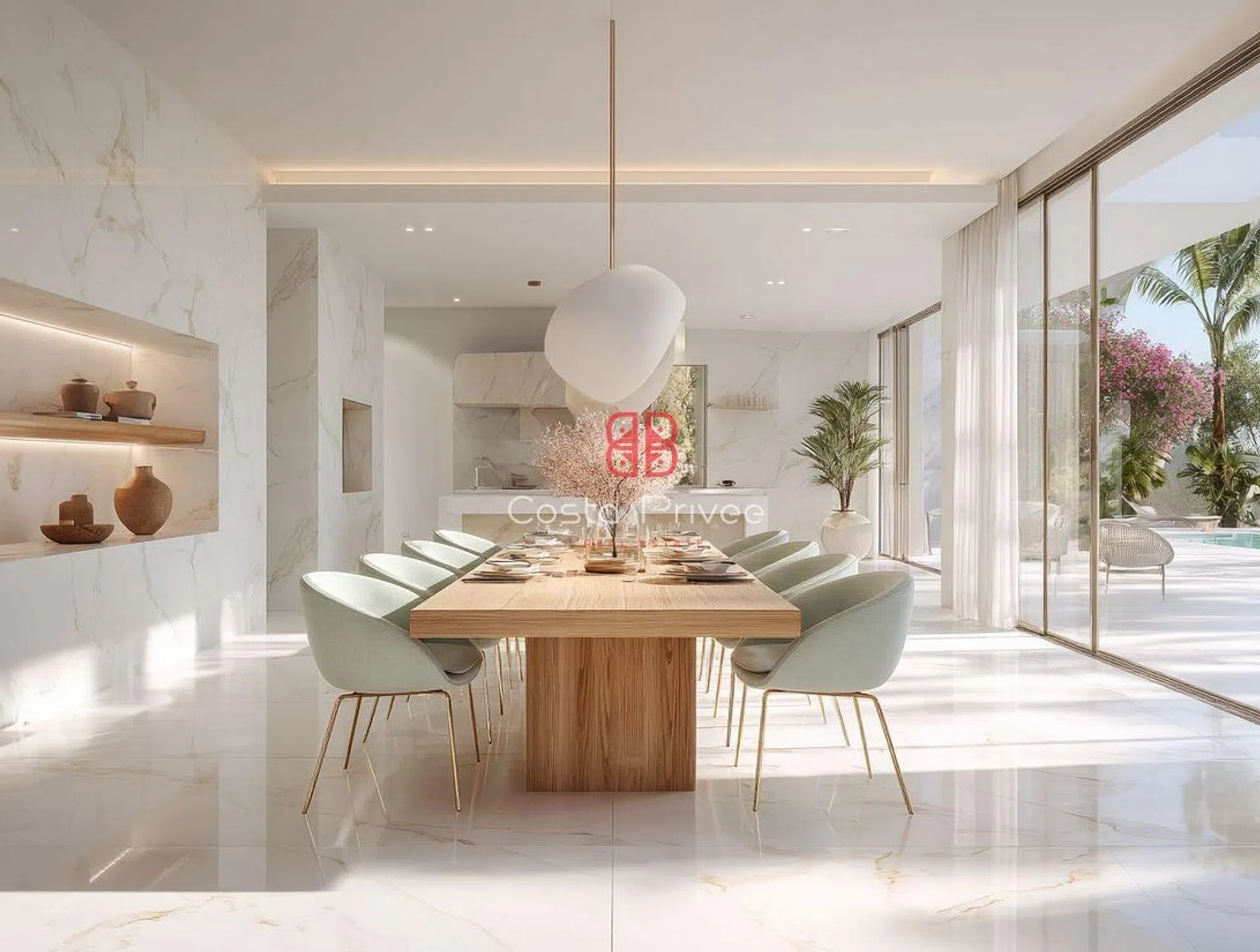 Интерьеры исполнены в белой и спокойной эстетике, с мраморными полами, большими окнами от пола до потолка и палитрой цветов, вдохновленных морем и песком: белый, бежевый, оливково-зеленый и мягкие розовые оттенки. Главная гостиная, теплая и элегантная, напрямую соединяется с террасой и состоит из большого модульного дивана, встроенных стеллажей и текстурированных произведений искусства, все это освещено естественным светом. Столовая с большим столом из массива дерева и стульями, обитыми светло-зеленой тканью, открывается на минималистичную кухню с мраморным островом и белой мебелью, с тщательно интегрированными деталями для сохранения чистоты пространства.