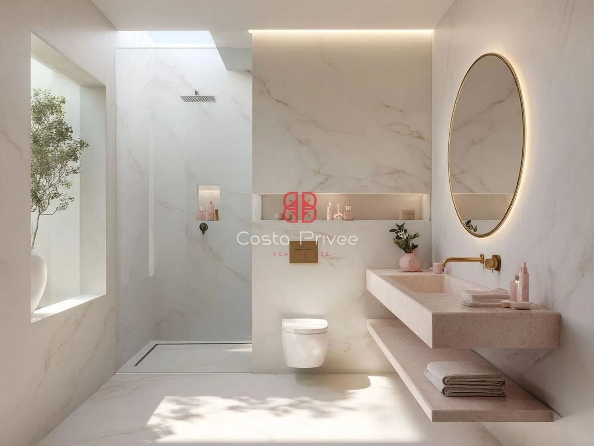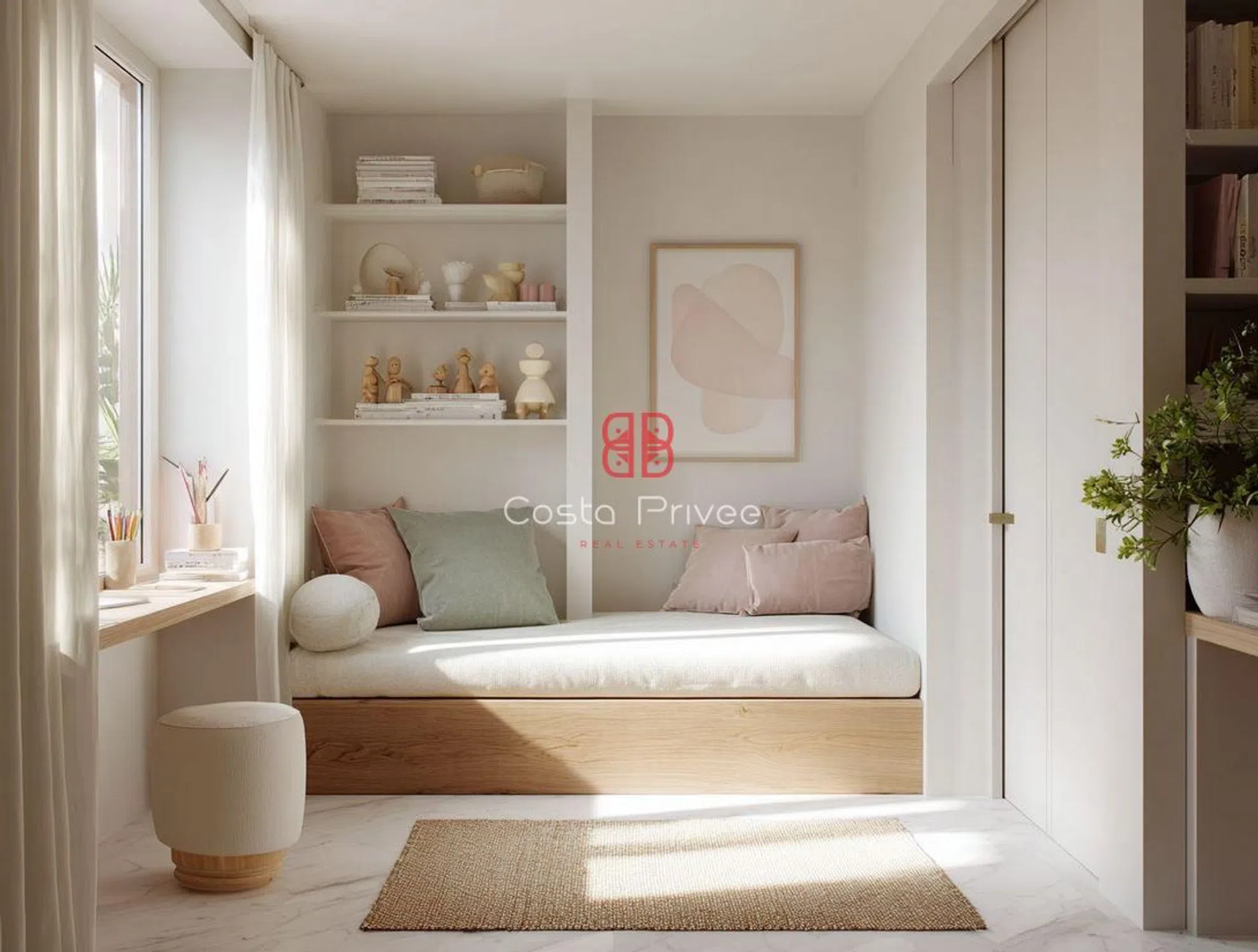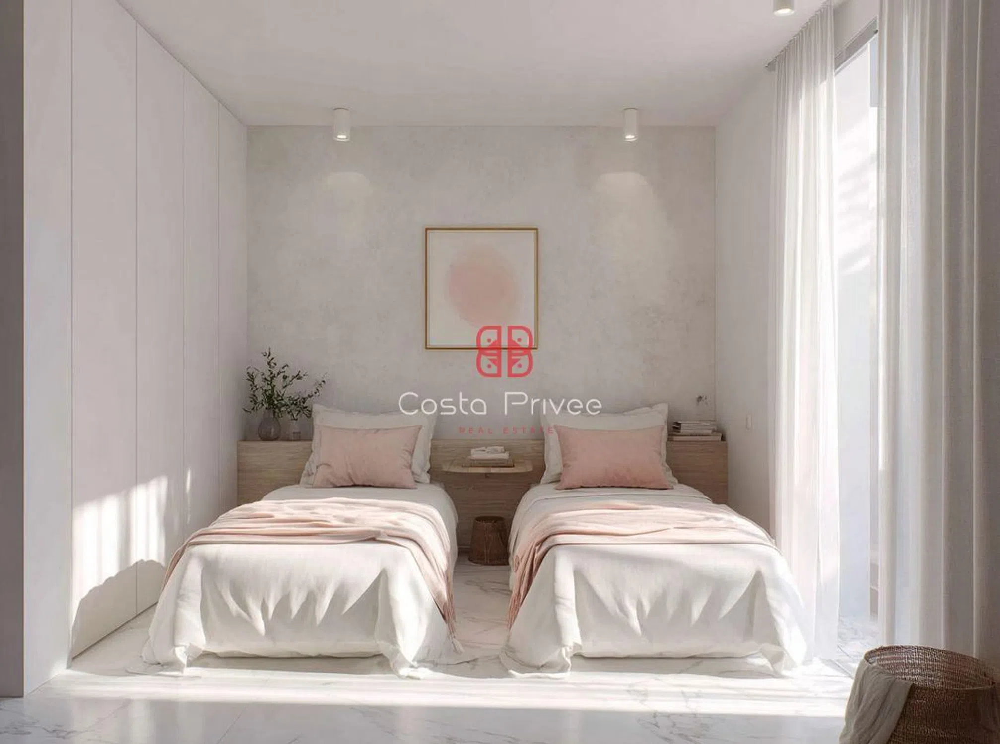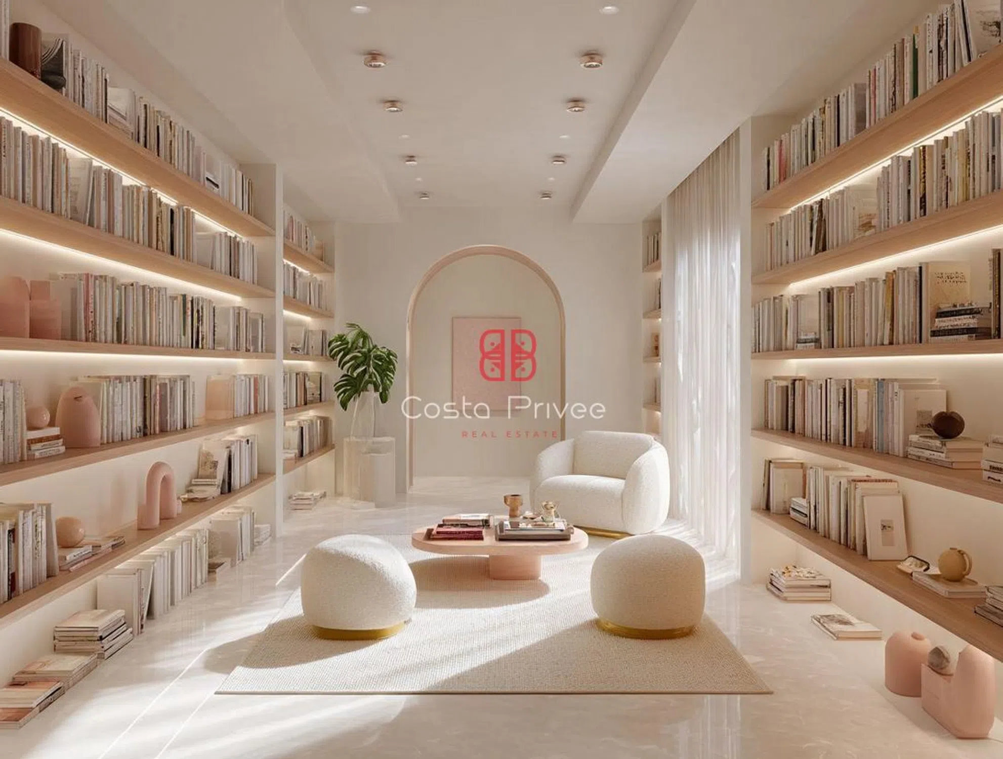 Интерьеры исполнены в белой и спокойной эстетике, с мраморными полами, большими окнами от пола до потолка и палитрой цветов, вдохновленных морем и песком: белый, бежевый, оливково-зеленый и мягкие розовые оттенки. Главная гостиная, теплая и элегантная, напрямую соединяется с террасой и состоит из большого модульного дивана, встроенных стеллажей и текстурированных произведений искусства, все это освещено естественным светом. Столовая с большим столом из массива дерева и стульями, обитыми светло-зеленой тканью, открывается на минималистичную кухню с мраморным островом и белой мебелью, с тщательно интегрированными деталями для сохранения чистоты пространства.