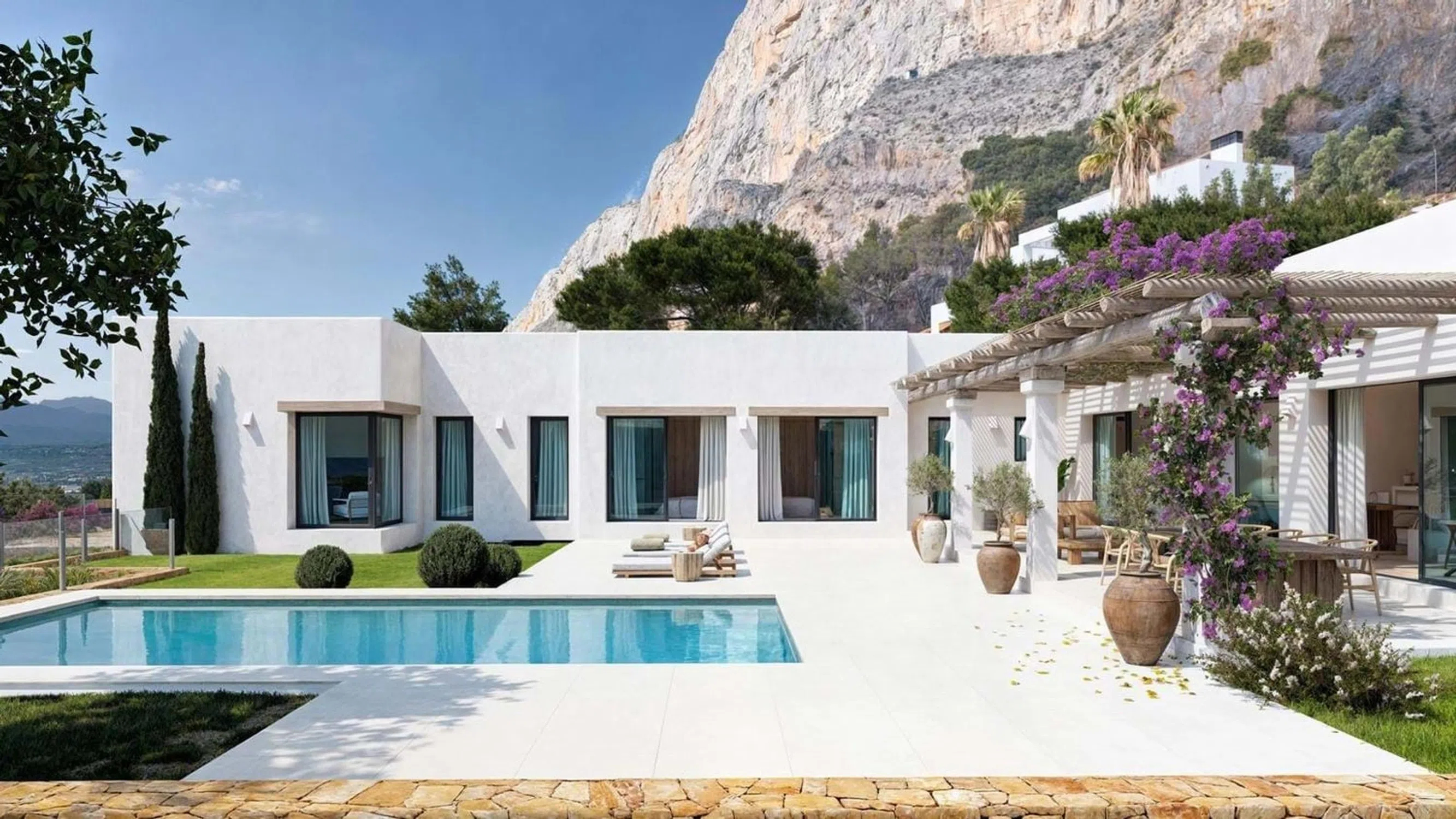 Impresionante villa nueva ubicada en la codiciada zona del Montgó de Jávea, que ofrece impresionantes vistas a la montaña y sol todo el día gracias a su orientación ideal al sur. Descripción general de la propiedad: Este elegante y moderno cuenta con 4 dormitorios, 3 de los cuales cuentan con baño en suite, junto con un aseo de invitados para mayor comodidad. Cuidadosamente diseñado en un solo nivel, encuentre una luminosa sala de estar y cocina de planta abierta que fluye a la perfección hacia la terraza al aire libre con una hermosa piscina. Grandes ventanales enmarcan la naturaleza circundante y llenan el espacio de luz natural, creando un ambiente relajado y acogedor durante todo el año. Todas las habitaciones son de tamaño generoso y están terminadas con los más altos estándares, combinando privacidad, comodidad y estilo. Y el diseño inteligente garantiza la facilidad de vida, lo que lo hace perfecto para familias o aquellos que buscan un estilo de vida sin escalones. En el nivel inferior, encontrará un apartamento de invitados totalmente independiente, ideal para visitar a amigos y familiares. El apartamento de invitados independiente incluye una cocina y sala de estar de planta abierta, baño privado y acceso independiente para una total privacidad. Características adicionales: - Garaje privado - Apartamento de invitados independiente Ubicación Prime Montgó: Situada en la tranquila y prestigiosa zona del parque natural del Montgó, esta villa ofrece vistas panorámicas a las montañas, proximidad a las playas cristalinas de Jávea, restaurantes, escuelas y servicios, y una conexión única con la naturaleza. Una combinación perfecta de diseño moderno, comodidad y estilo de vida mediterráneo, ya sea como casa familiar o como retiro de vacaciones.
