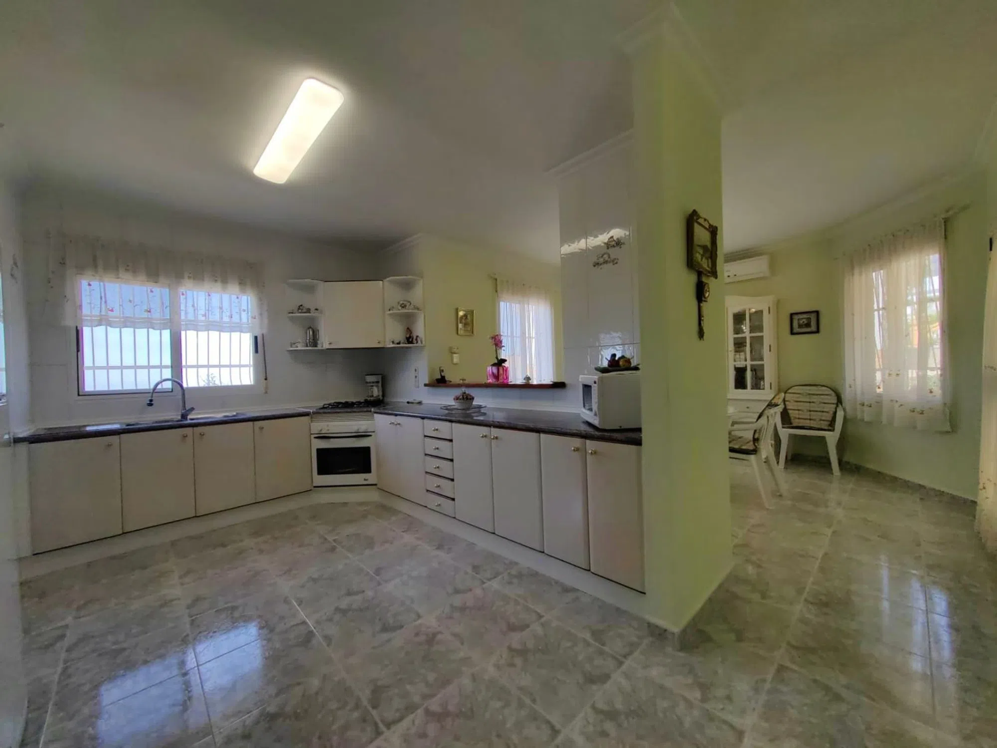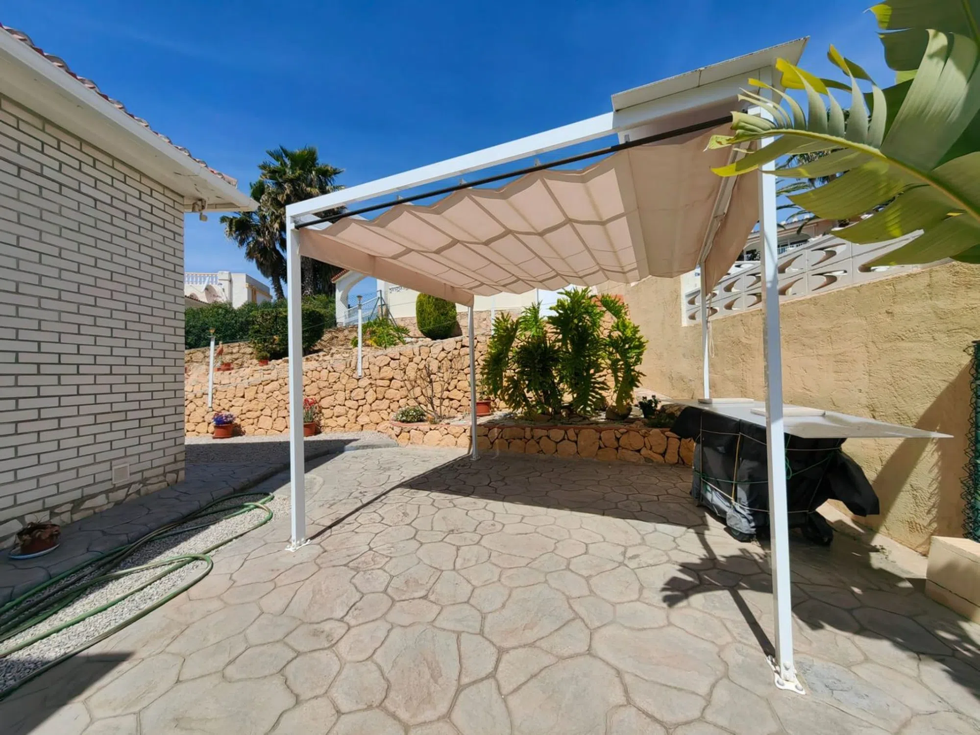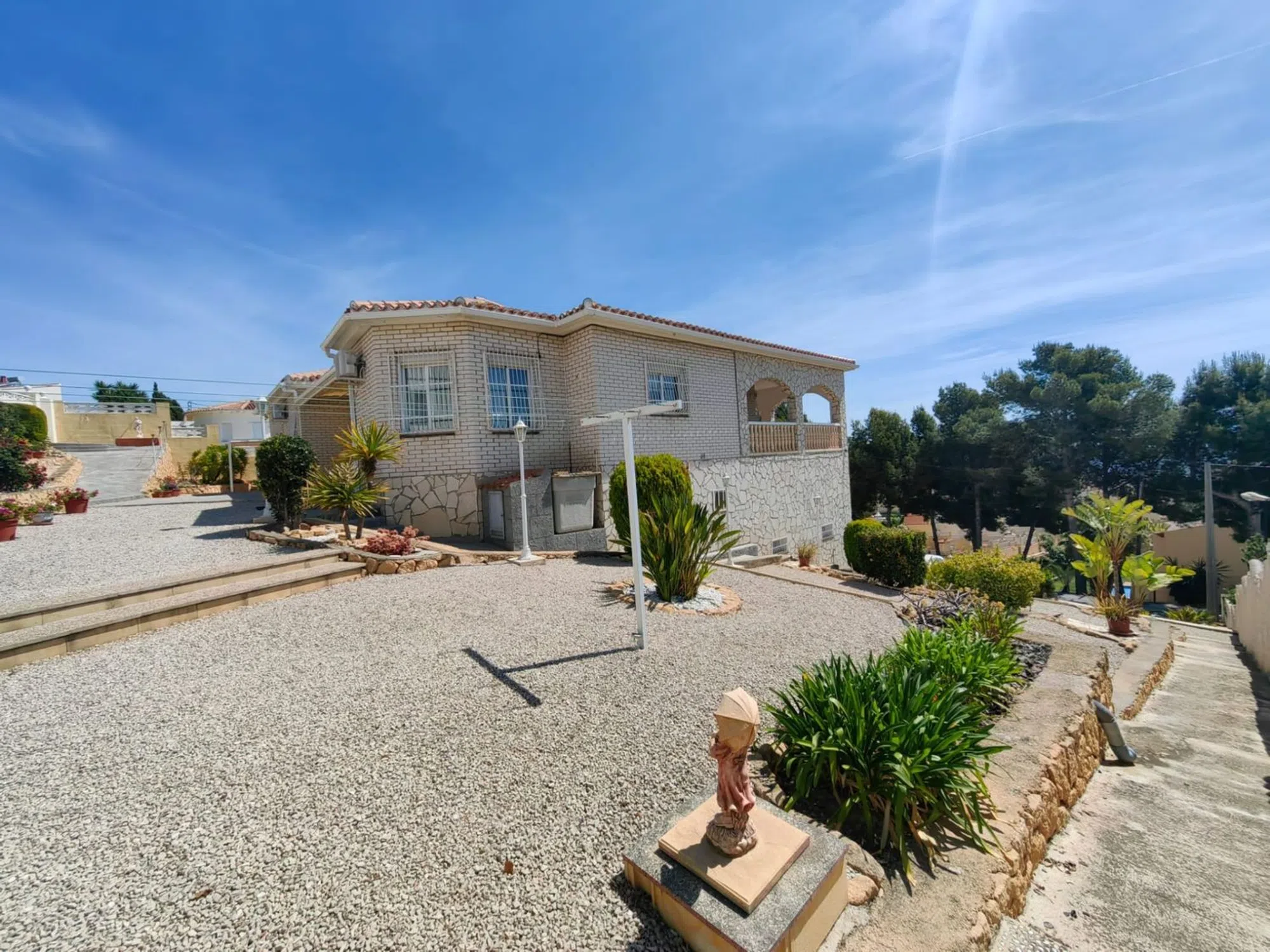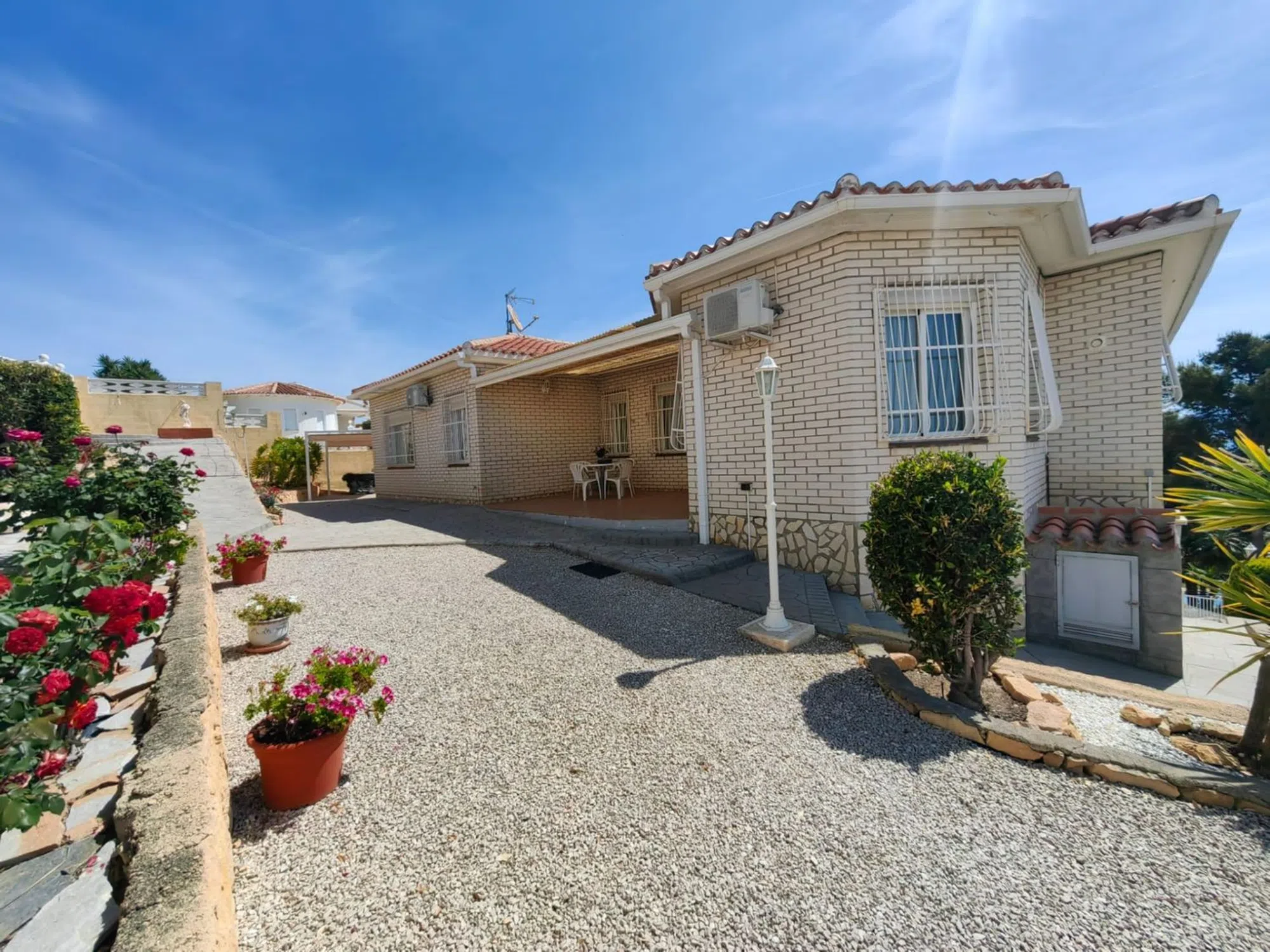 Chalet independiente, ubicada en La Nucia con vistas a Benidorm, la vivienda está toda en una planta. El Chalet está construida sobre una parcela inclinada, se accede a la casa principal con entrada desde la calle trasera en la parte superior por unos pocos escalones y se encuentra cómodamente en una sola planta. Al entrar encontramos 3 dormitorios grandes, uno con baño en suite con ducha y hay otro baño, todos los dormitorios con mucho espacio de guardarropas, dispone de una gran cocina abierta con un comedor informal al lado, donde hay vistas hacia la costa para disfrutar sus comidas y desayunos. Junto a la cocina hay una pequeña galería con lavadora. El Chalet también dispone de otras 3 zonas de estar, dos salones y una zona de comedor que se podría utilizar como sala de juegos, oficina a gusto del cliente. Dispone unidad de aire acondicionado frío/calor en dormitorio principal, cocina y salón. Fue reformada y se le añadió aislamiento y cavidad de pared para proteger contra el calor y el frío en todas las paredes exteriores con techo doble. Las ventanas son de doble acristalamiento. En la planta baja accediendo desde el frente de la casa, hay un gran garaje doble con 2 puertas automáticas, con mucho espacio de almacenamiento, al lado encontramos el grandísimo gimnasio con ventanas para ventilar, si no son aficionados al deporte se puede utilizar por ejemplo como sala de cine, también podemos encontrar un espacio utilizado como almacenamiento. El chalet ofrece mucho espacio y posibilidades para adaptar la casa a tus necesidades. La terraza de 40 m cubierta fuera de la entrada principal se extiende a lo largo de la casa. La casa es de estilo contemporáneo, está en buen estado y muy bien cuidada. El jardín tiene diferentes niveles debido a la orografía de la zona y fácil de mantener, tiene posibilidad de construir una piscina. El Chalet se encuentra en una zona residencial ubicada cerca del colegio internacional privado Elians, a 5 minutos en coche de la zona comercial y a tan solo 15 minutos en coche de Benidorm donde puede encontrar todo tipo de entretenimiento, la ubicación del Chalet ofrece tranquilidad y al mismo tiempo poder salir a divertirse. Pide tu visita con Prime-houses. com [IW].