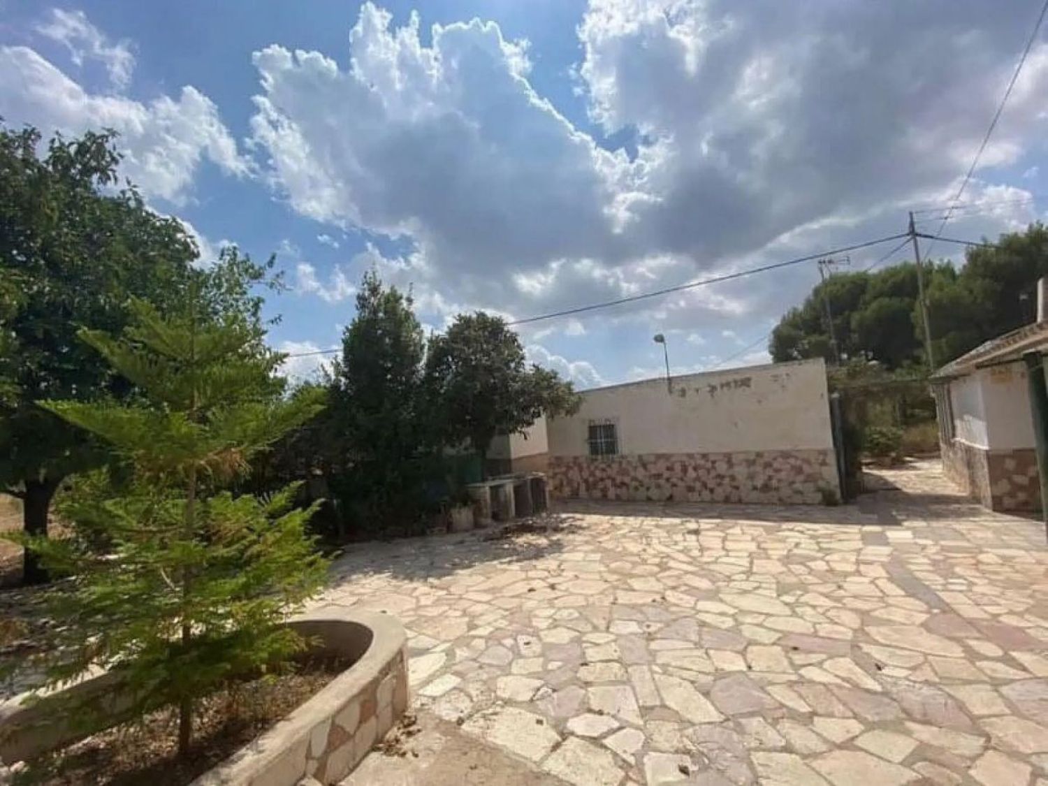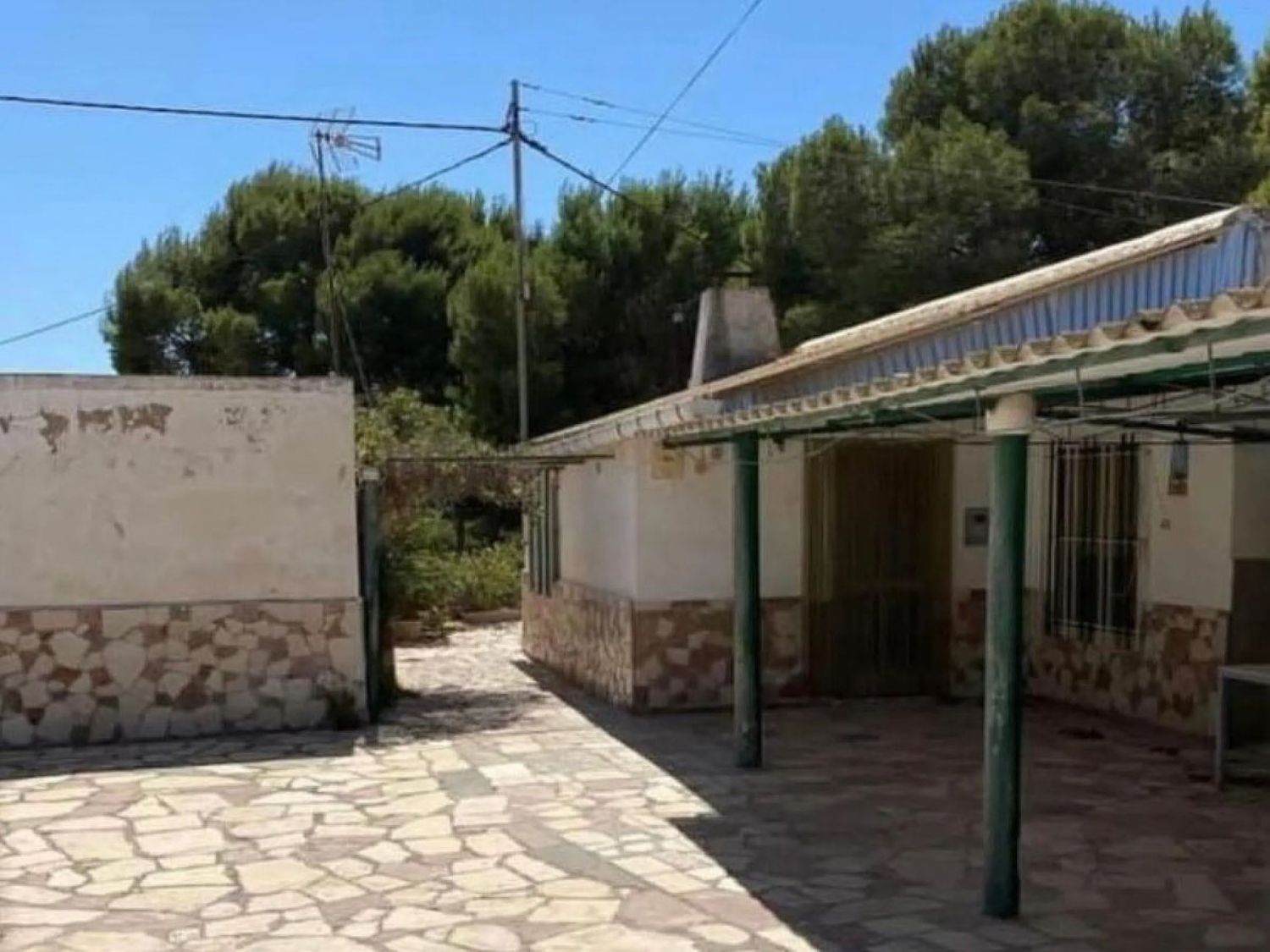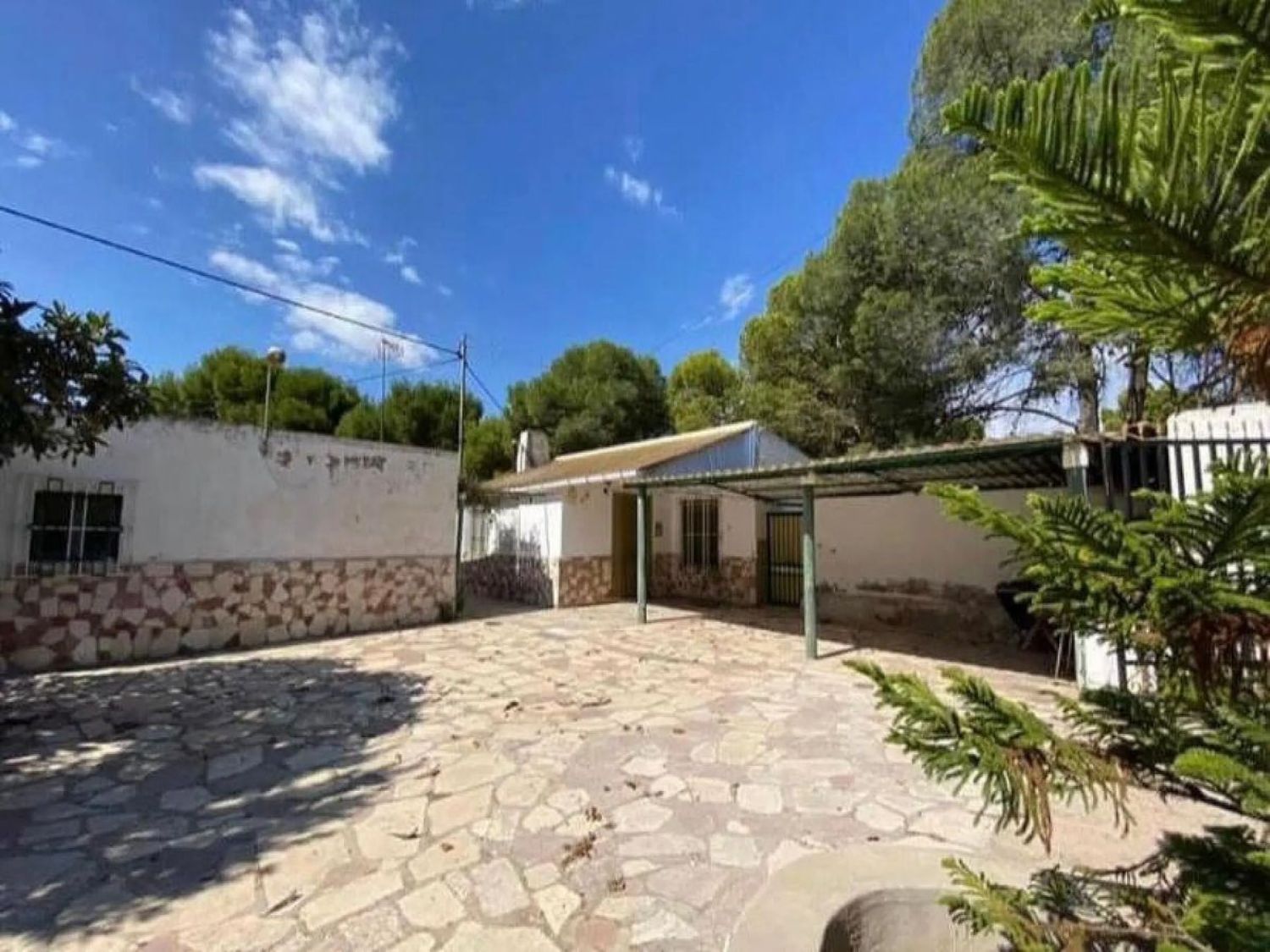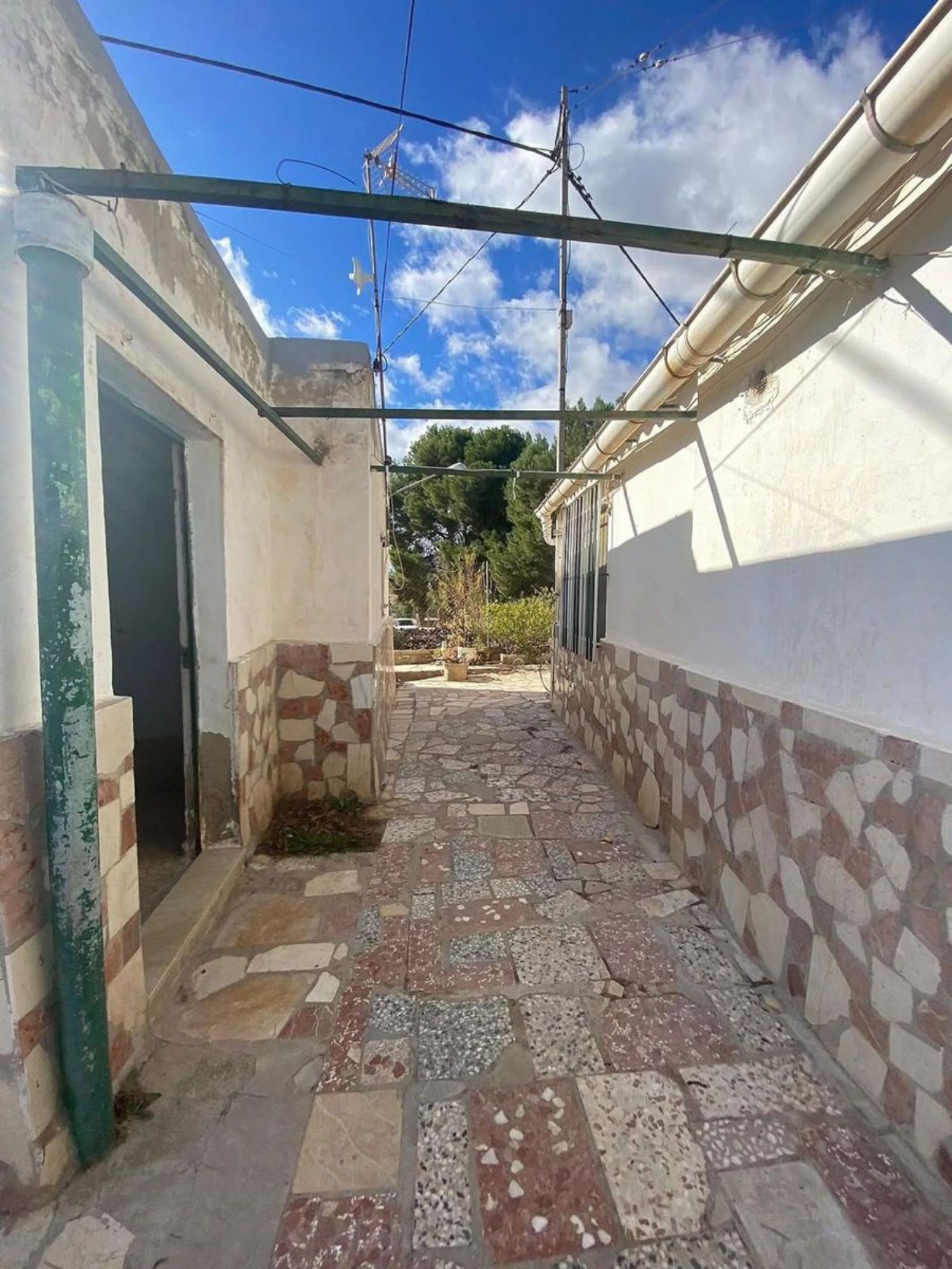 При входе в первую часть участка нас встречает уютный плиточный дворик, обеспечивающий уединение и тень для отдыха. В настоящее время на территории находятся три отдельных здания, которые можно объединить в просторный дом с четырьмя спальнями. Первое здание включает в себя гостиную с кухонным уголком, две двойные спальни и одну комнату, нуждающуюся в ремонте для превращения в ванную комнату.
