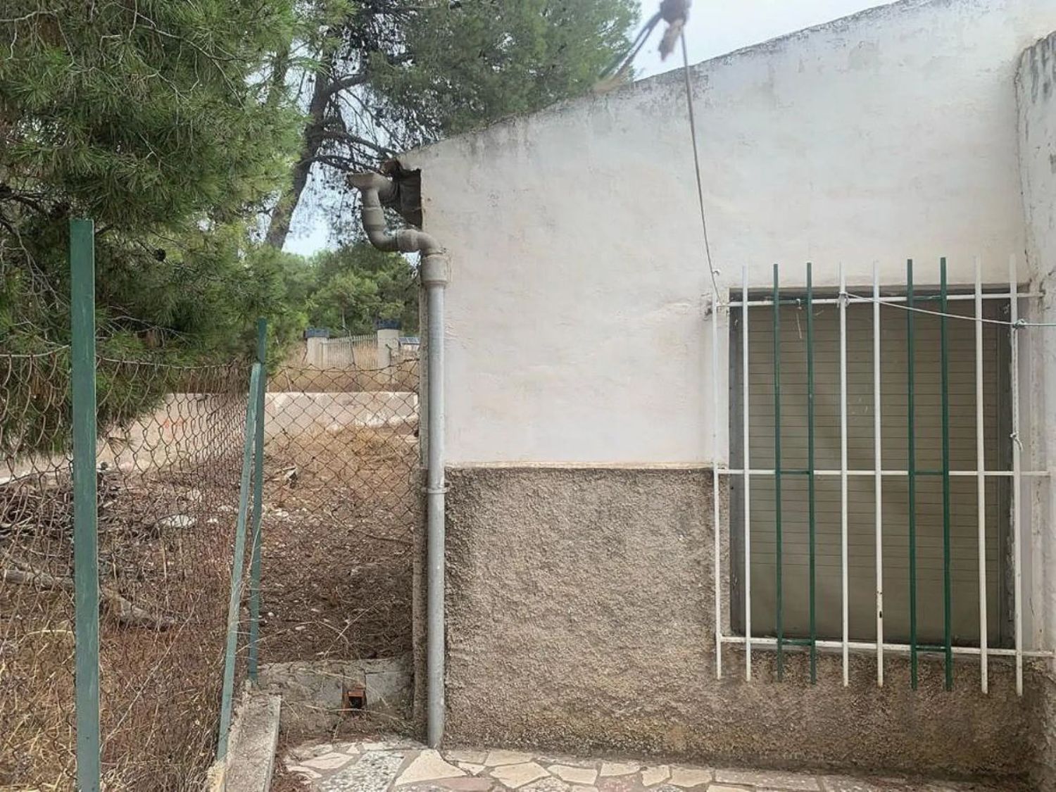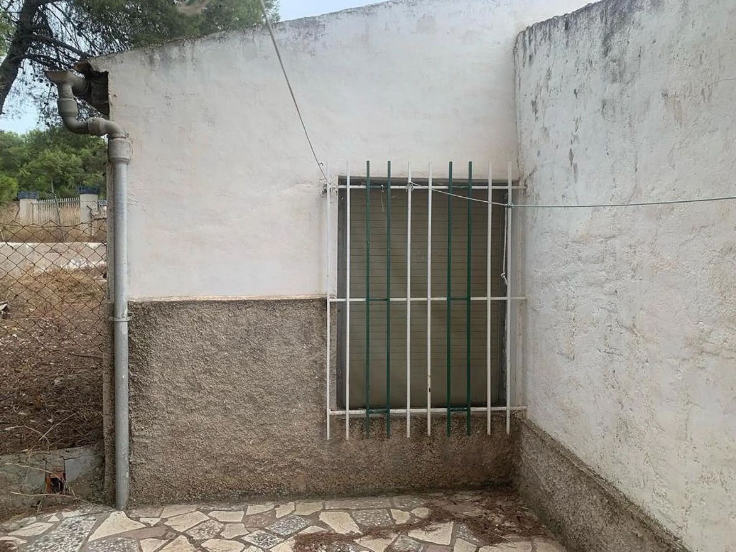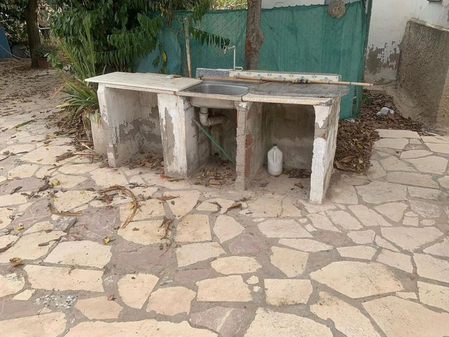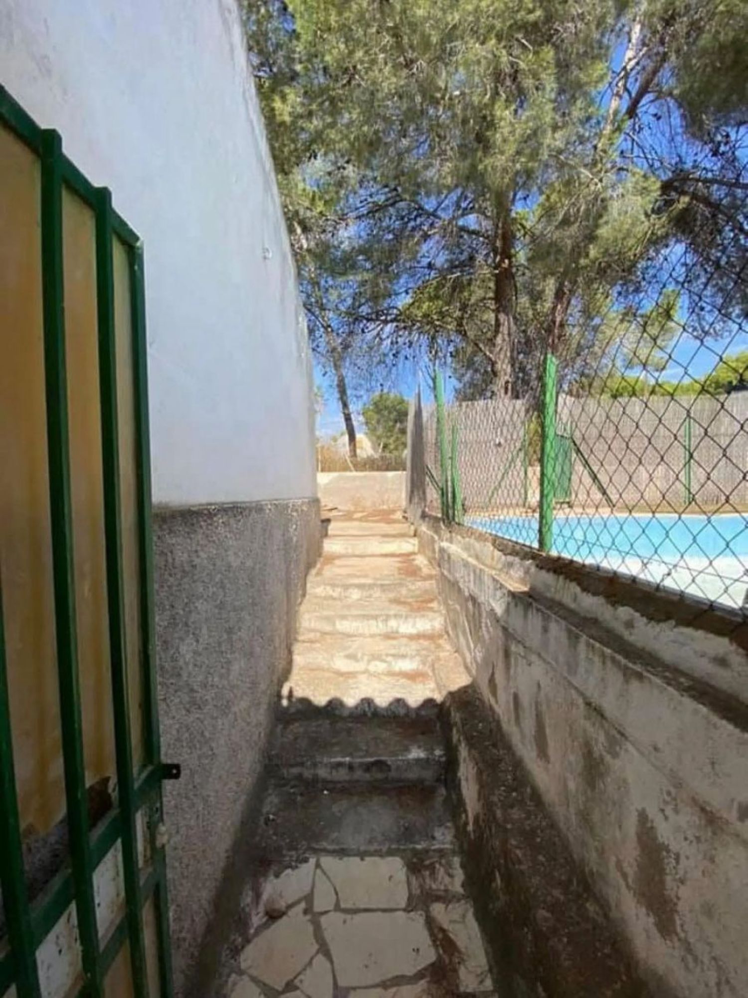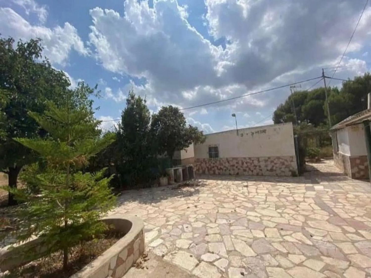 При входе в первую часть участка нас встречает уютный плиточный дворик, обеспечивающий уединение и тень для отдыха. В настоящее время на территории находятся три отдельных здания, которые можно объединить в просторный дом с четырьмя спальнями. Первое здание включает в себя гостиную с кухонным уголком, две двойные спальни и одну комнату, нуждающуюся в ремонте для превращения в ванную комнату.