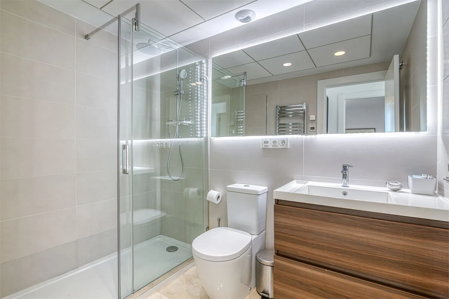 Ванная комната на этом этаже включает душ, туалет, раковину, систему подогрева пола, полотенцесушитель и стильную плитку, создающую расслабляющую и функциональную атмосферу. Главная спальня на верхнем уровне предлагает отдельную ванную комнату с душем, туалетом, двойной раковиной, подогревом пола, полотенцесушителем и красивой плиткой, обеспечивая максимальный комфорт и элегантность. Также на верхнем этаже находится просторная открытая терраса, доступная с лестницы и спальни, с которой открывается потрясающий вид на море, что делает это место идеальным для отдыха и развлечений.