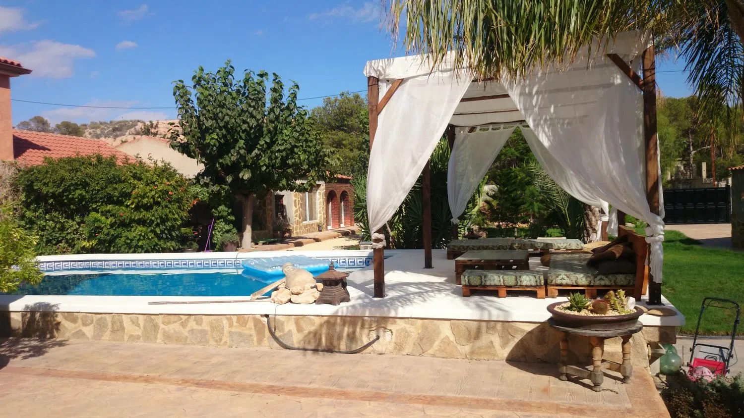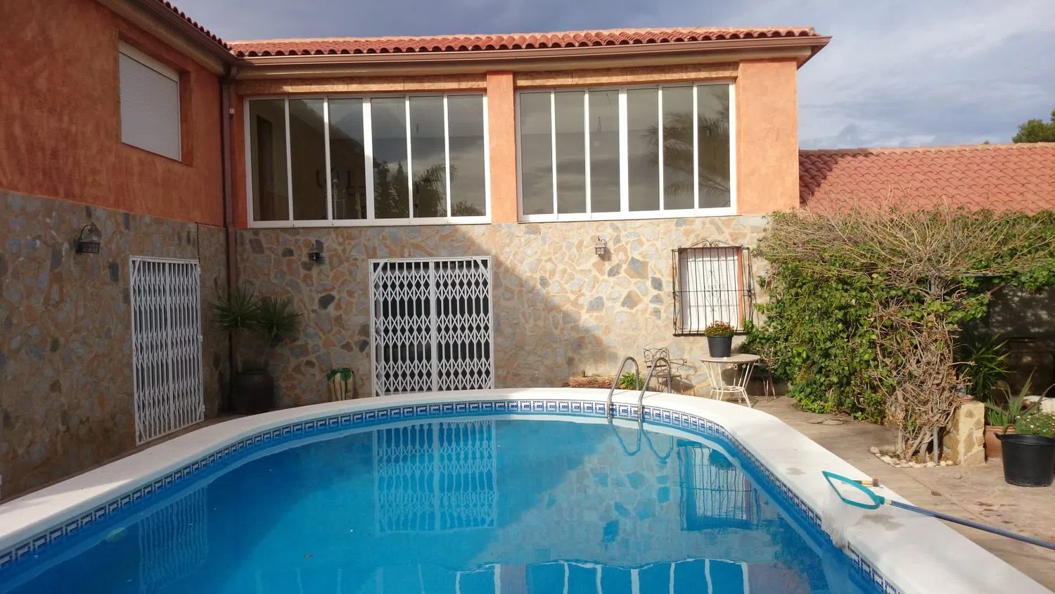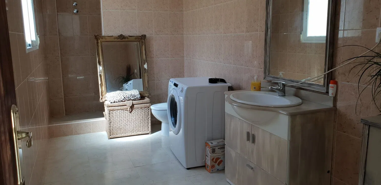 Просторный дом с бассейном и гостевой квартирой в живописном районе, готовый к заселению. Главный дом имеет две этажи, а гостевая квартира расположена на одном уровне. Здесь находятся восемь очень просторных спален, все с двуспальными кроватями, а также пять ванных комнат. В главной спальне предусмотрена зона для гардероба и отдельный шкаф, в то время как остальные спальни оборудованы встроенными шкафами.