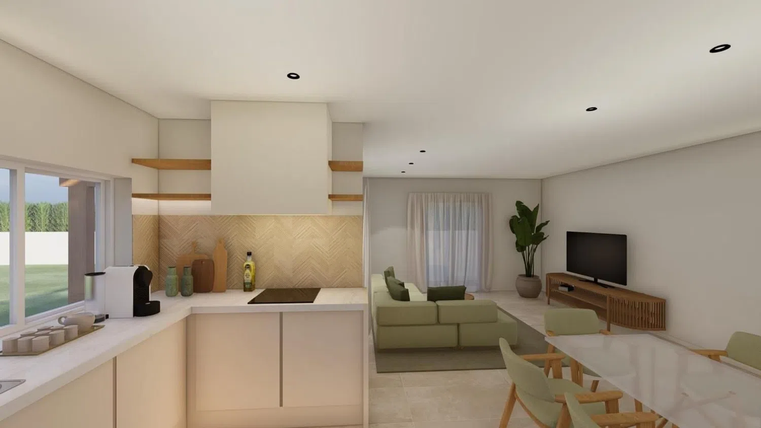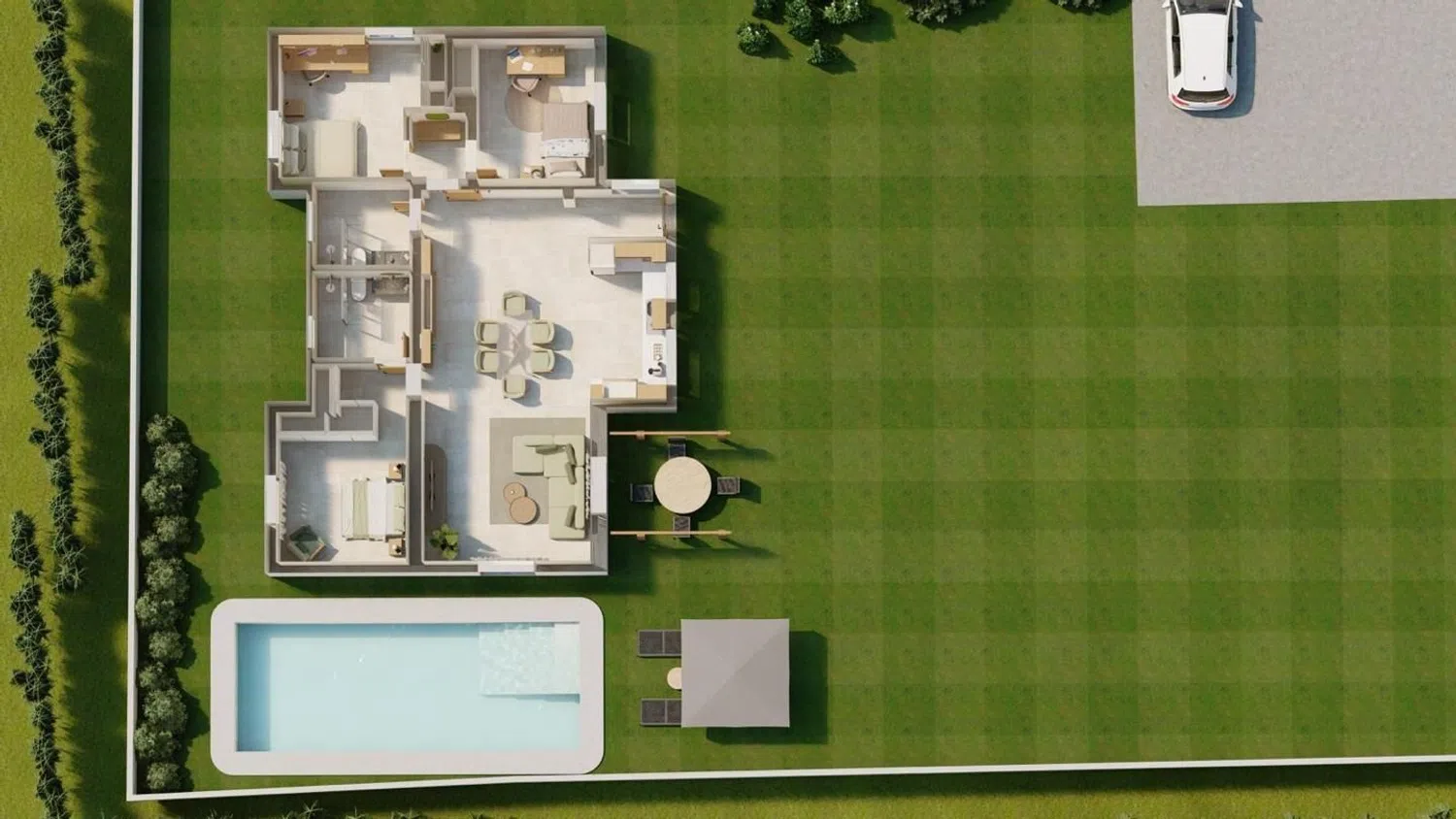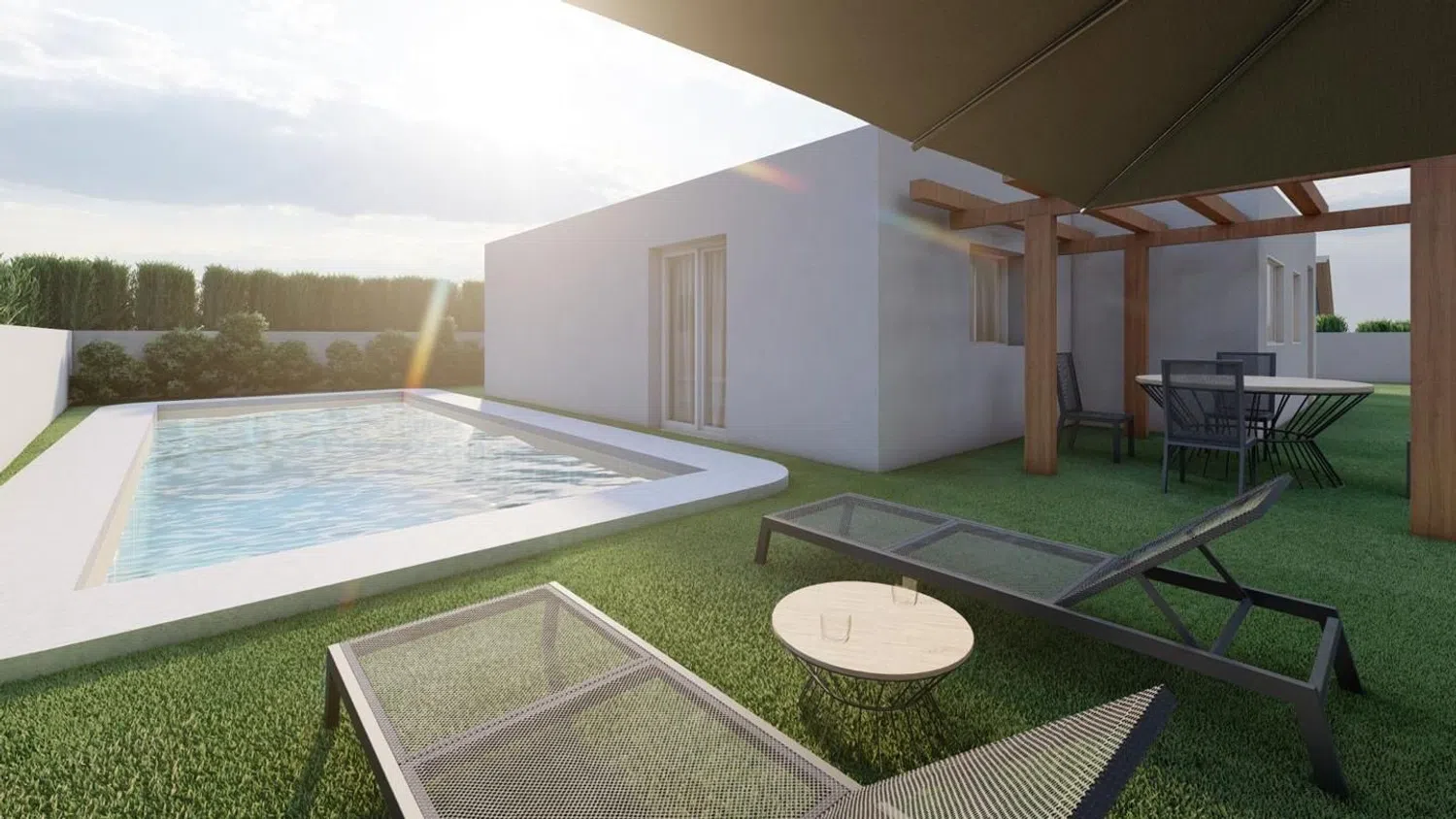 На территории есть частный бассейн с уютным боковым патем, а также зона для барбекю и пергола в саду. Внутри дома размещена современная кухня с антицарапинными фасадами, а в ванных - душевые кабины. В качестве дополнительного удобства предусмотрена возможность установки камина.