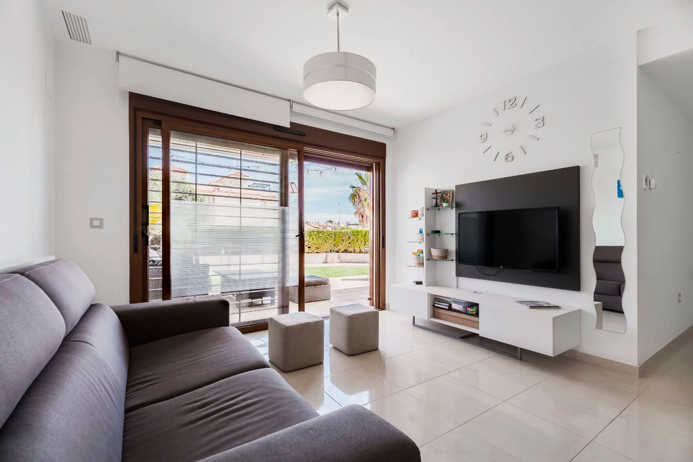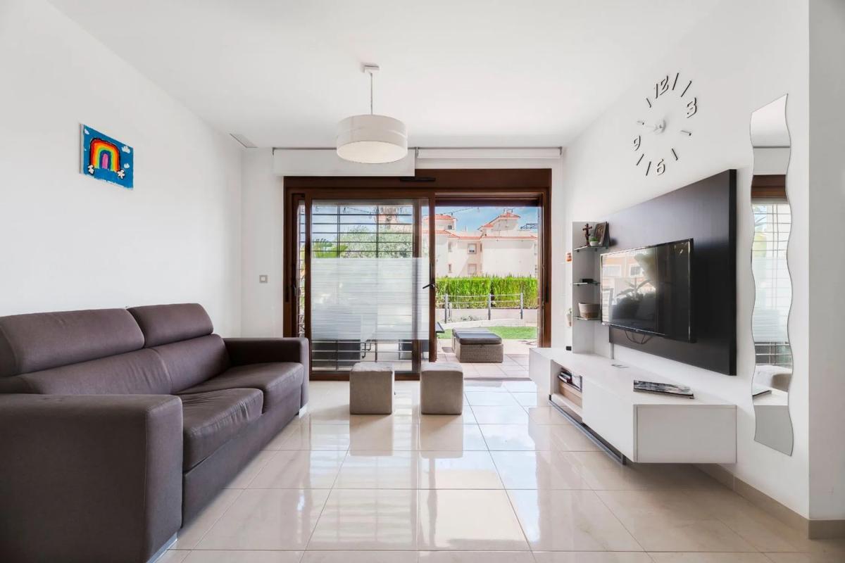 Costa Blanca Eiendom presenta este atractivo apartamento en planta baja, ubicado en el prestigioso residencial Secreto de la Zenia, en Orihuela Costa. Esta propiedad ofrece una combinación ideal de confort, diseño contemporáneo y ubicación. El apartamento cuenta con una luminosa y espaciosa sala de estar, decorada con un estilo moderno y equipada con aire acondicionado para garantizar el máximo confort durante todo el año. La vivienda dispone de tres dormitorios: el principal con cama doble y baño en suite, un segundo dormitorio con dos camas individuales, y un tercer dormitorio versátil ideal como oficina o habitación adicional. Todos los dormitorios están equipados con armarios empotrados. Además, la vivienda incluye un segundo baño completo, perfectamente equipado. La cocina, de estilo abierto, está completamente equipada con electrodomésticos de alta gama: lavavajillas, horno, vitrocerámica, campana extractora y frigorífico, todo en excelente estado de conservación. La estancia se complementa con mobiliario moderno y funcional que aporta practicidad y estilo al conjunto. Uno de los grandes atractivos de este apartamento es su jardín privado de 71 m², un espacio perfecto para disfrutar del sol, organizar barbacoas o simplemente relajarse al aire libre. La urbanización ofrece completas zonas comunes, como una piscina para adultos (12x8 m), dos jacuzzis climatizados, sauna, gimnasio con equipamiento biomecánico, piscina infantil, zona de juegos con tobogán de agua y estacionamiento para bicicletas. El complejo dispone además de aparcamiento comunitario con acceso controlado, lo que proporciona seguridad y tranquilidad. A tan solo unos minutos a pie se encuentran todos los servicios necesarios: supermercados, restaurantes y el centro comercial "La Zenia Boulevard", uno de los más grandes de la provincia de Alicante, con más de 150 tiendas y una extensa oferta gastronómica y de ocio. Ubicada al sur de Torrevieja, en la Costa Blanca Sur, esta zona es una de las más codiciadas de Orihuela Costa. Con playas de arena fina muy populares y un entorno acogedor, es el destino ideal tanto para vacaciones como para residencia habitual. Su amplia variedad de bares, restaurantes y servicios la convierte en una excelente elección para quienes buscan calidad de vida cerca del mar. Póngase en contacto con nosotros para más información, o únase a uno de nuestros tours sin compromiso para visitar esta magnífica propiedad.