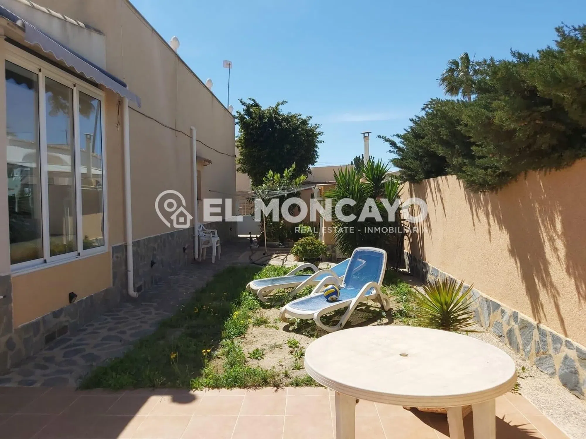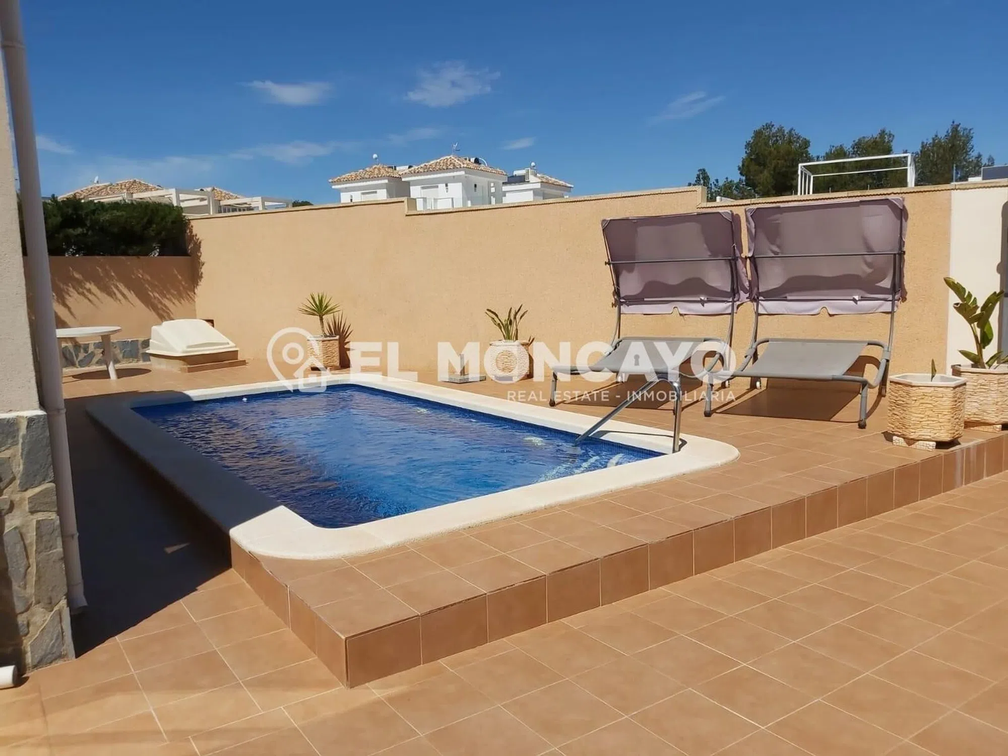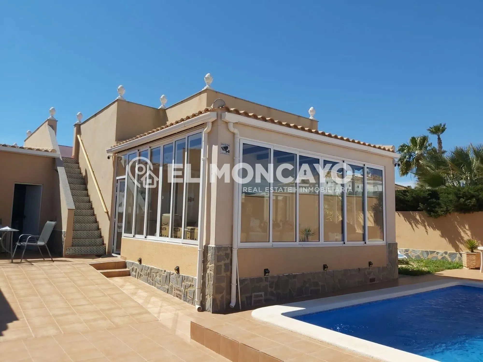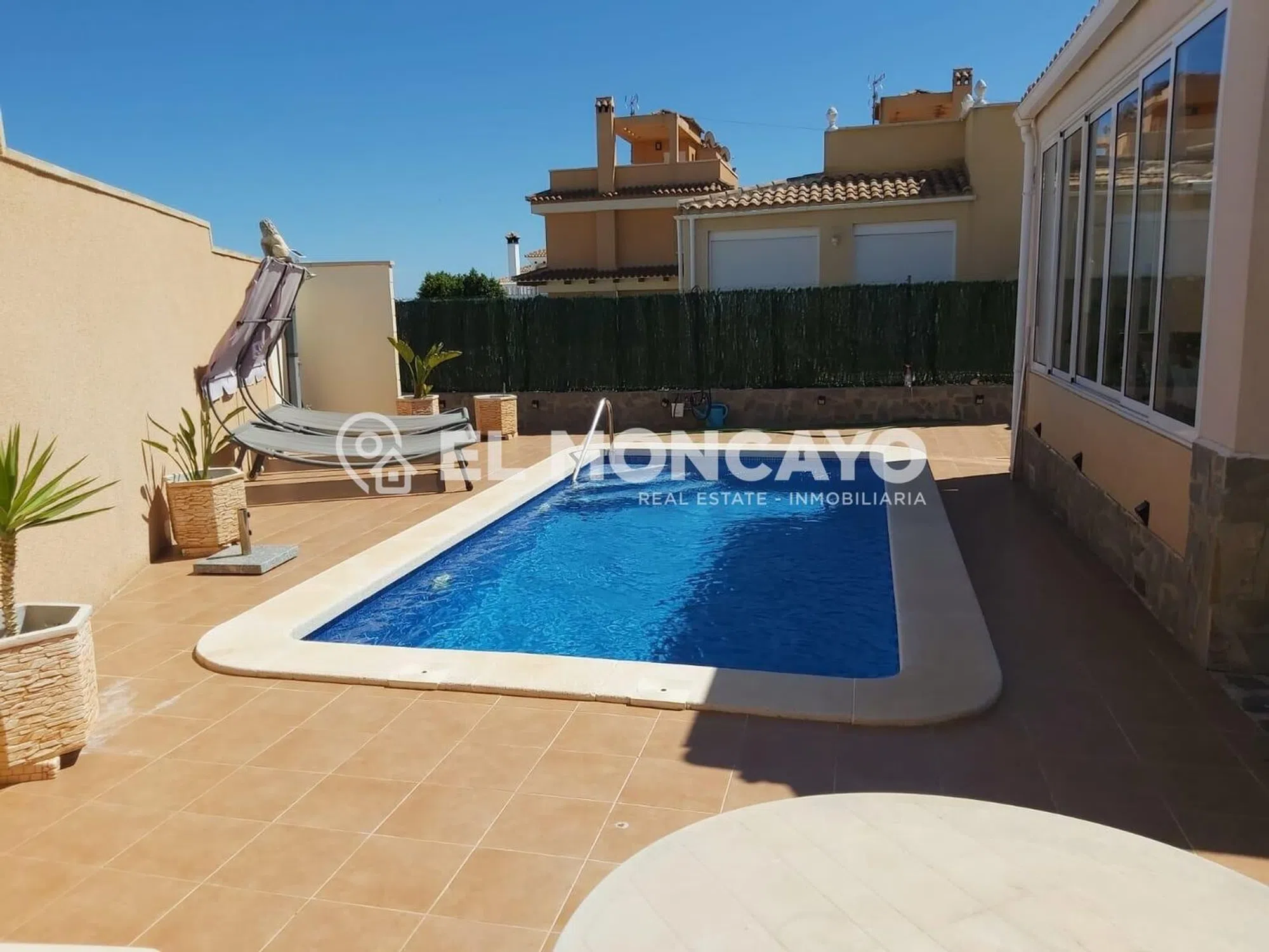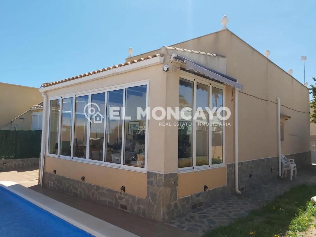 El Moncayo Properties pone a la venta este fantástico chalet independiente en Orihuela Costa. La vivienda cuenta con una amplia parcela con zonas ajardinadas, tres trasteros, piscina privada y zona de aparcamiento. Cuenta con 76m2 y se distribuye en las siguientes dependencias: - Amplio salón comedor con acceso a una terraza acristalada. - Cocina abierta al salón totalmente equipada con electrodomésticos. - Dos dormitorios amplios con armarios empotrados. - Dos baños completos, uno cuenta con bañera, inodoro y lavabo y el segundo tiene plato de ducha, lavabo e inodoro. La vivienda cuenta además con un amplio solárium con maravillosas vistas al paisaje y al mar al que accedemos mediante escalera exterior. Ubicada a tan solo 3km de las playas de La Zenia, en Orihuela Costa, rodeada de todos los servicios principales de la zona, a tan solo 10 minutos del centro comercial La Zenia Boulevard y del campo de golf Las Ramblas golf. Llámanos y ven a visitarlo!