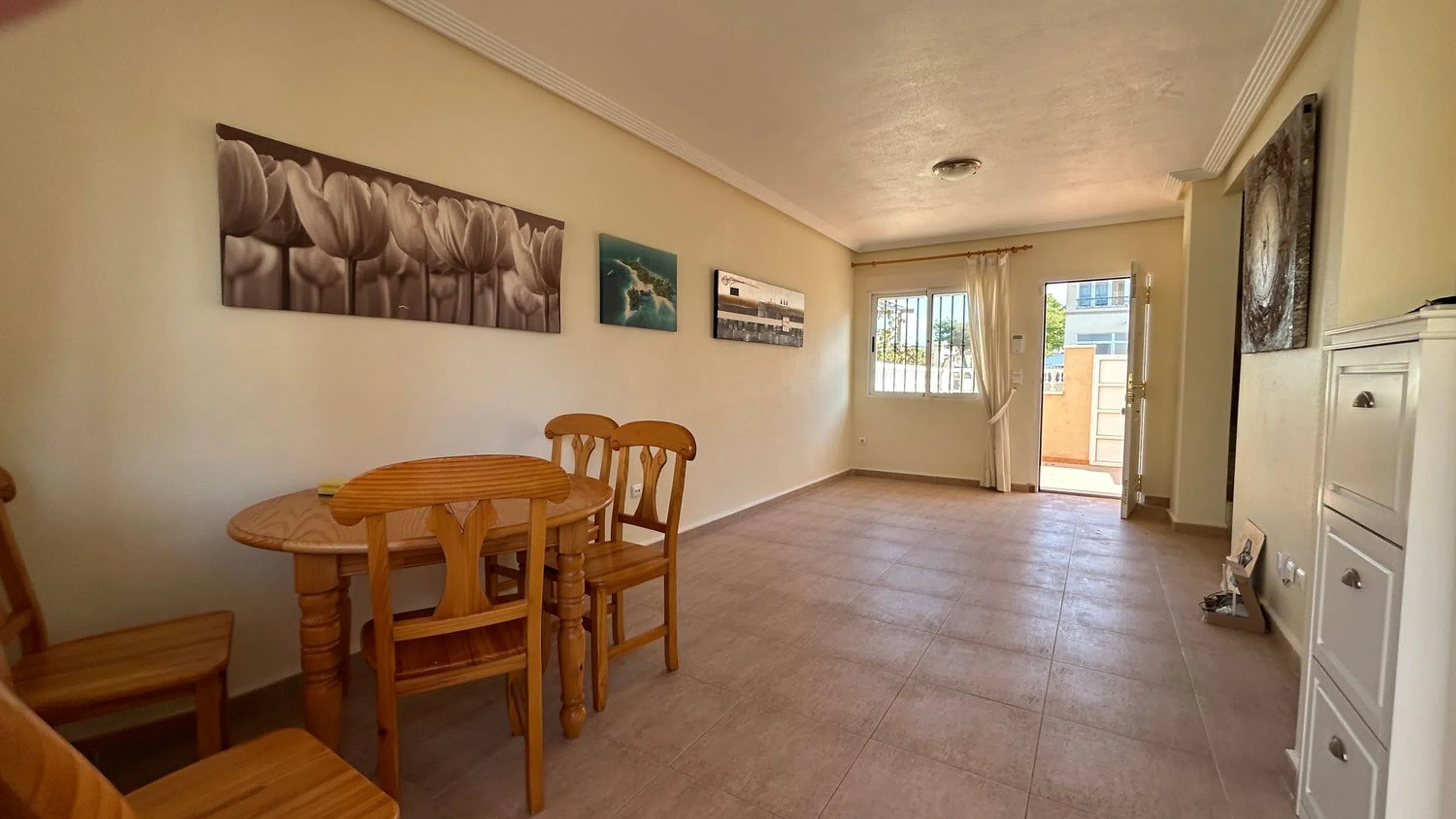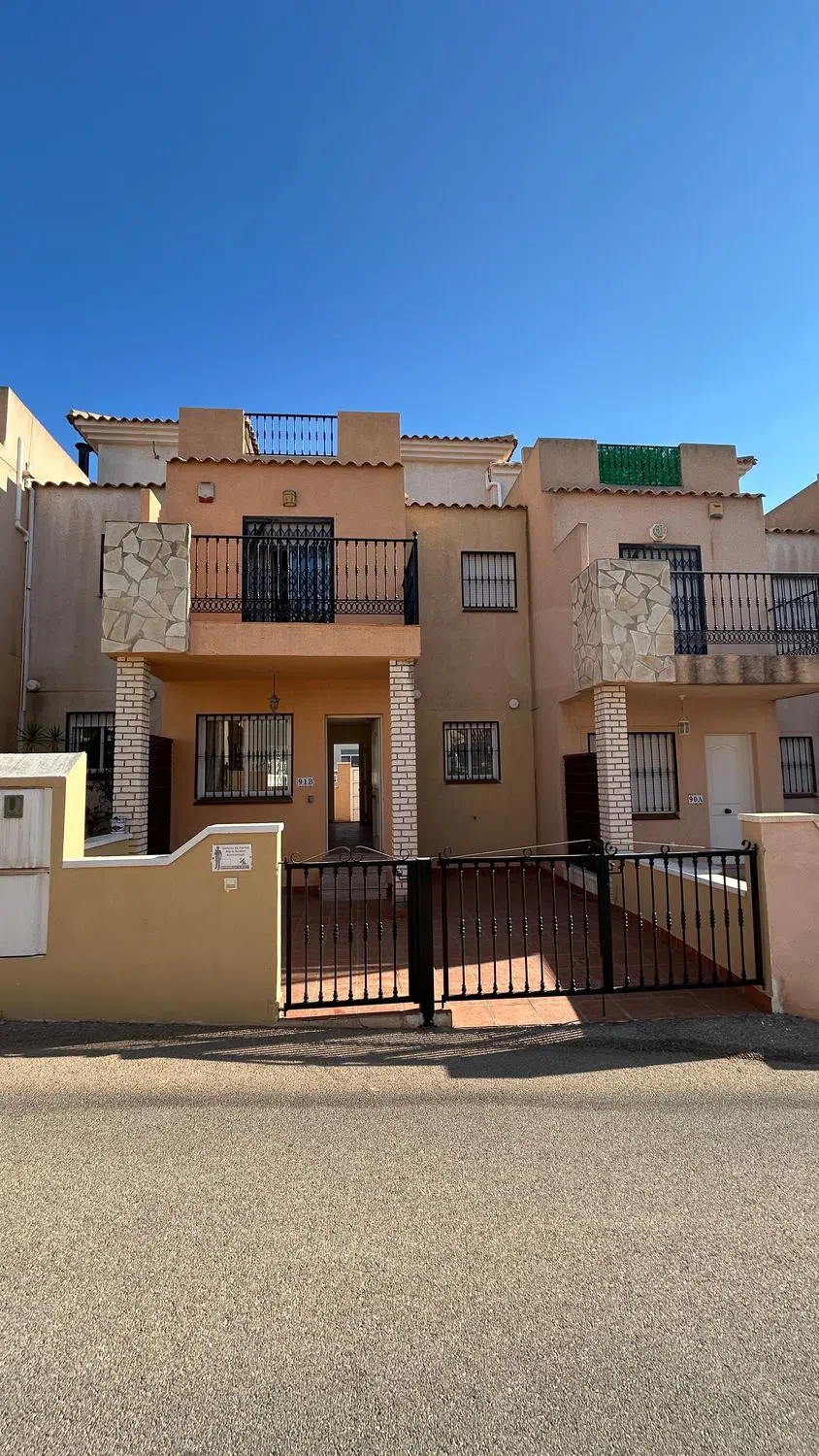 En la soleada comunidad cerrada de Royal Park, en Los Altos, se encuentra este fantástico adosado orientado al sur, una propiedad que combina comodidad, ubicación y estilo mediterráneo. Consta de dos dormitorios, un baño completo y un aseo, además de dos patios y dos terrazas, lo que permite disfrutar del clima en cada rincón del hogar. A tan solo unos pasos de supermercados, comercios y a poca distancia de la playa, su situación es inmejorable para quienes buscan calidad de vida y fácil acceso a todos los servicios. Al entrar por el patio orientado al suroeste, se accede a una luminosa y acogedora sala de estar que se abre hacia un segundo patio, esta vez orientado al noreste, ideal para cenas al aire libre. La cocina, de estilo abierto, está completamente equipada y dispone de una práctica ventana que aporta luz natural. En esta planta baja también hay un aseo para invitados, pensado para mayor comodidad. En la planta superior se ubican los dos dormitorios, junto a un baño completo. Uno de los dormitorios cuenta con una terraza privada orientada al sur desde donde se puede contemplar el mar, un lugar perfecto para comenzar el día con tranquilidad. Subiendo un nivel más, se accede al solárium privado en la azotea, desde donde las vistas al mar se extienden hasta donde alcanza la vista, un rincón exclusivo para relajarse o tomar el sol con total privacidad. La vivienda está equipada con aire acondicionado frío/calor y se vende sin amueblar, lo que permite decorarla al gusto del nuevo propietario. La comunidad ofrece además una preciosa piscina comunitaria, ideal para refrescarse en los meses más cálidos. Los Altos es una zona excelente tanto para vacaciones como para residencia permanente, con todo lo necesario a mano: centros comerciales, supermercados, bancos, clínicas dentales y mucho más, todo bien comunicado mediante un servicio de autobús regular. Las playas de Punta Prima, situadas a solo cinco o siete minutos en coche, son reconocidas por su limpieza y galardonadas con la Bandera Azul, además de estar bordeadas por un encantador paseo marítimo repleto de tiendas, boutiques, bares y restaurantes. Con un clima mediterráneo que ofrece más de 320 días de sol al año, esta propiedad representa una magnífica oportunidad para disfrutar del estilo de vida del sur de la Costa Blanca.