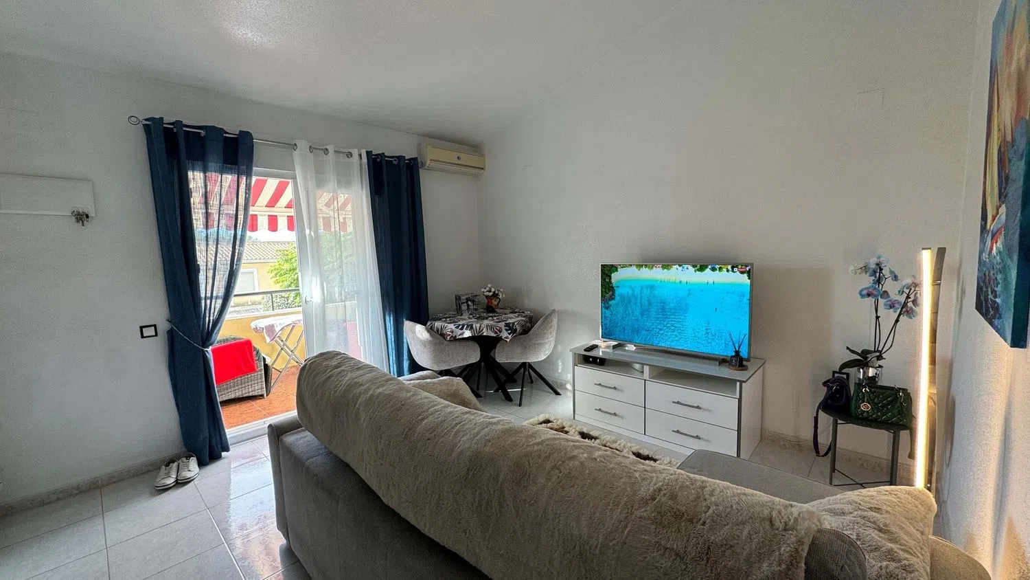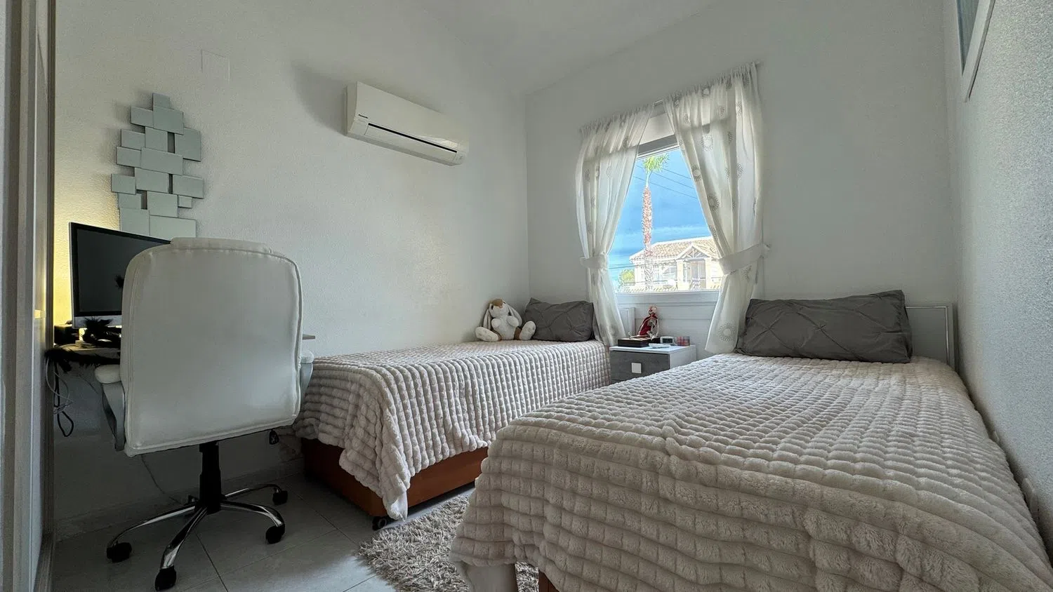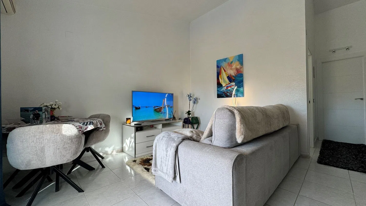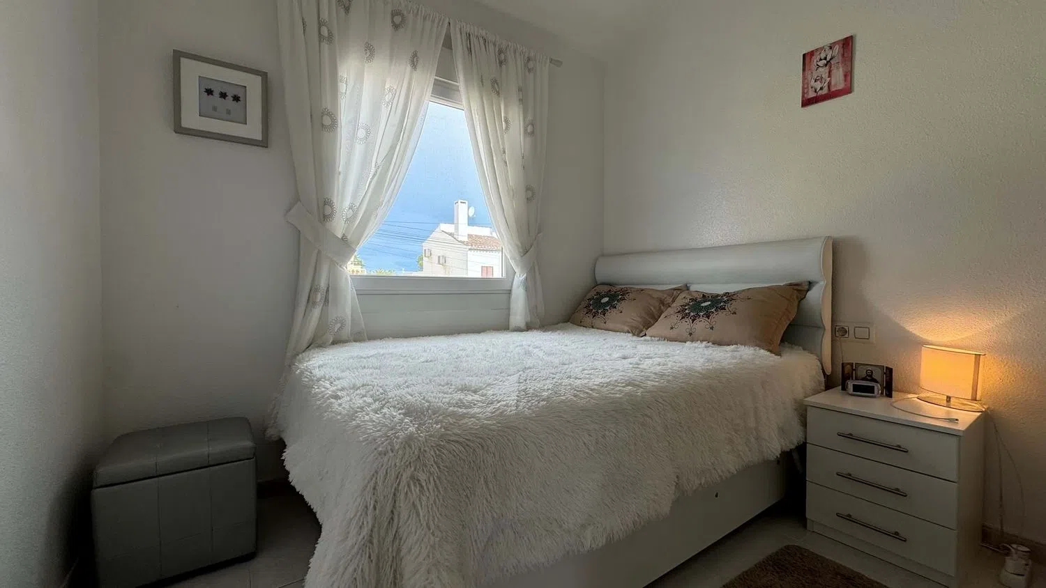Внутри недвижимости находится светлая гостиная, столовая и кухня открытого типа с системой кондиционирования. Кухня была недавно обновлена и оснащена всеми необходимыми современными бытовыми приборами. Здесь располагаются две спальни с двуспальными кроватями, обе с встроенными шкафами. Ванная комната оборудована душевой кабиной без порога и также была обновлена.