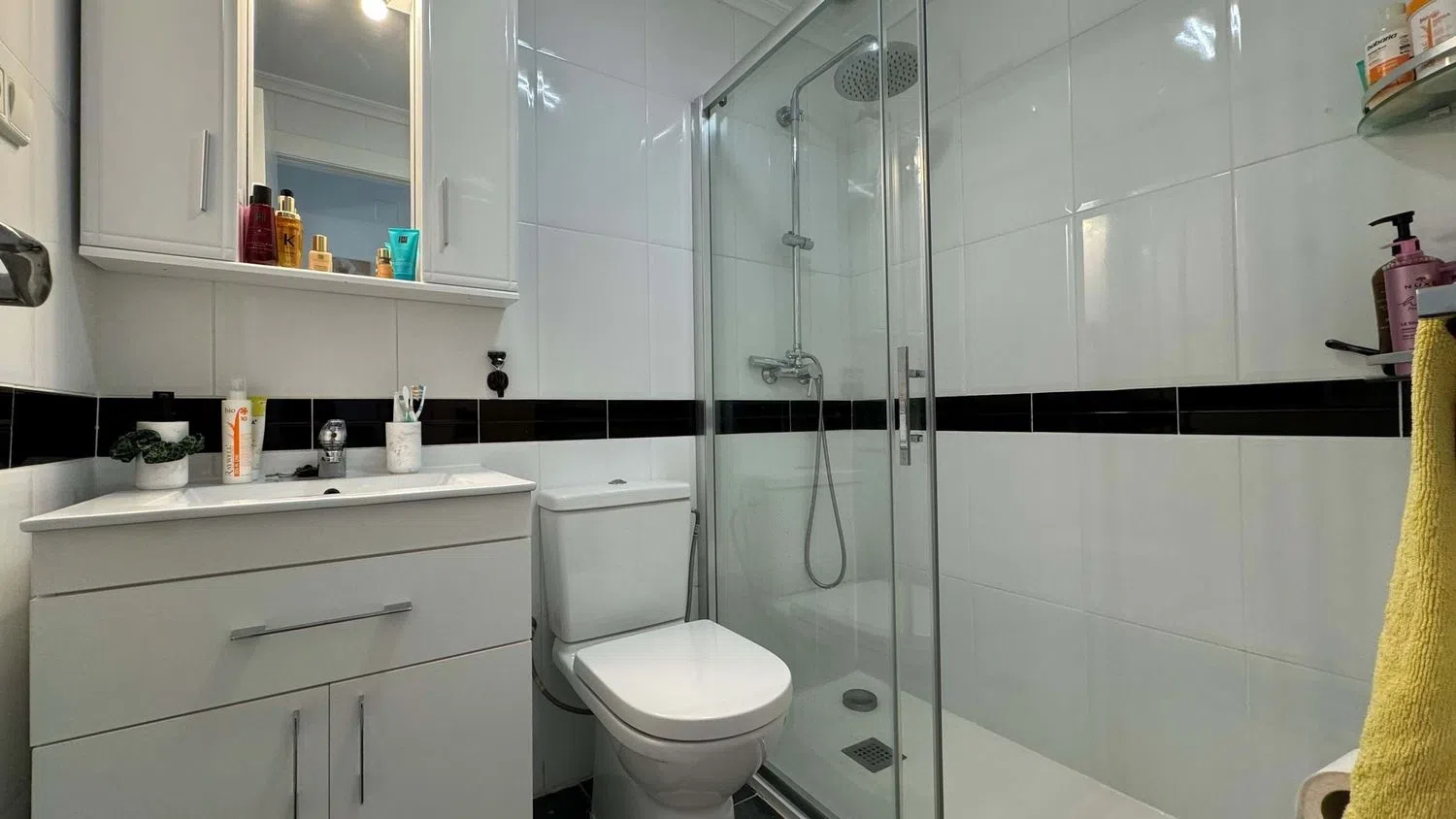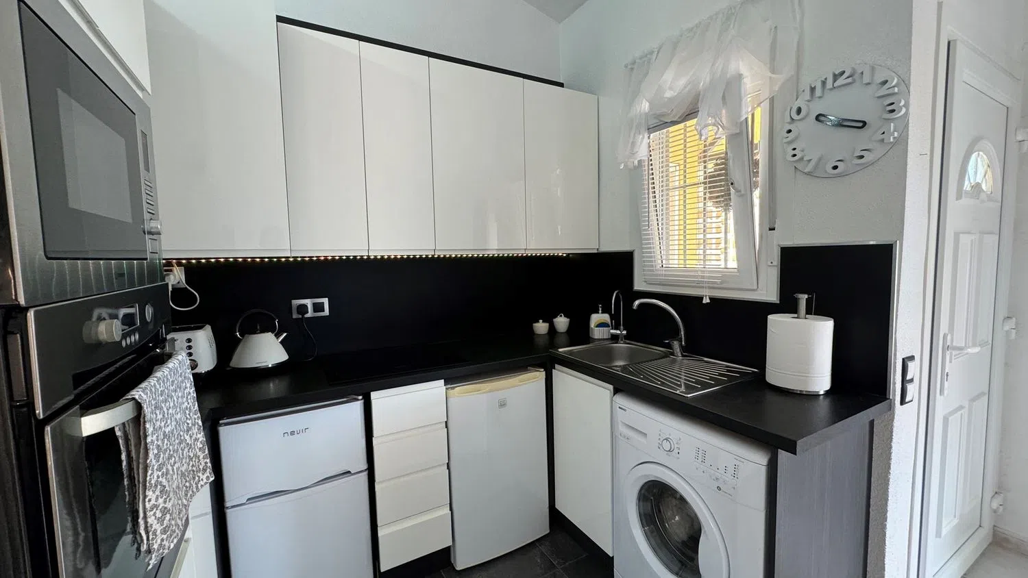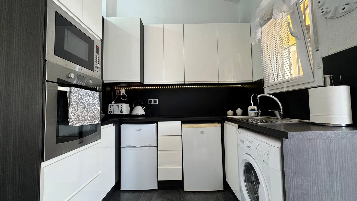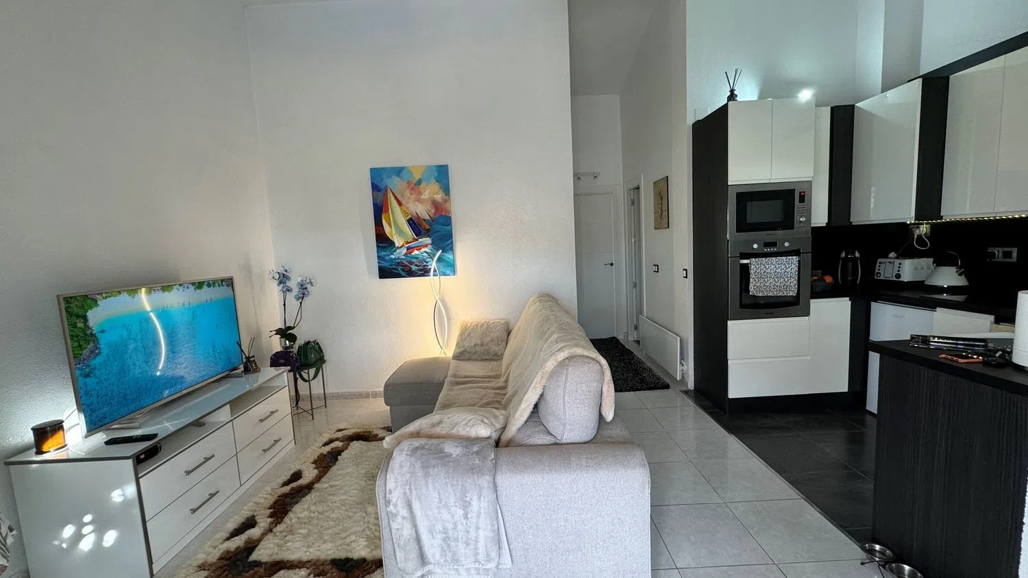 Внутри недвижимости находится светлая гостиная, столовая и кухня открытого типа с системой кондиционирования. Кухня была недавно обновлена и оснащена всеми необходимыми современными бытовыми приборами. Здесь располагаются две спальни с двуспальными кроватями, обе с встроенными шкафами. Ванная комната оборудована душевой кабиной без порога и также была обновлена.