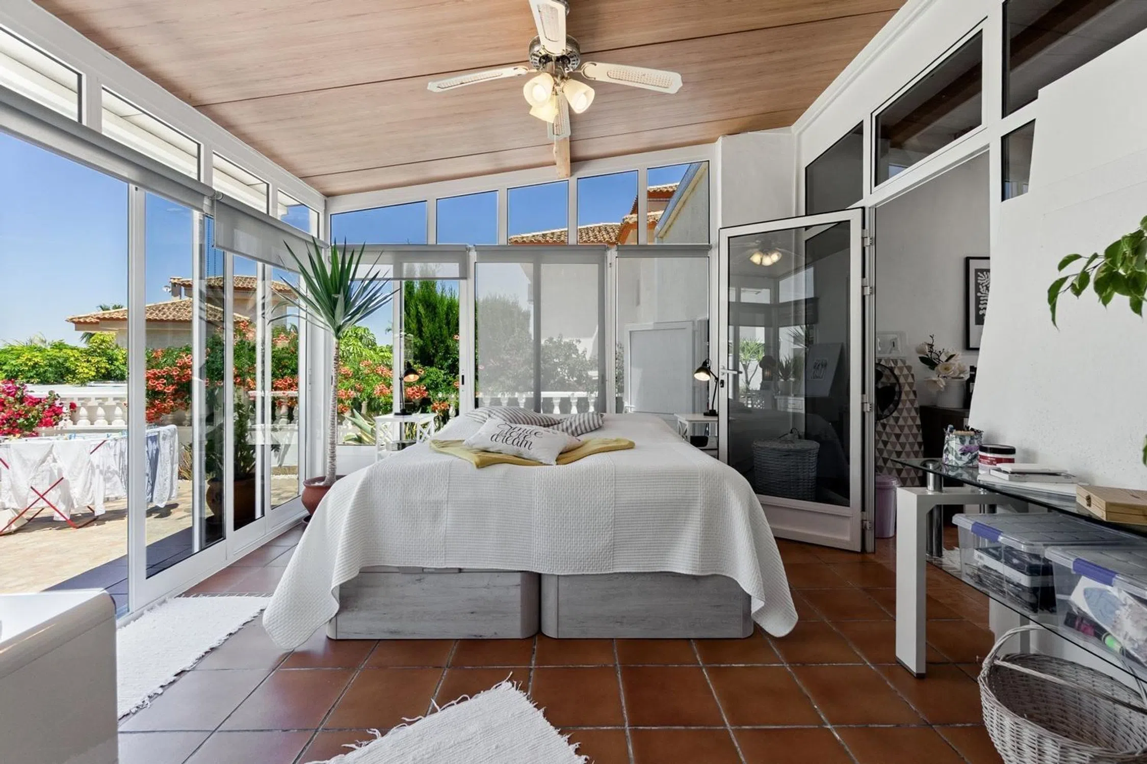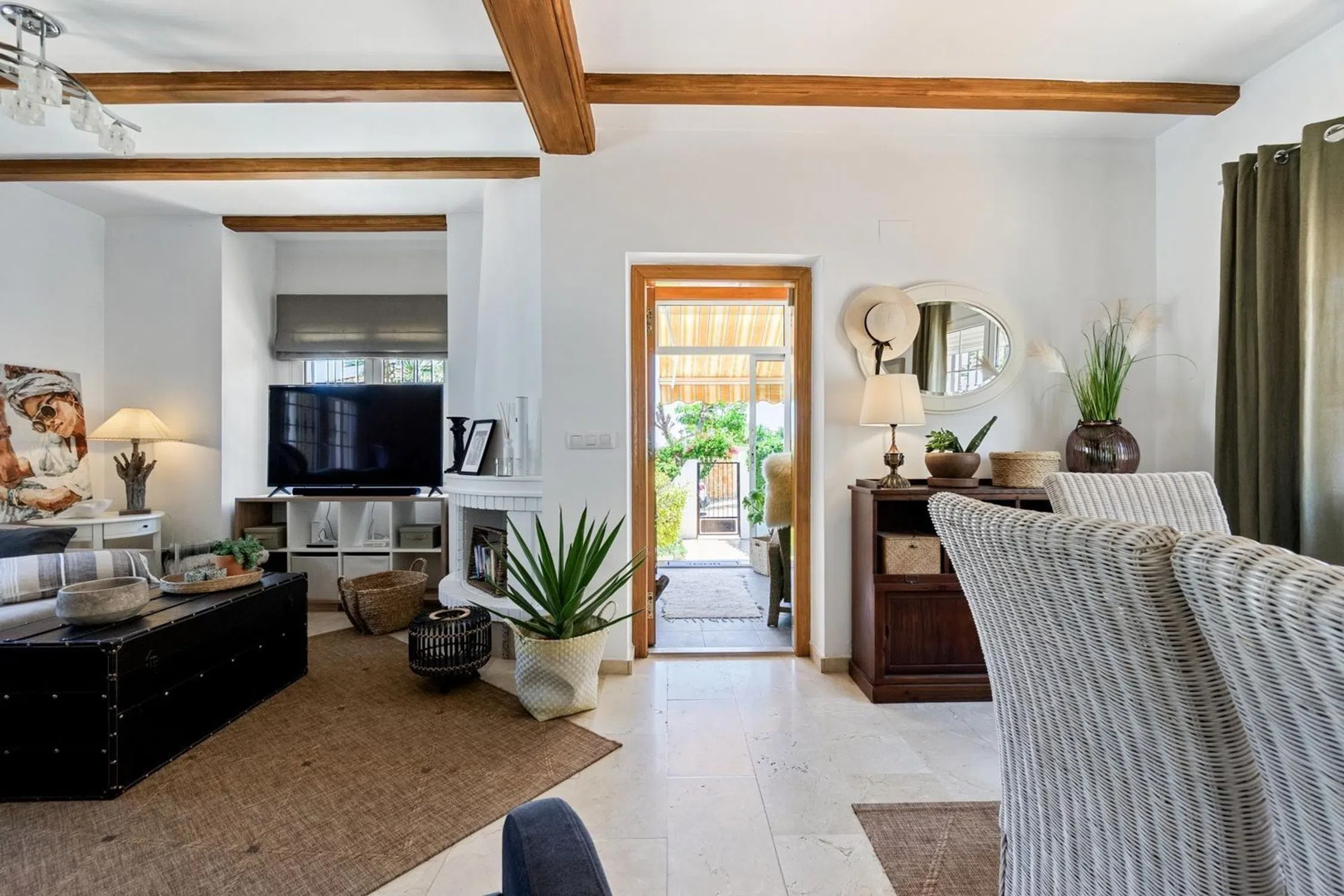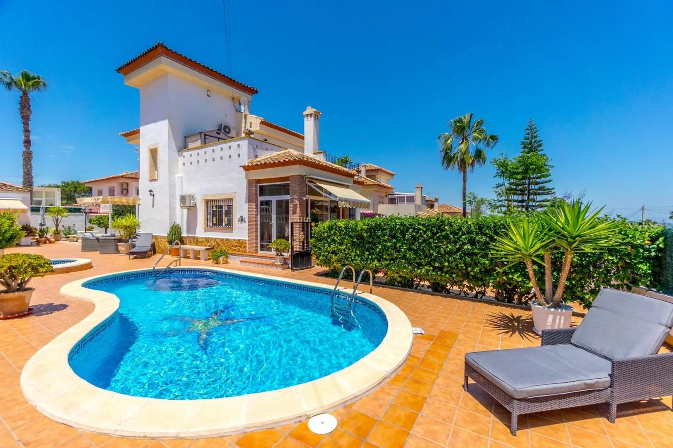 ¡Descubre este encantador chalet independiente con espacios exteriores de ensueño para disfrutar todo el año! Te presentamos esta preciosa vivienda situada en una zona tranquila, con un clima excelente que permite aprovechar sus maravillosos espacios exteriores los 365 días del año. Ideal para vivir de forma permanente, disfrutar largas temporadas o como residencia vacacional. Distribuida en dos plantas conectadas por escalera interior, la casa te recibe con una acogedora terraza acristalada que da paso a un amplio salón con chimenea, perfecto para reuniones familiares. La moderna cocina americana, totalmente reformada y equipada con electrodomésticos, se integra al salón en un ambiente cómodo y funcional. En la planta baja encontrarás también una gran galería/lavandería con salida al jardín, dos habitaciones (una con baño en suite renovado), y la otra acristalada con acceso directo al jardín y un aseo de cortesía. En la planta superior se ubican dos dormitorios adicionales, un baño completo renovado y un espectacular solárium con zona chill-out, desde donde se pueden disfrutar vistas abiertas al mar y a la laguna. La vivienda dispone de aire acondicionado en todas las estancias, calefacción central y sistema de ósmosis en la cocina, lo que asegura confort en cualquier época del año. Pero lo que realmente enamora de esta casa son sus espacios exteriores. Un precioso jardín que rodea toda la vivienda, con árboles frutales, plantas y rincones llenos de encanto. Destaca su piscina privada, perfecta para refrescarse en verano, una terraza techada con cocina de verano y barbacoa para disfrutar de comidas al aire libre y, como toque especial, un rincón de descanso con pérgola y toldo, ideal para leer, relajarse o compartir un café en cualquier momento del día. La propiedad también cuenta con una cochera cerrada con portón eléctrico y espacio adicional para aparcar otro vehículo. Si buscas calidad de vida, tranquilidad y disfrutar del exterior durante todo el año, esta casa es para ti. ¡Ven a visitarla y déjate enamorar por su encanto!