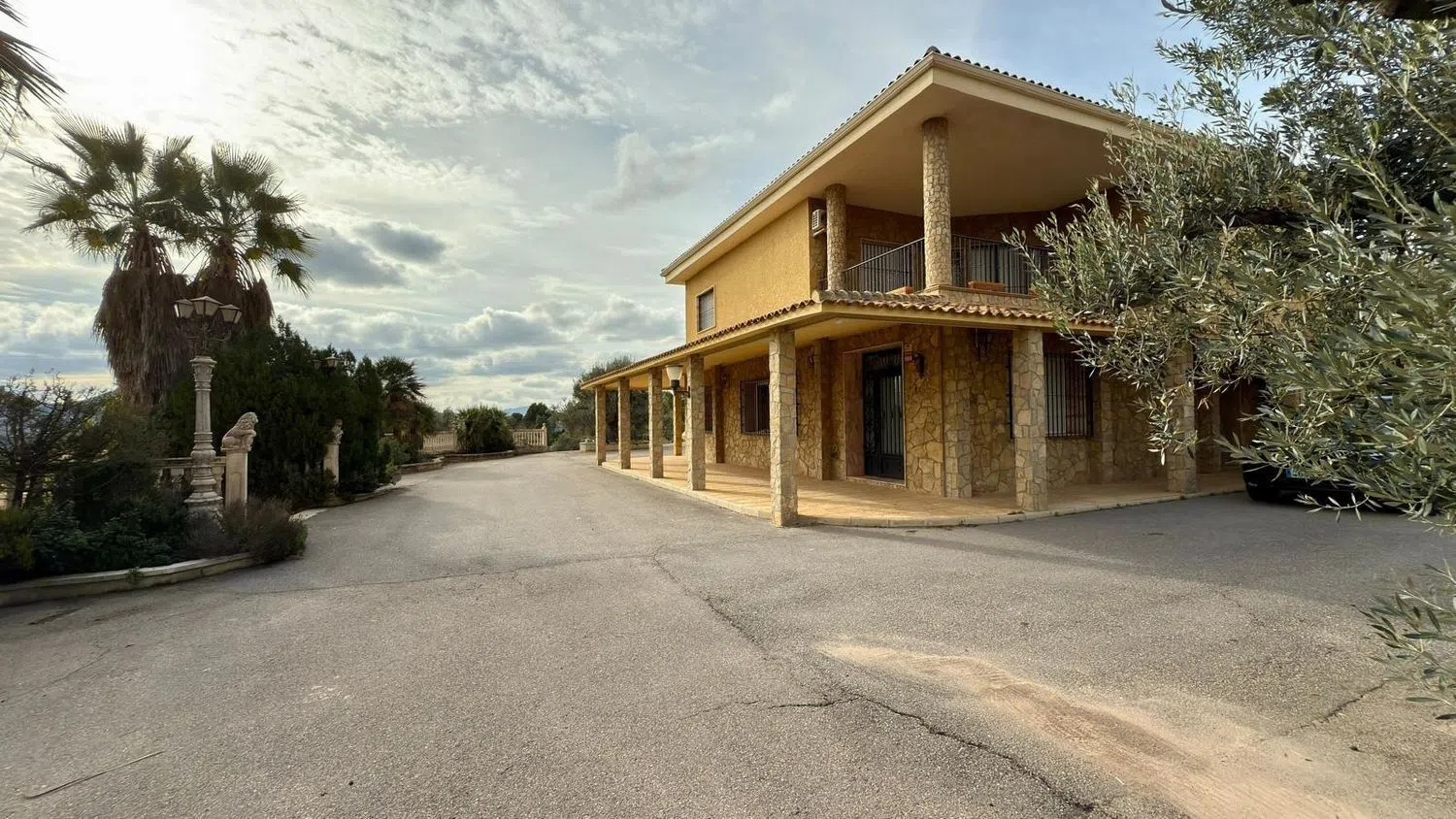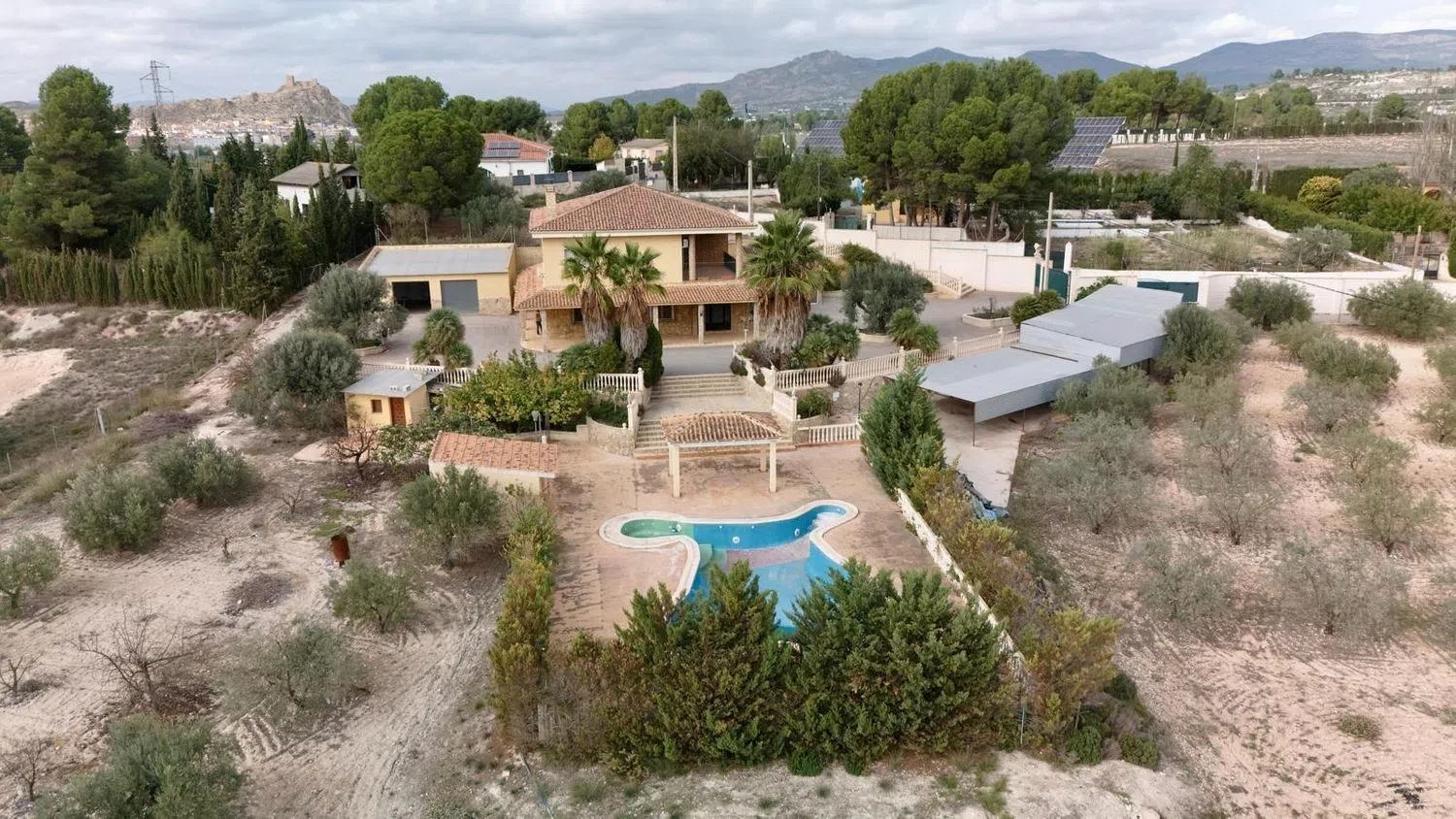 Участок окружен зеленью, включая оливковые и миндальные деревья, а также ухоженные сады с пальмами. Территория ограждена каменной стеной высотой более 2 метров, обеспечивая высокую степень приватности и безопасности. К собственности ведет асфальтированный путь. Не упустите шанс, запрашивайте посещение без обязательств — это уникальное предложение, которое не стоит пропускать!