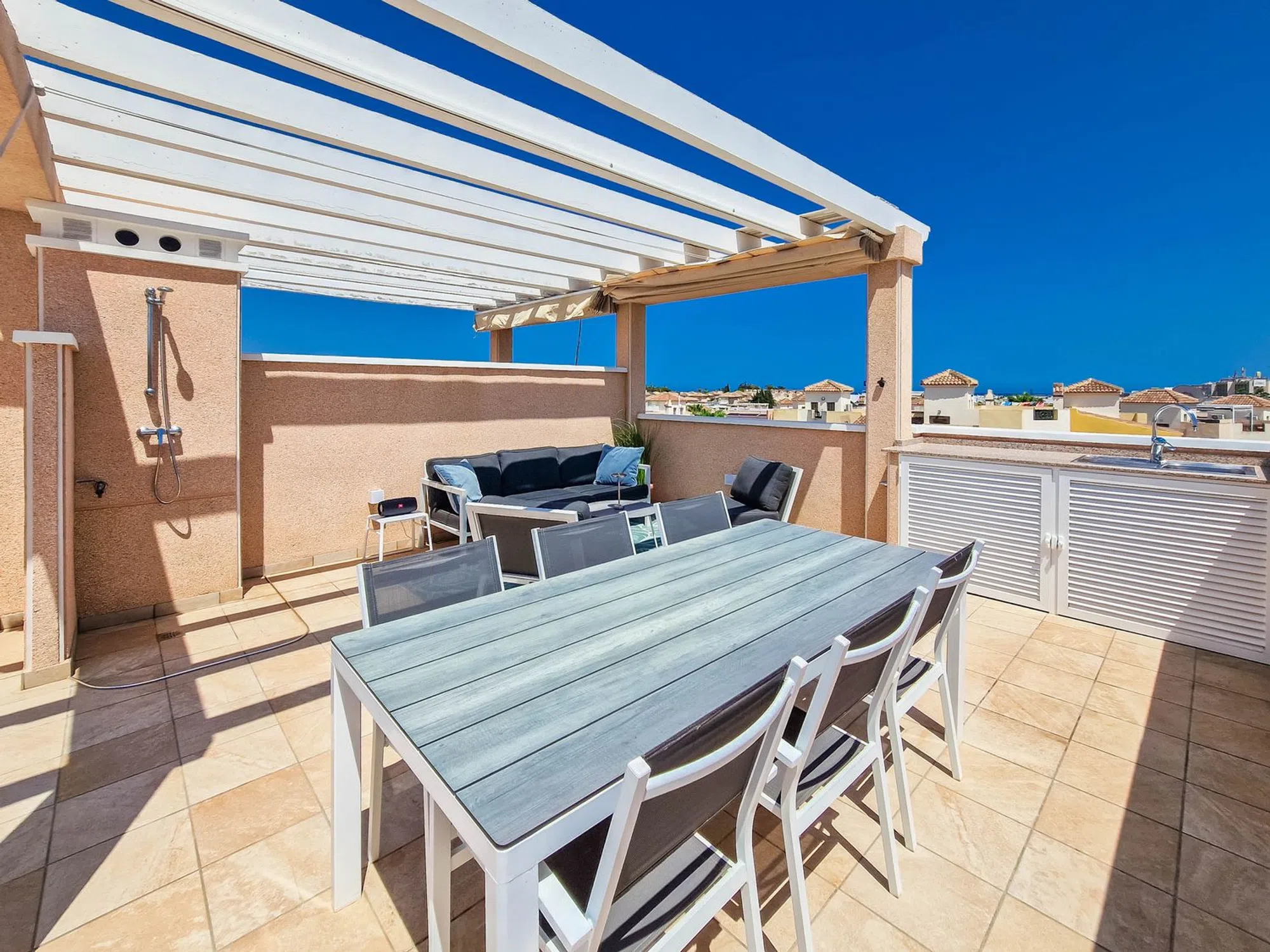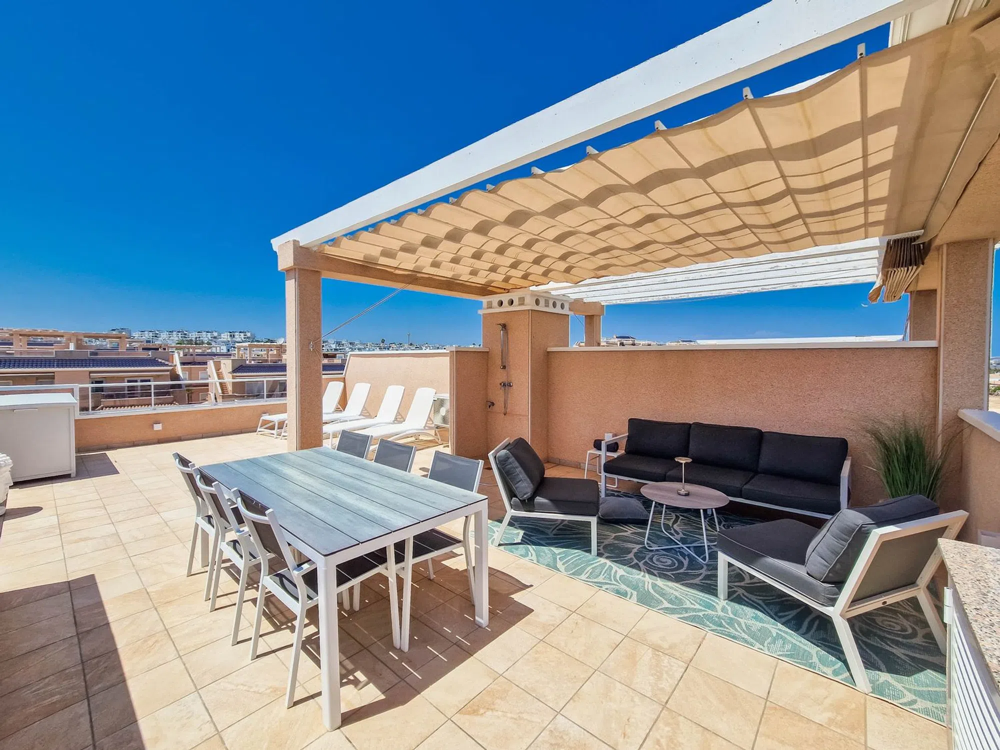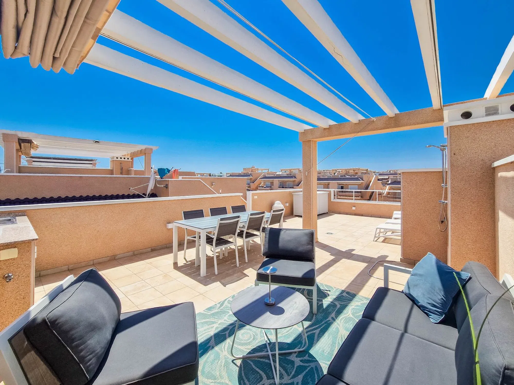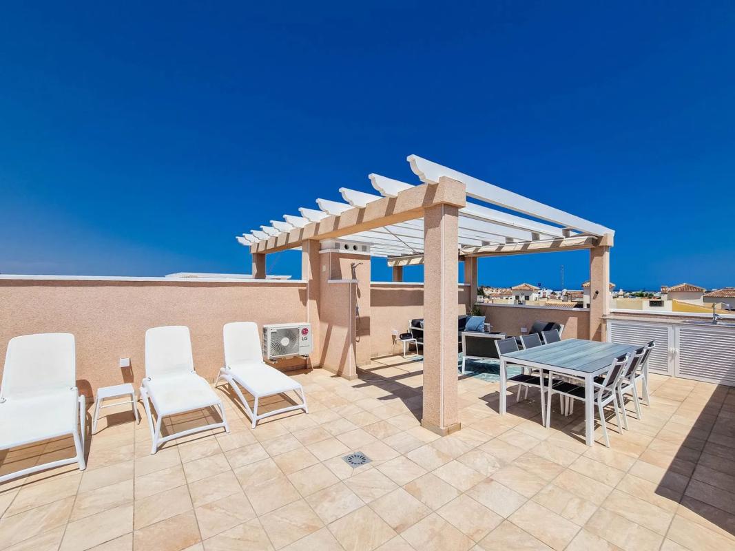 Atico moderno en Punta Prima Adéntrese en un moderno atico en primera planta en la urbanización Vista Azul en Punta Prima. Aquí vivirá cerca de entretenimiento y la playa. La vivienda cuenta con dos dormitorios, dos baños, salón y una moderna cocina abierta. Las terrazas y el amplio Solarium ofrecen agradables zonas para hacer barbacoas y tomar el sol. Una vivienda moderna y luminosa con plaza de aparcamiento. Urbanizacion con varias piscinas, un spa, un gimnasio al aire libre, un parque infantil y una piscina cubierta.