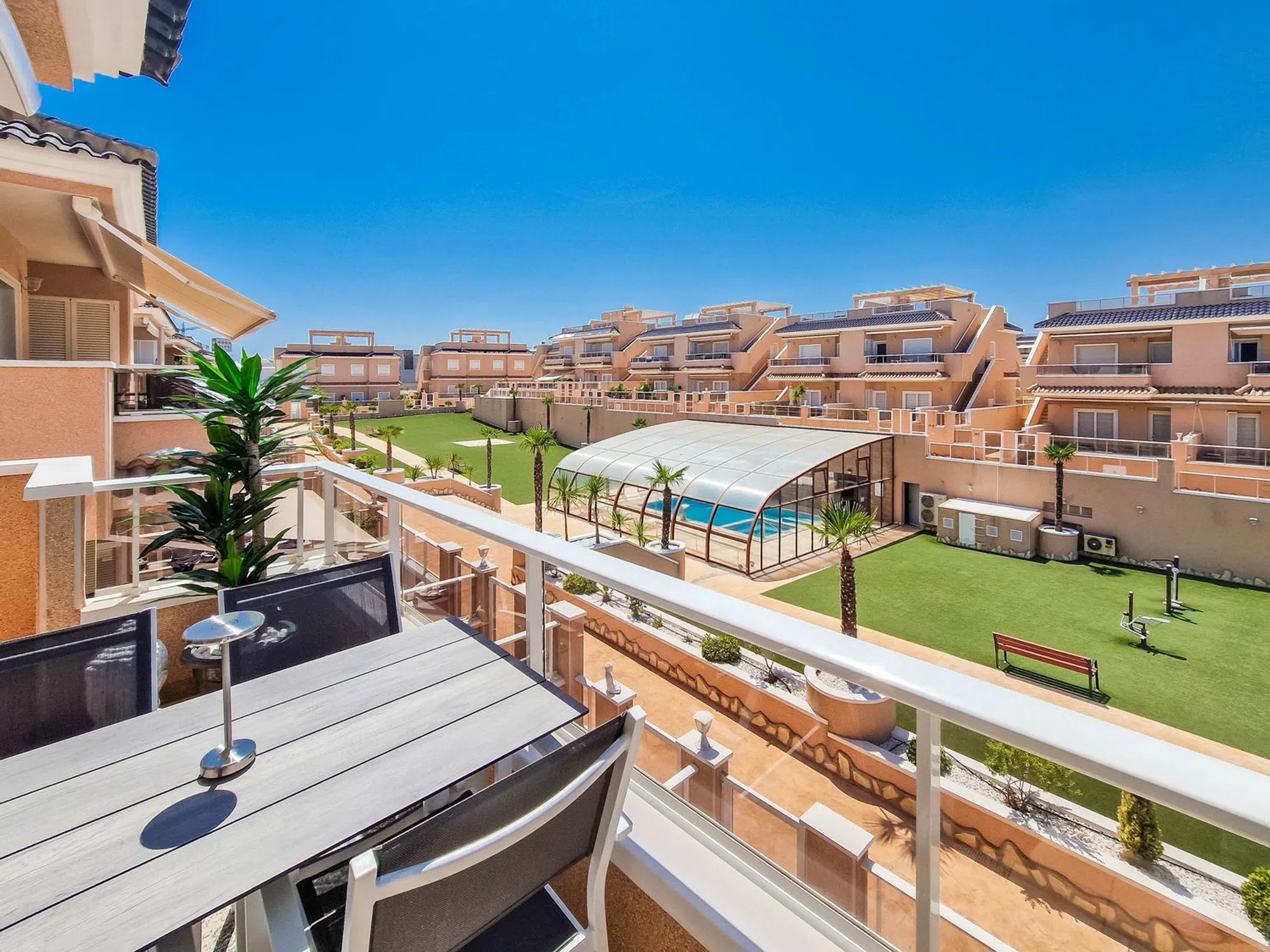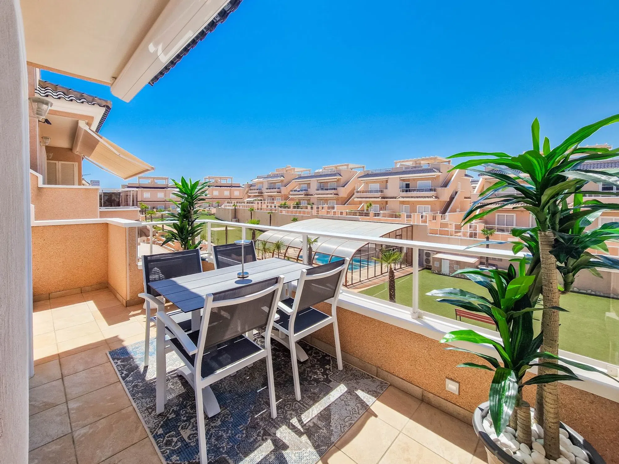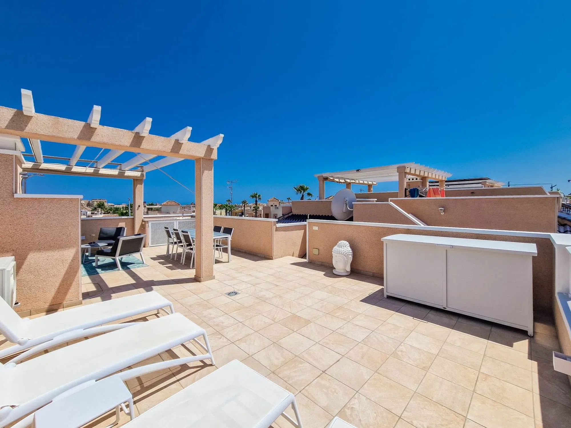Atico moderno en Punta Prima Adéntrese en un moderno atico en primera planta en la urbanización Vista Azul en Punta Prima. Aquí vivirá cerca de entretenimiento y la playa. La vivienda cuenta con dos dormitorios, dos baños, salón y una moderna cocina abierta. Las terrazas y el amplio Solarium ofrecen agradables zonas para hacer barbacoas y tomar el sol. Una vivienda moderna y luminosa con plaza de aparcamiento. Urbanizacion con varias piscinas, un spa, un gimnasio al aire libre, un parque infantil y una piscina cubierta.