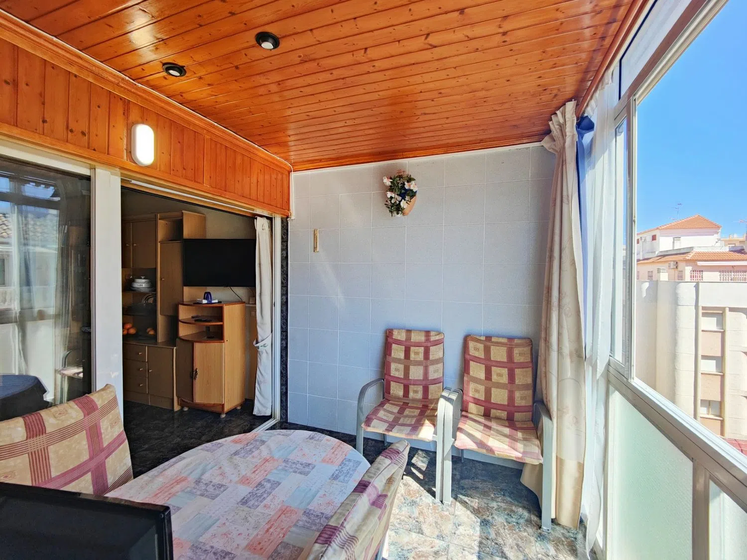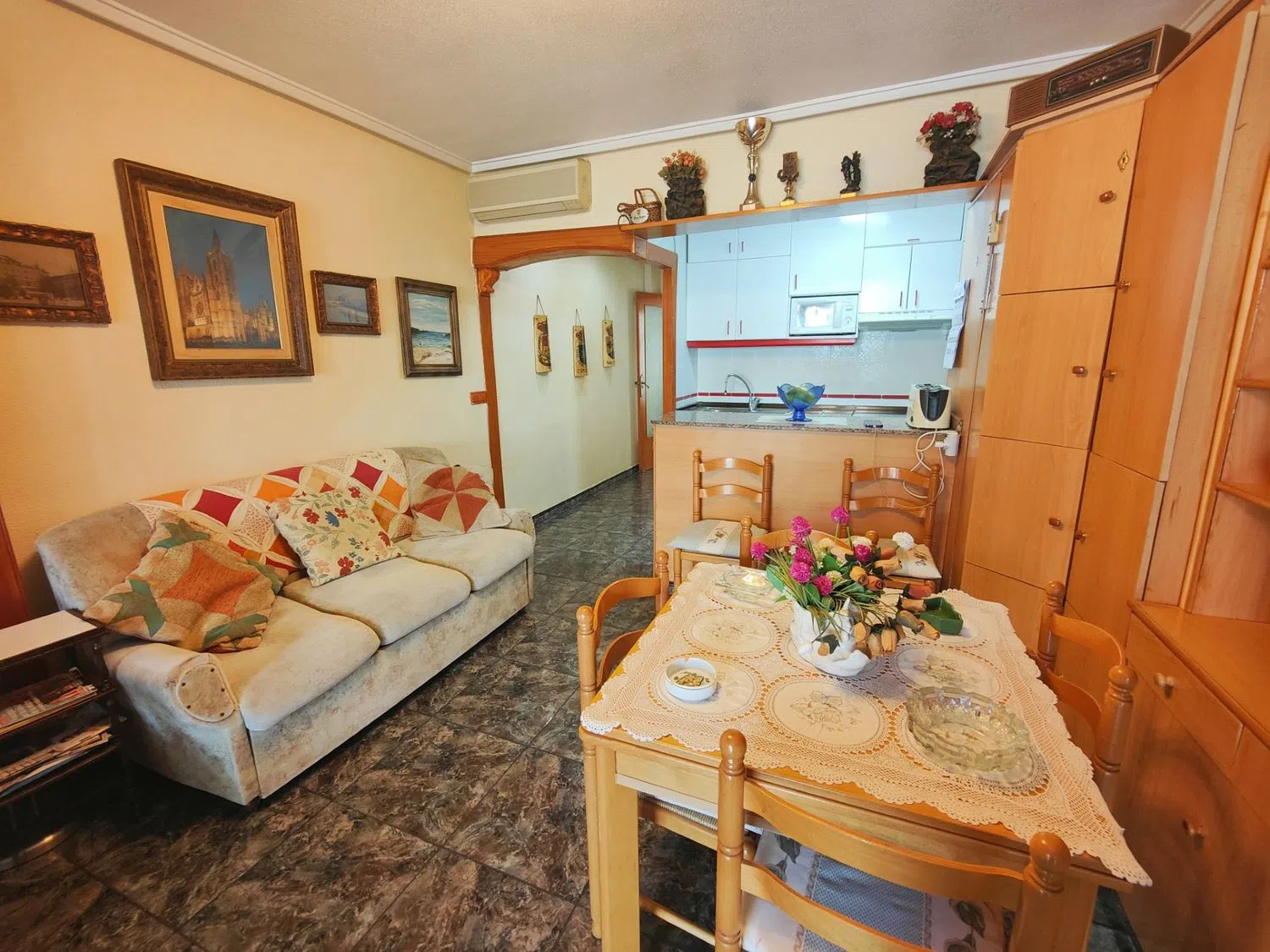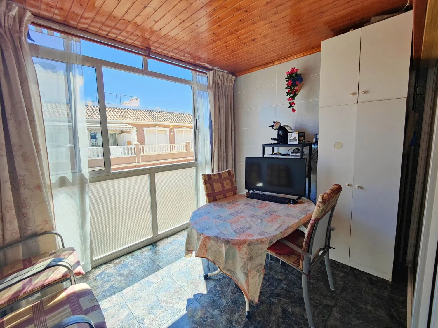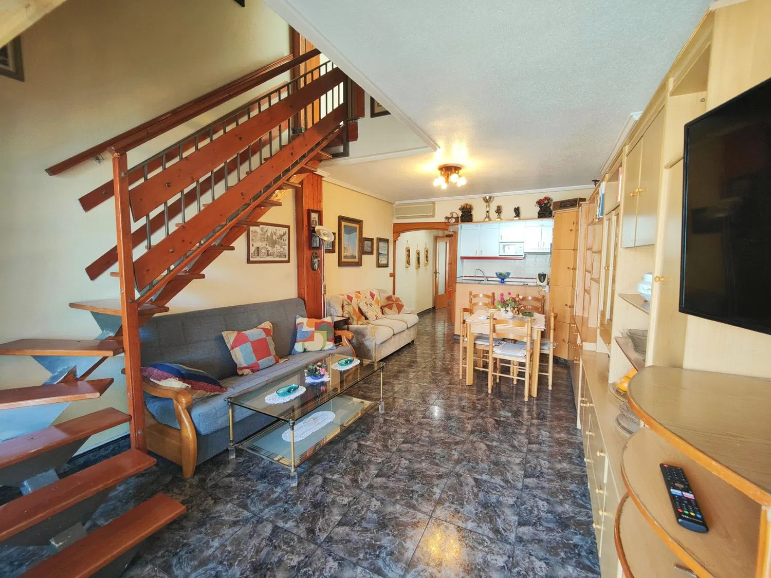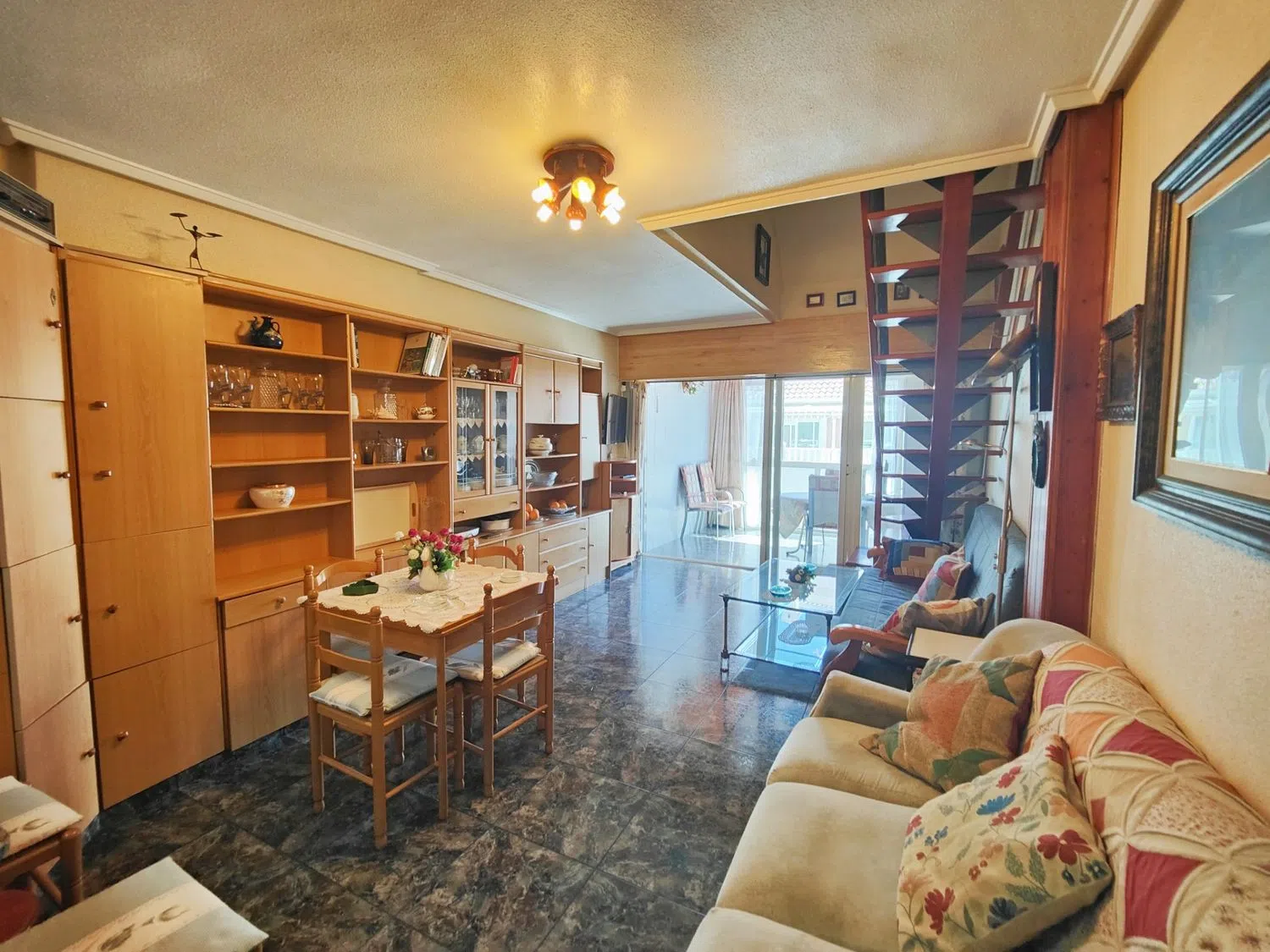 Presentamos este ático dúplex con mucho encanto. Consta de dos dormitorios y dos baños amplios. La cocina es abierta con electrodomésticos buenos. Tiene además una barra por la cual se pueden pasar los platos para poner en la mesa. Hay una entrada con ventana. La distribución es muy cómoda. En la planta baja está un baño con ducha, el salón amplio y una terraza de buen tamaño. La terraza está acristalada, lo cual hace que esté con buen mantenimiento y sea utilizable en cualquier momento y tiempo. Desde el salón sube una escalera de madera muy bonita hacia los dormitorios y segundo baño. El dormitorio principal dispone de otra terraza. Es un apartamento muy bien situado y con mucha luz exterior. Y está muy bien preparado para el calor del verano. Se encuentra a tan solo unos 100 metros de la playa. Es ideal para veranear o pasar largas temporadas o, incluso vivir. Tiene todo tipo de servicios cerca y el mar a un paso. Y como guinda del pastel, ofrecemos con este precio y en el mismo edificio un garaje de buen tamaño con su cerramiento. Lo cual es un gran alivio en la época de verano cuando aparcar no es tan fácil. Incluso tiene espacio para herramientas y los enseres de playa. Enseñaremos este piso con mucho gusto. Les va a encantar.