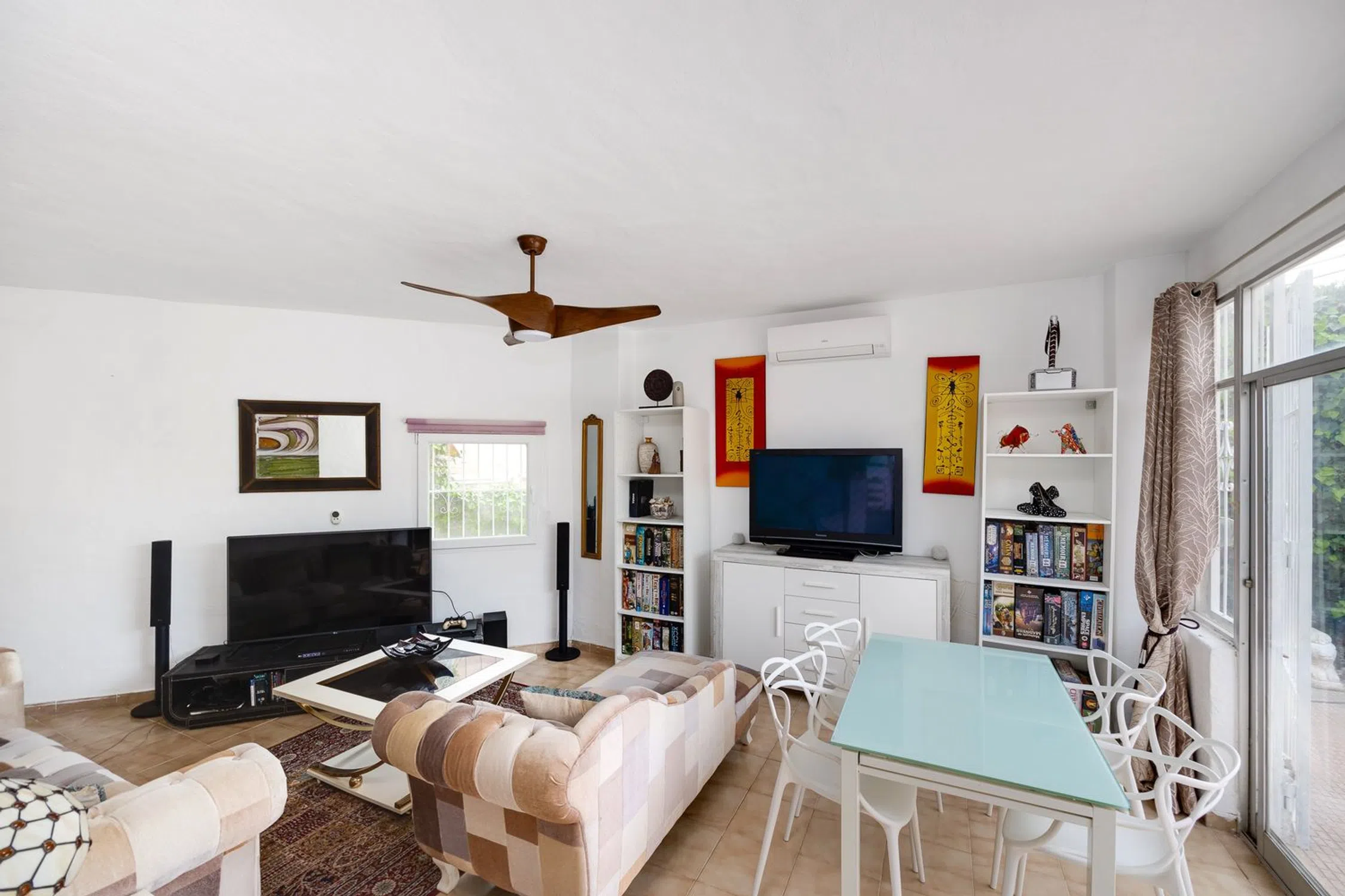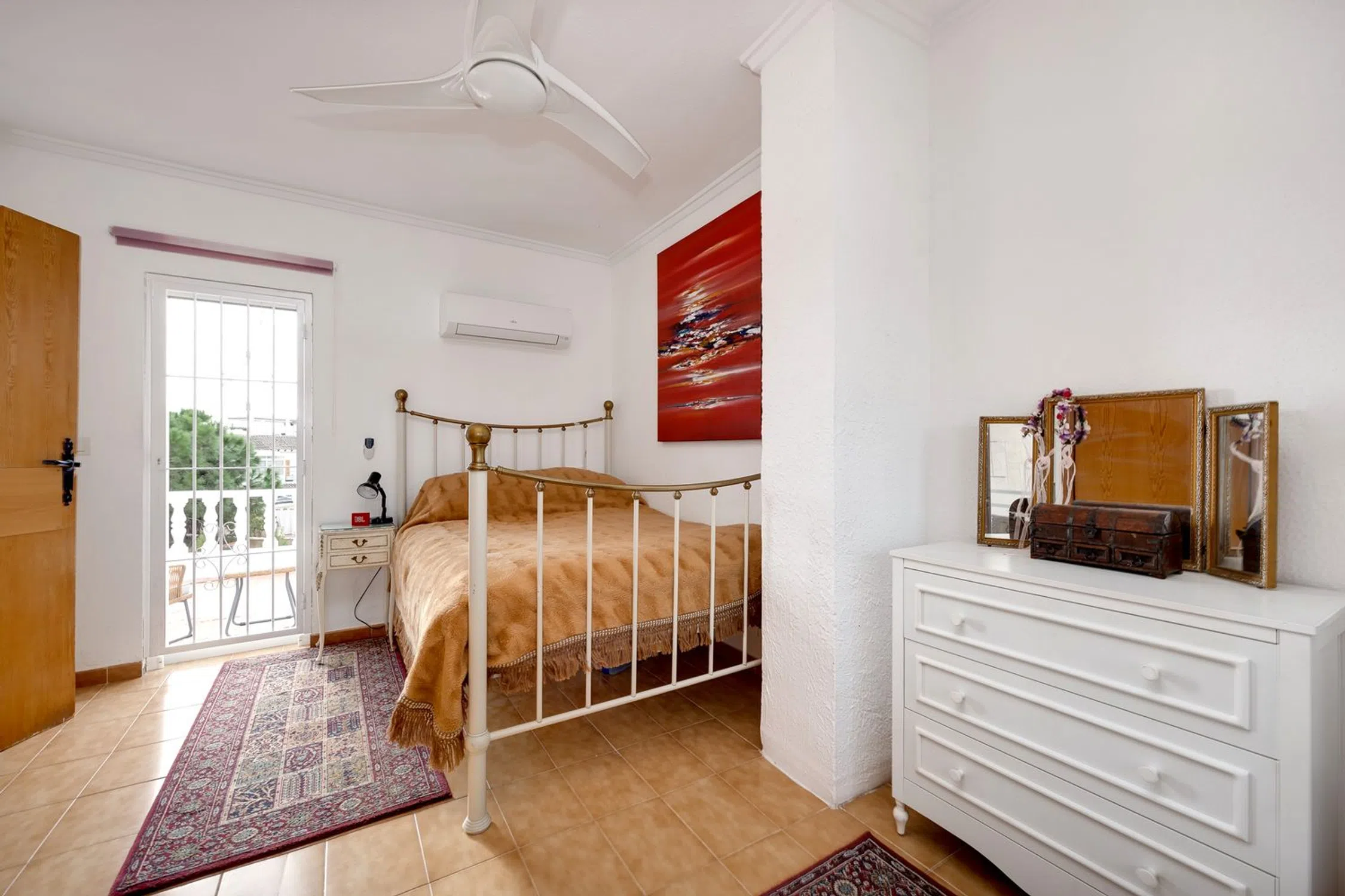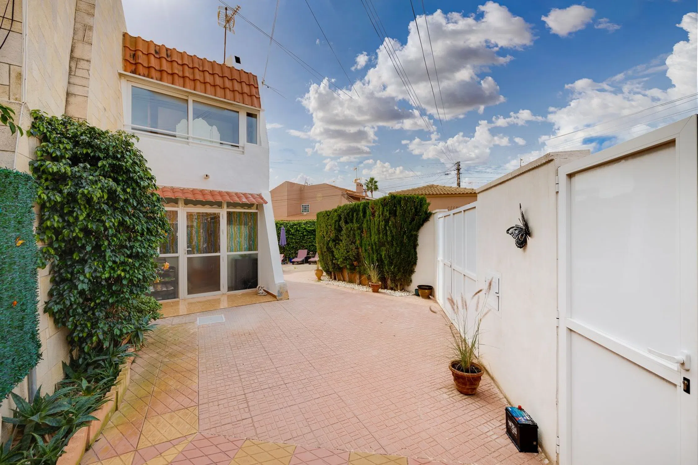 Encantadora Casa Adosada Esquinera en Ubicación Privilegiada de Aguas Nuevas, Torrevieja – a Solo 600 Metros del Mar Esta bien cuidada casa adosada esquinera se encuentra en una de las zonas residenciales más demandadas de Torrevieja, Aguas Nuevas, y se beneficia de una ubicación excelente, a solo unos 600 metros del mar. El amplio terreno de 222 m² es un verdadero atractivo, ofreciendo mucho espacio para relajarse, tomar el sol o disfrutar de reuniones. Además, cuenta con un jacuzzi para un relax total. En la planta baja se accede primero a un recibidor, actualmente utilizado para almacenar leña. A continuación, se encuentra la zona de estar y trabajo con chimenea, que crea un ambiente acogedor y proporciona calor durante los meses de invierno. La cocina abierta tiene acceso directo al patio trasero, donde se encuentra el lavadero. En la misma planta hay también un baño modernizado. Unas escaleras hacia abajo conducen al salón a nivel dividido, que destaca por su agradable altura y acceso directo a la terraza exterior, ideal para disfrutar del estilo de vida mediterráneo y ampliar el espacio habitable al aire libre. En la planta superior hay dos dormitorios adicionales y un segundo baño también modernizado. El amplio dormitorio principal tiene acceso a una terraza en la azotea de 26 m², ofreciendo privacidad y un lugar perfecto para relajarse. El dormitorio principal también cuenta con un pequeño invernadero, que se puede utilizar de diversas formas. Los sistemas de aire acondicionado proporcionan calefacción y refrigeración para un clima interior confortable durante todo el año. Gracias a su ubicación al final de la fila, la propiedad ofrece un alto grado de privacidad. También existe la posibilidad de instalar una piscina en el terreno. Entre otras ventajas, dispone de una plaza de aparcamiento privada en la propiedad y más espacios de estacionamiento frente a la casa. Una excelente oportunidad para quienes buscan un hogar encantador con amplio espacio exterior cerca del mar, perfecto como casa de vacaciones o residencia permanente. Descripción de la ubicación Aguas Nuevas es una de las zonas residenciales más codiciadas de Torrevieja, conocida por su excelente ubicación e infraestructura de alta calidad. Esta exclusiva área ofrece una combinación perfecta de tranquilidad y proximidad a las principales comodidades de la ciudad. Una de las mayores ventajas de Aguas Nuevas es su proximidad inmediata al mar. La hermosa playa de arena está a solo 1 km de distancia, lo que proporciona a los residentes un acceso fácil a días de playa relajantes y a diversas actividades acuáticas. La zona está bien equipada con todas las instalaciones necesarias para facilitar la vida diaria. Hay varios supermercados cercanos para las compras diarias. Una pista de tenis ofrece la oportunidad de hacer ejercicio cerca de casa. Además, el principal centro deportivo de la ciudad/provincia se encuentra a solo 5 minutos en coche y a 15 minutos a pie, lo que ofrece a los residentes una forma sencilla de disfrutar de una variedad de actividades deportivas. Aguas Nuevas es ideal para familias, ya que hay varias escuelas e instituciones educativas en las cercanías. Una amplia variedad de restaurantes y cafés garantiza diversidad culinaria y momentos acogedores.