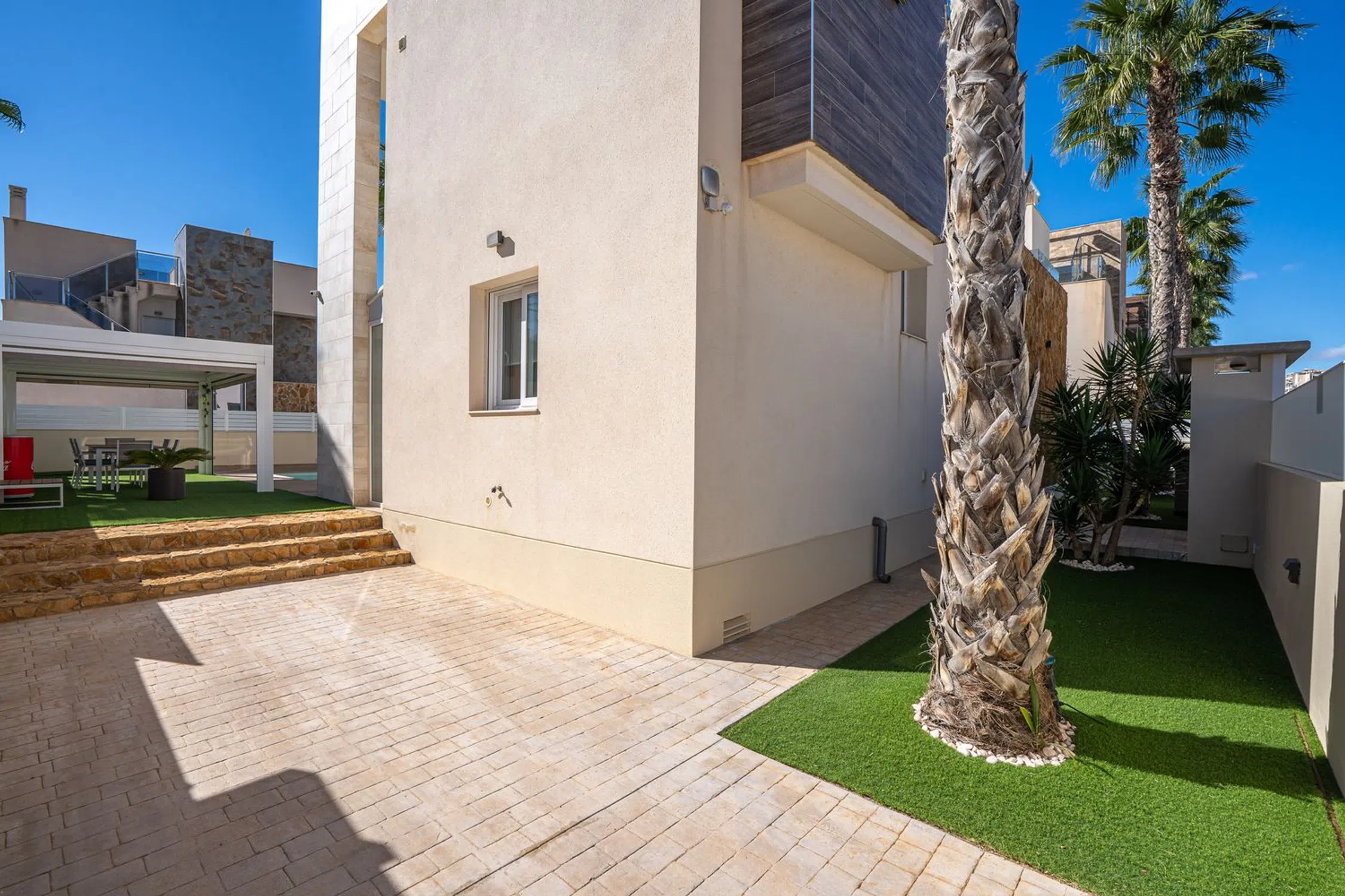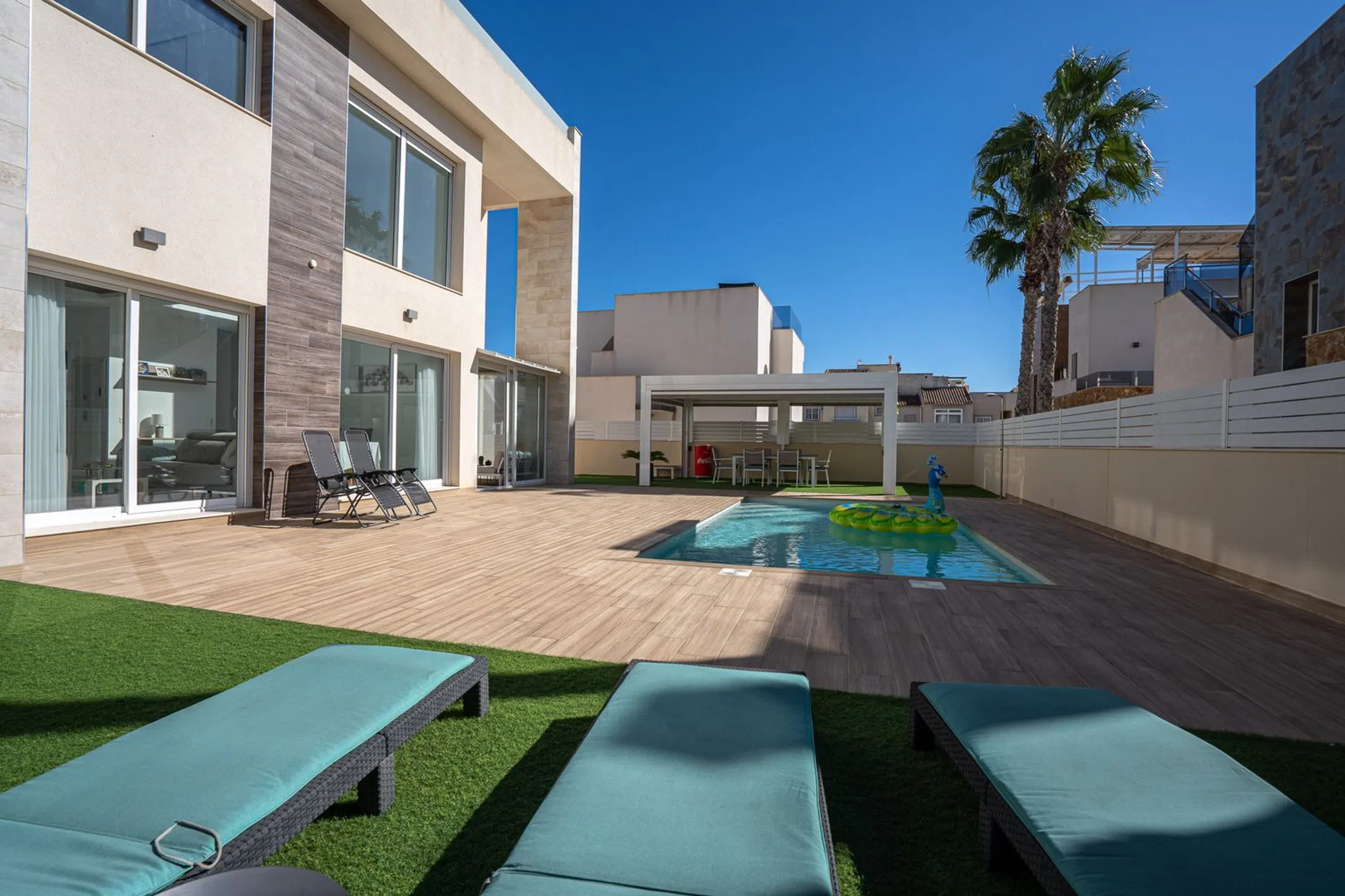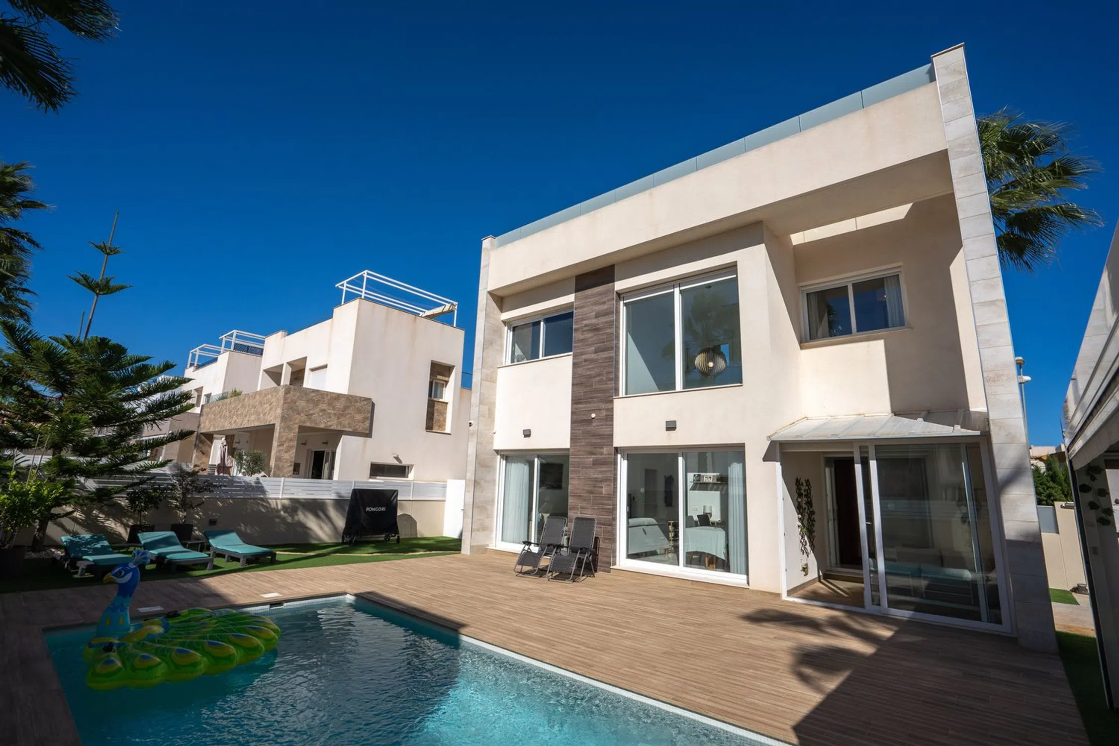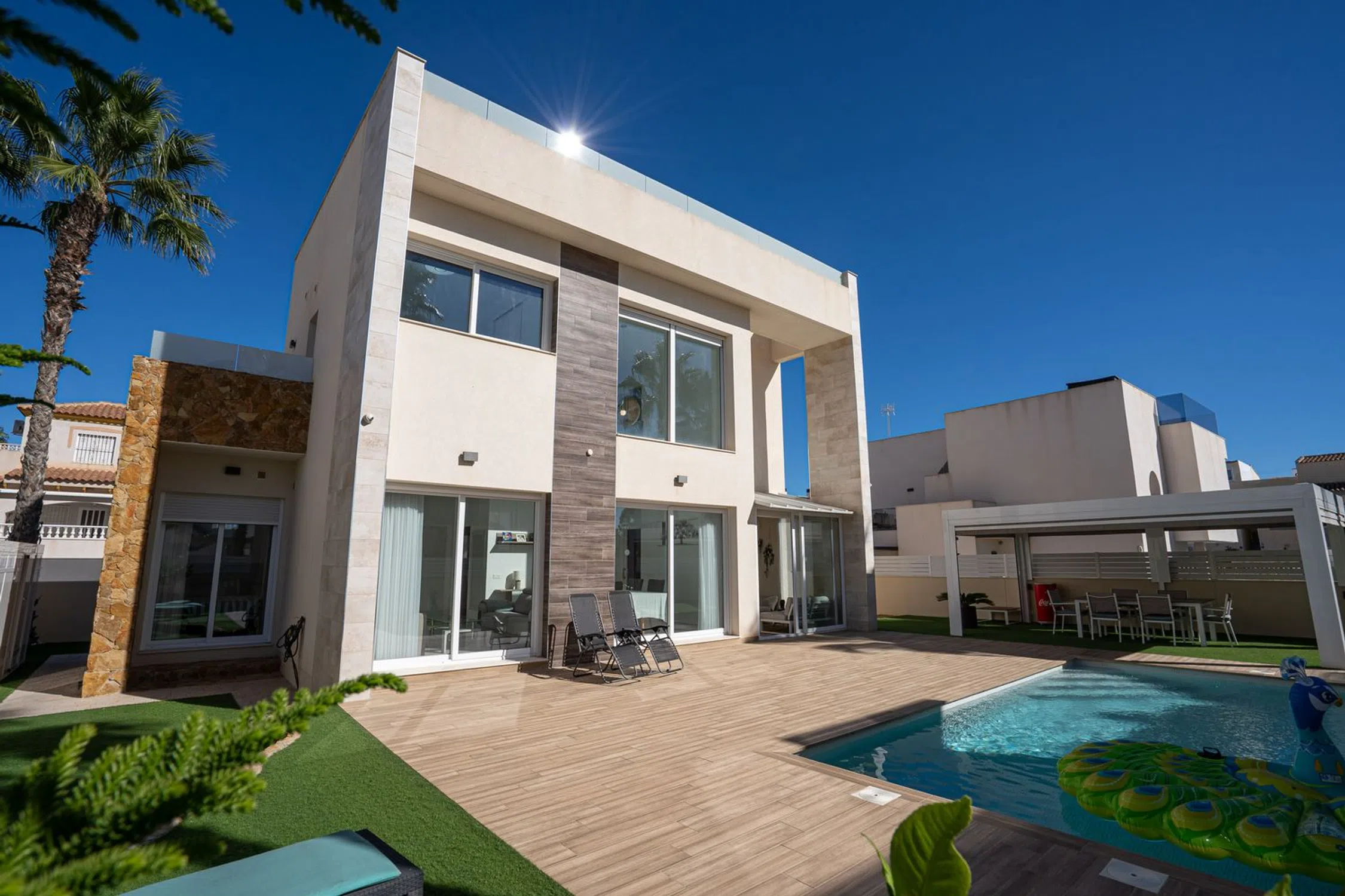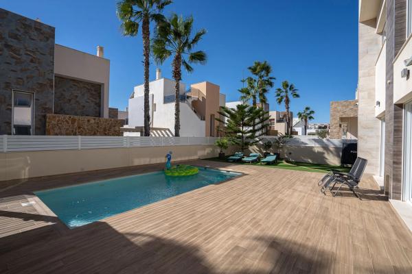 En SkandiaMäklarna, en Torrevieja, nos complace dar la bienvenida a nuestros clientes a esta espaciosa y moderna villa en la popular zona de Torre La Mata, al norte del centro de Torrevieja. La villa cuenta con una preciosa parcela verde con amplias terrazas y una atractiva piscina privada de agua salada. También dispone de aparcamiento. La casa se distribuye en dos plantas. En la planta baja se encuentran un dormitorio, un baño, el salón, la cocina y un invernadero acristalado. Bajo la escalera que conduce a la planta superior hay un trastero. Subiendo las escaleras, se accede a dos dormitorios con baño privado, uno de los cuales tiene acceso a un balcón. El recibidor de la planta superior se abre al salón, ofreciendo la posibilidad de habilitar un cuarto dormitorio si fuera necesario. En la planta superior se encuentra la gran terraza en la azotea con espectaculares vistas de los alrededores y del mar Mediterráneo. A pocos pasos encontrará una amplia variedad de restaurantes, bares y todos los servicios necesarios para su estancia en España, tanto si reside allí de forma permanente como si está de vacaciones. La playa más cercana, la popularísima playa de La Mata, está a un paso y atrae a cientos de miles de visitantes cada año. Además, cerca de acantilados desde los que se puede saltar, se encuentra Torrevieja, una ciudad con una amplia oferta de entretenimiento. Aquí podrá disfrutar de campos de golf, tiendas, rutas de senderismo en la montaña y otras actividades como el alquiler de barcos, motos acuáticas y mucho más. Hay opciones para todas las edades. La propiedad está ubicada en una zona tranquila con mucha vida y actividad durante todo el año. ¿Busca una casa exclusiva con espacio para toda la familia? Entonces, ¡ha encontrado el lugar perfecto! Bienvenido a casa.