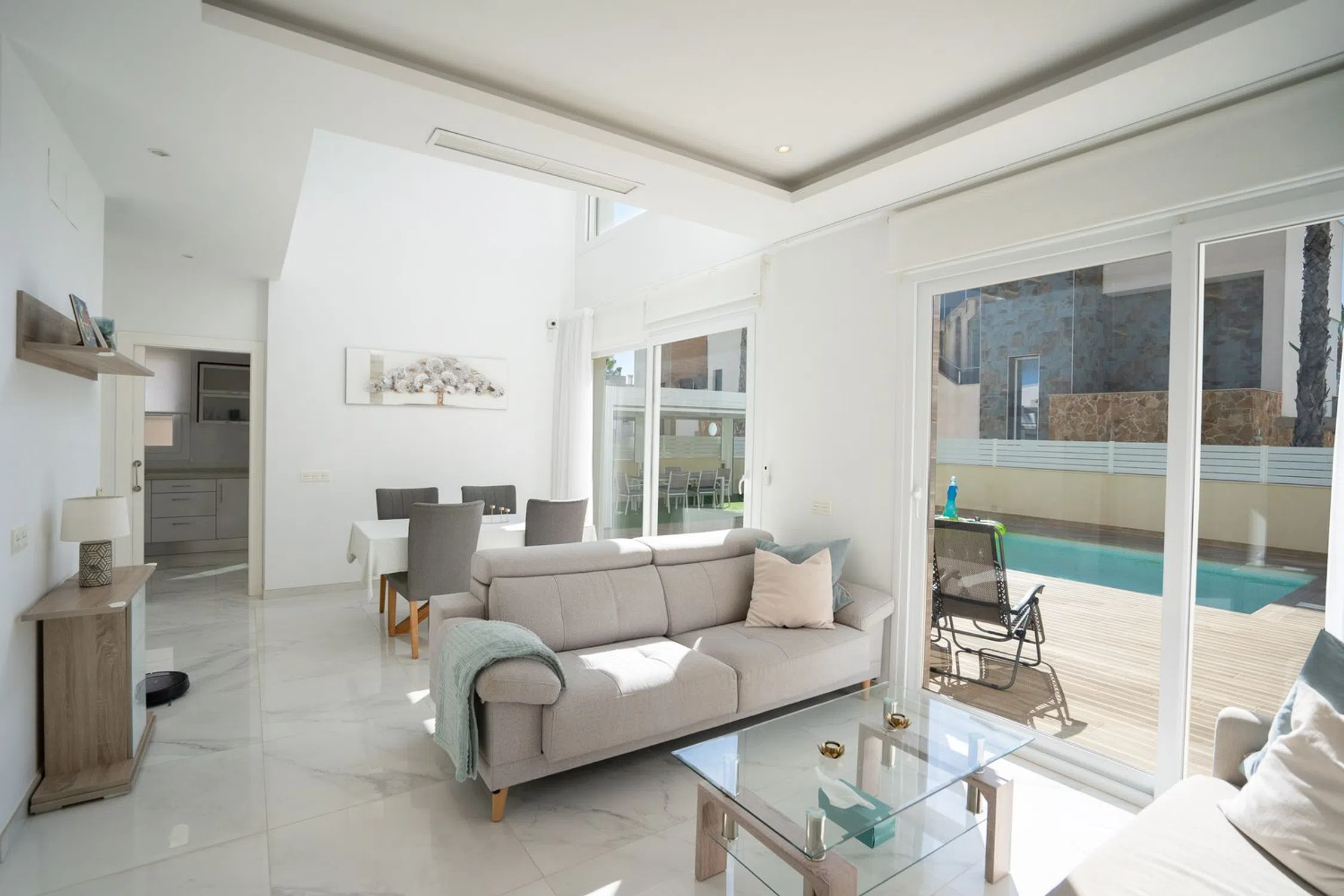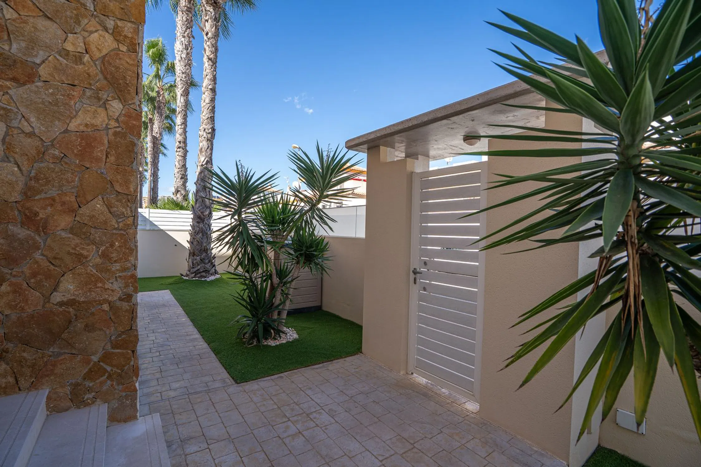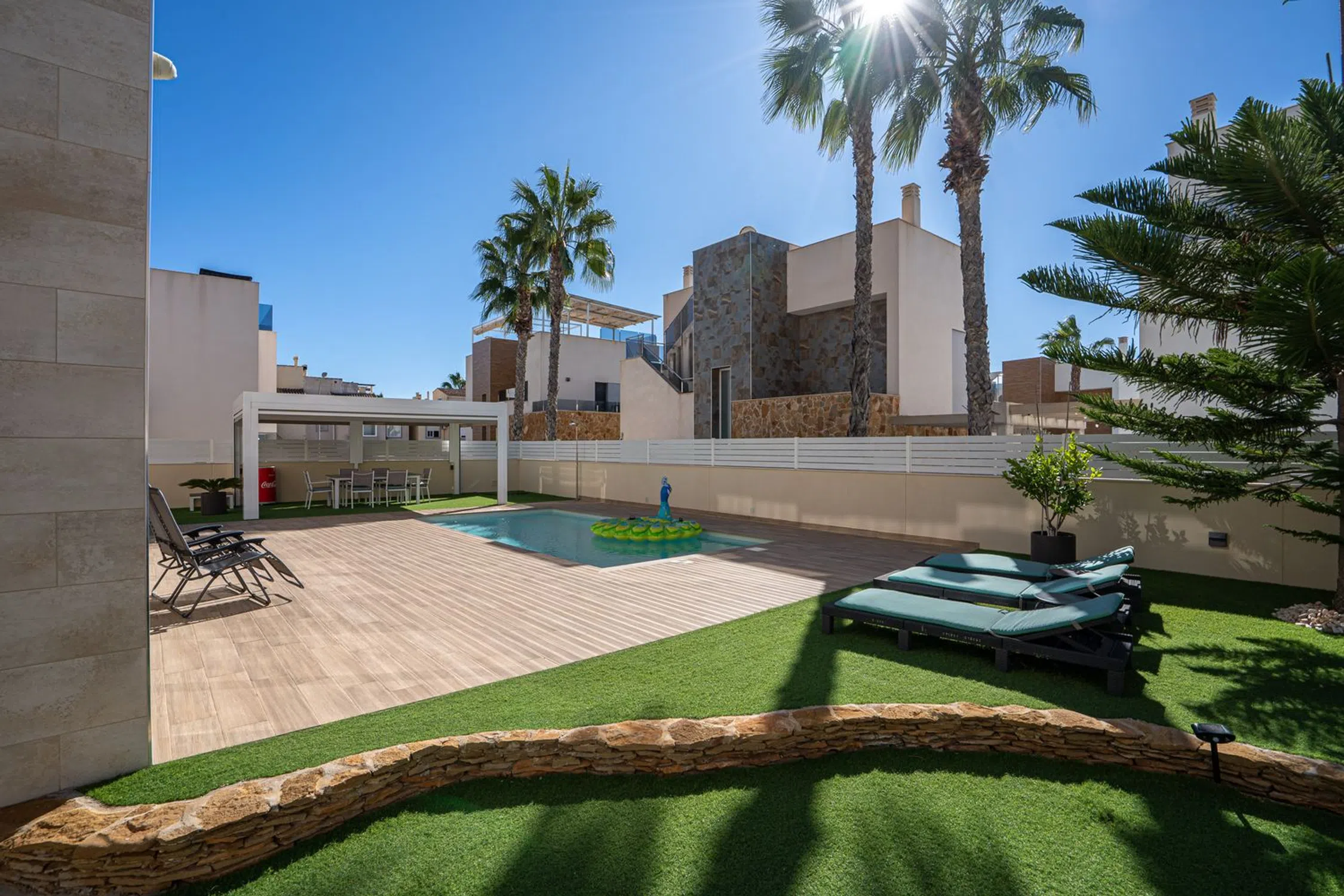 En SkandiaMäklarna, en Torrevieja, nos complace dar la bienvenida a nuestros clientes a esta espaciosa y moderna villa en la popular zona de Torre La Mata, al norte del centro de Torrevieja. La villa cuenta con una preciosa parcela verde con amplias terrazas y una atractiva piscina privada de agua salada. También dispone de aparcamiento. La casa se distribuye en dos plantas. En la planta baja se encuentran un dormitorio, un baño, el salón, la cocina y un invernadero acristalado. Bajo la escalera que conduce a la planta superior hay un trastero. Subiendo las escaleras, se accede a dos dormitorios con baño privado, uno de los cuales tiene acceso a un balcón. El recibidor de la planta superior se abre al salón, ofreciendo la posibilidad de habilitar un cuarto dormitorio si fuera necesario. En la planta superior se encuentra la gran terraza en la azotea con espectaculares vistas de los alrededores y del mar Mediterráneo. A pocos pasos encontrará una amplia variedad de restaurantes, bares y todos los servicios necesarios para su estancia en España, tanto si reside allí de forma permanente como si está de vacaciones. La playa más cercana, la popularísima playa de La Mata, está a un paso y atrae a cientos de miles de visitantes cada año. Además, cerca de acantilados desde los que se puede saltar, se encuentra Torrevieja, una ciudad con una amplia oferta de entretenimiento. Aquí podrá disfrutar de campos de golf, tiendas, rutas de senderismo en la montaña y otras actividades como el alquiler de barcos, motos acuáticas y mucho más. Hay opciones para todas las edades. La propiedad está ubicada en una zona tranquila con mucha vida y actividad durante todo el año. ¿Busca una casa exclusiva con espacio para toda la familia? Entonces, ¡ha encontrado el lugar perfecto! Bienvenido a casa.