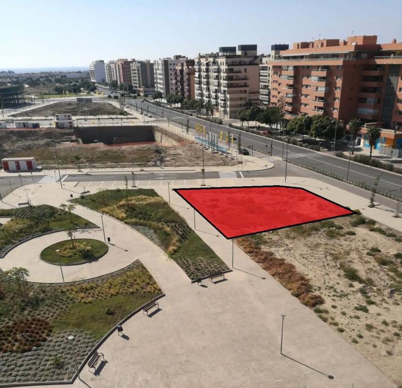 Solar para promoción de uso residencial, situado en primera línea de la avenida de la Vega de Acá, con gran visibilidad y máximas posibilidades de comercialización, haciendo esquina y con tres orientaciones: sur, este y oeste, colindando además con una zona verde. La superficie del solar es de 466 m², con volumen edificable sobre rasante de Planta baja + 7 plantas, y un precio de 585€ por m2 edificable. Zona con más demanda de obra nueva de Almería, urbanización a estrenar, donde se acaba de empezar a comercializar y construir ya las primeras promociones. Está perfectamente comunicado, con acceso directo a la autovía del aeropuerto y a la A-7, además en el entorno existen multitud de servicios y equipamientos, tales como supermercados, centro médico, farmacias, colegios, parques, centros deportivos y zona verdes.