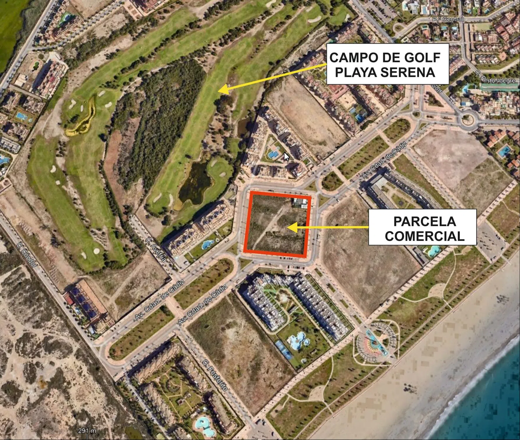 Parcela de Suelo Urbano Directo situada en la Urbanización Playa Serena (2º Fase), en el Término Municipal de Roquetas de Mar. La parcela tiene forma rectangular con una longitud de 120 m. por cada uno de sus lados. Se encuentra en el Centro de la Urbanización totalmente terminada y recibida por el Ayuntamiento de Roquetas de Mar. Cuenta con un transformador con potencial suficiente para dar servicio a toda la edificación de la parcela para uso Comercial, Deportivo, Social y Sanitario.