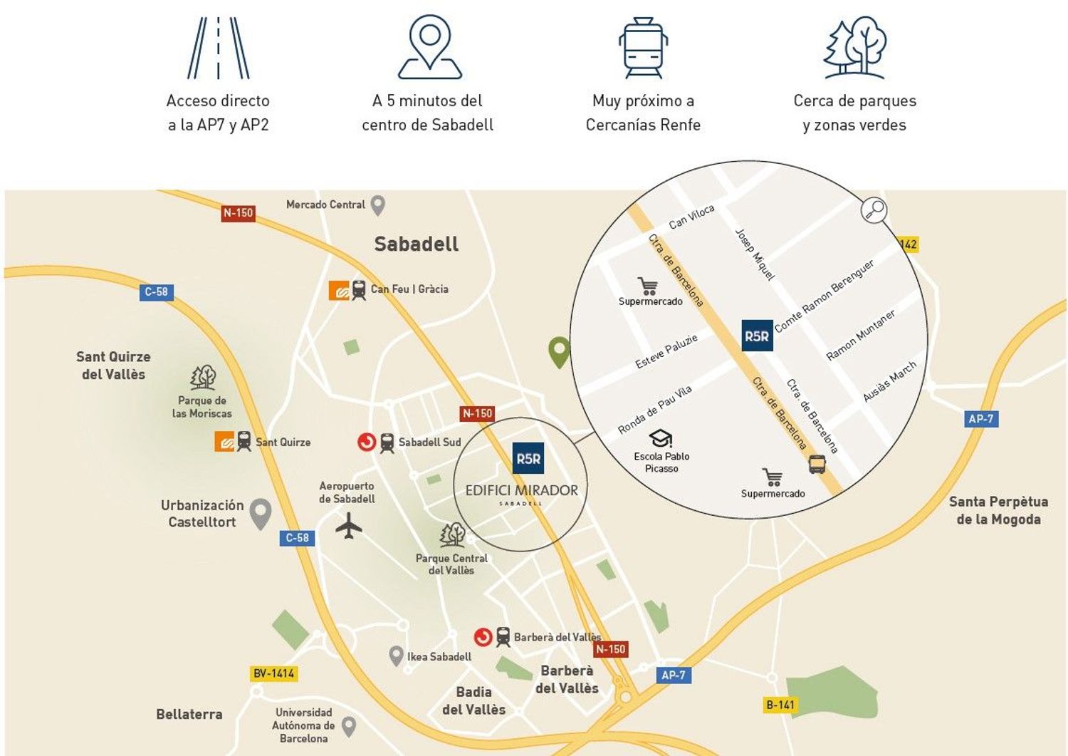 OBRA NUEVA ENTREGA FINAL 2024 VISITE PISO PILOTOOficina de Información: c/ Compte Ramon Berenguer, 6 Barberà del VallésLunes a Jueves de 10 a 14h y 16 a 19h. Sábados 10 a 14h.Viviendas de diseño actual con aerotermia y Calificación Energética A para un hogar con bajo consumo energético. Variadas tipologías y diferentes distribuciones interiores y orientaciones para encontrar la vivienda que se adapte a Ud. Todas las viviendas son totalmente exteriores y luminosas. 1, 2 y 3 dormitorios con amplios balcones para tener espacio exterior en su hogar.Funcionalidad y diseño para conseguir hogares cómodos, prácticos y acogedores.Entrega a finales 2024.CONDICIONES HIPOTECARIAS JUNIO 2024TIPOLOGIA / PRECIO VIVIENDA / Cuota 1,69% fijo (5 primeros años )1Hab. 173.000 € 493 €2Hab. 180.000 € 513 €3Hab. 249.000 € 710 €3Hab. 227.000 € 647 €EDIFICI MIRADOR, esquinero en Carretera de Barcelona con Calle Comte Ramón Berenguer ofrece viviendas totalmente exteriores con excepcionales vistas despejadas como la plaza de la Nova Creu y el Complejo Municipal con el Centro Cívico de Ca N´Amiguet y la Zona Deportiva La Románica.EDIFICI MIRADOR es un Edificio Sostenible construido con los más altos estándares para garantizar espacios saludables a sus residentes, hogares con iluminación y ventilación natural y espacios libres de contaminantes gracias a los materiales utilizados en su construcción.Nuestra inmejorable situación le permite disfrutar del Centro de Sabadell a 5minutos, con la tranquilidad de la zona de La Creu, rodeada de la mejor comunicación como la Ronda de Pau Vila, acceso directo a la AP-7 y AP2 así como centros deportivos, escuelas, centros de salud primaria o cercanías Renfe.Plazas de parking opcionales en la misma finca.VISITE PISO PILOTO ENTREGA FINALES 2024Lunes a Jueves de 10 a 14h y 16 a 19h. Sábados 10 a 14h.Estamos a pie de obra en c/ Compte Ramon Berenguer, 6 con Carretera de Barcelona, 685 R5R GRUP IMMOBILIARI es un grupo promotor familiar con 50 de experiencia en promoción inmobiliaria y gestión patrimonial. Su actividad se caracteriza por proyectos de calidad en ubicación, diseño y construcción, atendiendo requerimientos en Eficiencia Energética y Sostenibilidad Medioambiental, todo ello mediante equipo propio de profesionales.