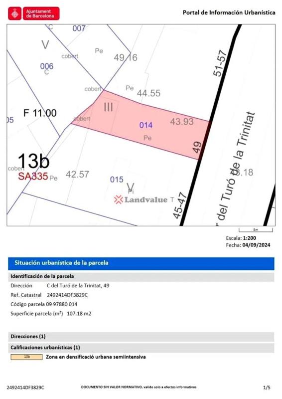 Solar en Barcelona zona La Trinitat Vella, 108.90 m. superficie parcela y 257m2 edificables. Suelo urbano consolidado Ordenanza de aplicación-Norma zona-Clase/Subclase 13b Densificació ur...