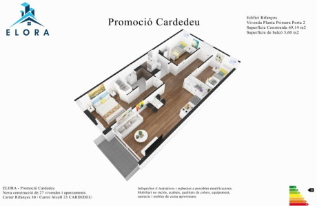 Residencial Rifanyes es una promoción de viviendas de obra nueva, de 1, 2 y 3 dormitorios con terrazas. Situada en Cardedeu, a tan sólo 20 minutos de Barcelona y a 500 metros de la montaña. Edificio moderno con un cuidado diseño arquitectónico, que cuenta con plazas de garaje para coche y para bicicletas, y trasteros. Todas las viviendas disponen de cocina amueblada, con campana extractora, placa vitrocerámica y horno, calefacción individual mediante caldera de gas natural, puerta de entrada blindada, carpintería exterior con rotura de puente térmico, doble acristalamiento y cámara de aire e instalación de paneles solares. Con Alta calificación energética, calificada como B. Tendrá la posibilidad de personalización de acabados. Las obras se incian en breve, y las cantidades entregadas hasta la entrega de llaves estarán avaladas por el Banco Santander.