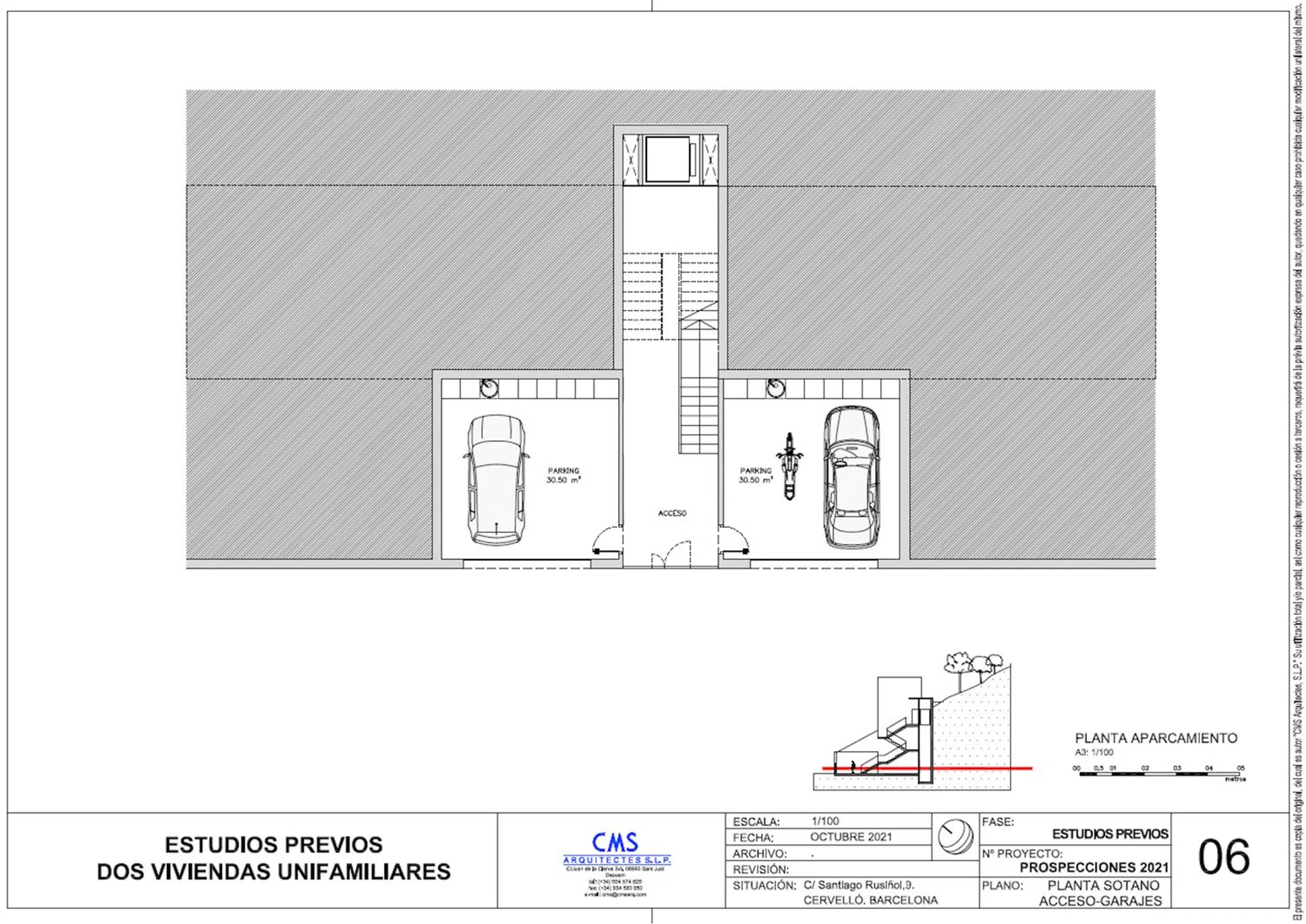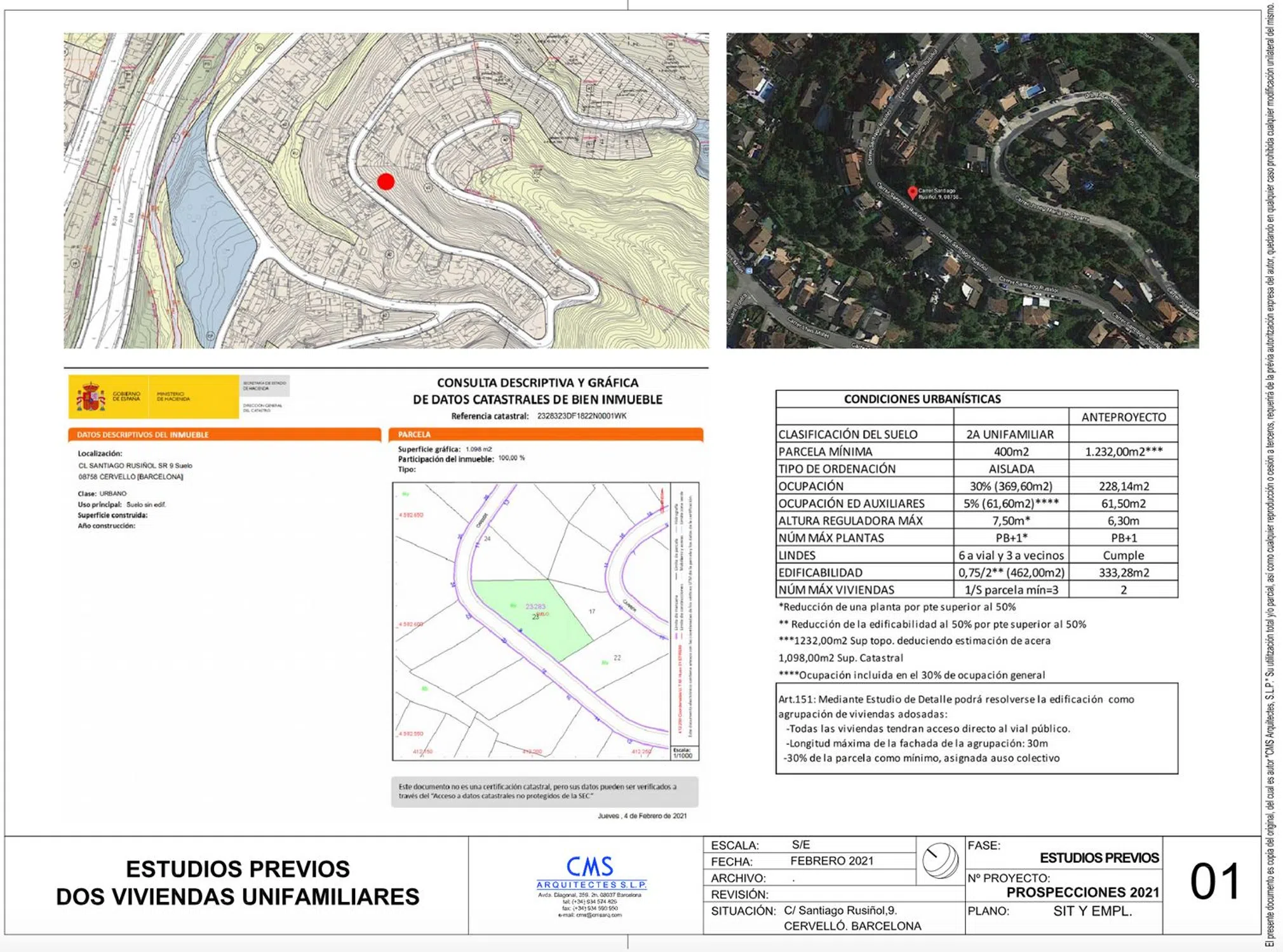 Parcela formada por dos terrenos colindantes, con inclinación ascendente y orientación sur de 55 metros de fachada y 1.100 metros cuadrados de superficie. Se puede comprar una parcela (550 m2) o las dos juntas (1.100 m2). Calificación urbanística A2 unifamiliar aislada, con 30% de ocupación, y 2 plantas (PB + 1 PP). Urbanización con todos los servicios, muy bien comunicada con la nueva variante B-24 y con el pueblo de Cervelló.