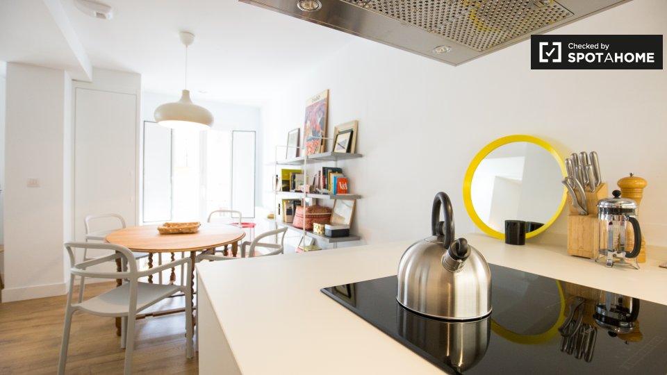 Cuando vivas aquí, estarás en el centro de todo. La hermosa e histórica Catedral de Santiago está justo al final de la calle y es una visita obligada en Bilbao. El vecindario que lo rodea está repleto de restaurantes y tiendas, por lo que es fácil obtener su solución minorista aquí. También está a pocos pasos del río Nervión y del popular Mercado de la Ribera.