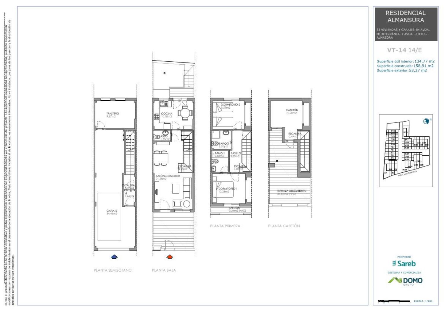 La promoción consta de 32 viviendas unifamiliares adosadas y 1 aislada. Se distribuyen en 3 dormitorios. Tiene una zona común con piscina. También incluyen garaje privativo en planta sótano.Una opción perfecta tanto para primera como para segunda residencia.Almazora se encuentra al sureste de la provincia de Castellón, en la comarca de la Plana Alta. El municipio si sitúa al margen izquierdo del río Mijares hasta la desembocadura. La localidad se divide en la zona de la ciudad, situada en el interior, y la zona costera, donde se encuentra nuestra promoción. En el paseo marítimo, podemos encontrar un monumento que marca el punto por donde pasa el Meridiano de Greenwich.La promoción se encuentra a 12 km de Castellón de la Plana, y a 14 km de Villareal. La playa está situada a 130 m. La carretera principal que une la zona de playa con la zona de la ciudad es la CV-1840.La zona del activo es bastante tranquila, zona perfecta para vivir por su cercanía a Castellón y perfectamente comunicado con la ronda. Además, es una zona donde poder veranear con niños y evitar los ajetreos de otras zonas costeras. En el paseo marítimo encontramos varios parques de juegos para niños y zonas verdes para pasear junto a tu animal de compañía.Ponte en contacto con nosotros para ampliar información o reservar vivienda. También puedes pinchar en el enlace de nuestra página Web y dejarnos tus datos, para ponernos en contacto contigo.