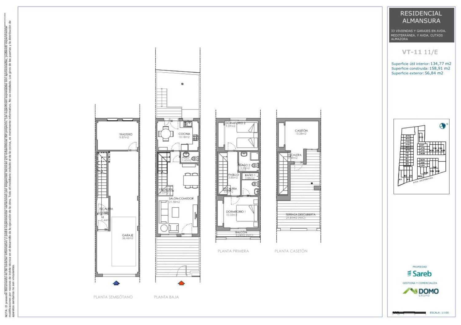 La promoción consta de 32 viviendas unifamiliares adosadas y 1 aislada. Se distribuyen en 3 dormitorios. Tiene una zona común con piscina. También incluyen garaje privativo en planta sótano.Una opción perfecta tanto para primera como para segunda residencia.Almazora se encuentra al sureste de la provincia de Castellón, en la comarca de la Plana Alta. El municipio si sitúa al margen izquierdo del río Mijares hasta la desembocadura. La localidad se divide en la zona de la ciudad, situada en el interior, y la zona costera, donde se encuentra nuestra promoción. En el paseo marítimo, podemos encontrar un monumento que marca el punto por donde pasa el Meridiano de Greenwich.La promoción se encuentra a 12 km de Castellón de la Plana, y a 14 km de Villareal. La playa está situada a 130 m. La carretera principal que une la zona de playa con la zona de la ciudad es la CV-1840.La zona del activo es bastante tranquila, zona perfecta para vivir por su cercanía a Castellón y perfectamente comunicado con la ronda. Además, es una zona donde poder veranear con niños y evitar los ajetreos de otras zonas costeras. En el paseo marítimo encontramos varios parques de juegos para niños y zonas verdes para pasear junto a tu animal de compañía.Ponte en contacto con nosotros para ampliar información o reservar vivienda. También puedes pinchar en el enlace de nuestra página Web y dejarnos tus datos, para ponernos en contacto contigo.