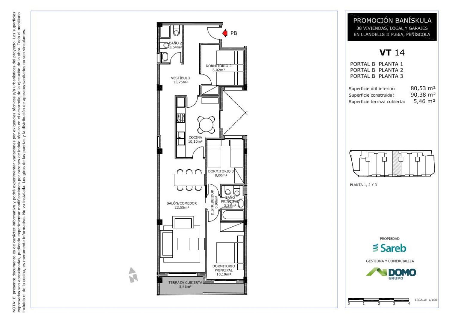 Promoción de 38 viviendas en altura de 3 y 4 dormitorios, con 33 plazas de garaje, 5 plazas de moto y un local comercial situada en la calle Landells 16, de Peñíscola. En un edificio de 4 plantas sobre rasante y una planta sótano.El total de viviendas, 32 son de 3 dormitorios y 6 de 4 dormitorios. Todas cuentan con terrazas.Promoción propiedad de Sareb.Peñíscola se ubica al Norte de la Comunidad Valenciana, en un punto privilegiado del Mediterráneo español. Es un municipio en la costa de Castellón, a 50 km al norte de esta ciudad. Es una importante zona turística, especialmente en verano.El edificio se encuentra en la calle Llandels 16, a unos 7 minutos andando de la Platja de Peñíscola y a 9 minutos de la Platja del Migjorn situada junto al puerto. Ponte en contacto con nosotros para ampliar información o reservar vivienda. También puedes pinchar en el enlace de nuestra página Web y dejarnos tus datos, para ponernos en contacto contigo.Algunas viviendas incorporan plaza de garaje con un precio adicional de 7.000 € + IVA.