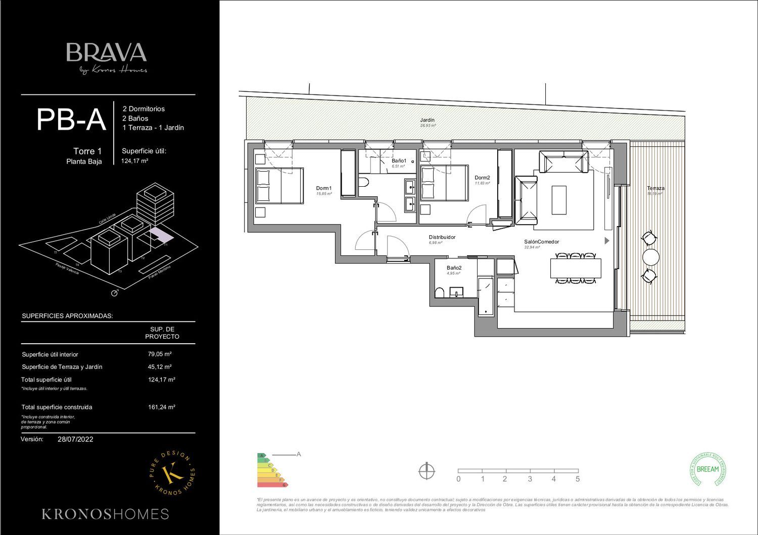 Kronos Homes presenta Brava, un exclusivo proyecto en primera línea de playa en Platja d’Aro de 82 viviendas diseñado por el prestigioso arquitecto Ricardo Bofill. Sus luminosas viviendas de 1, 2 y 3 dormitorios cuentan con plaza de garaje y trastero y han sido especialmente concebidas para disfrutar de la vida al aire libre. Un enfoque mediterráneo que se hace patente en sus espectaculares áticos con piscina privada y en las amplias terrazas de las plantas bajas. En cuanto a las zonas comunes, los distintos edificios se enmarcan en un residencial ajardinado con un cuidado paisajismo que mantiene los ejemplares de pino originales de la zona. El conjunto conforma un entorno único en el que podrá disfrutar de una pista de pádel, un gimnasio completamente equipado, una piscina para adultos y niños y una sala polivalente. Todo ello en una ubicación inmejorable, a media hora de Girona y su aeropuerto, a una hora de Barcelona y a hora y media de la frontera francesa.