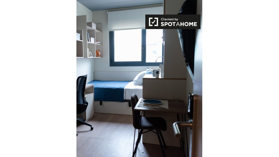 Una Habitación Individual con baño privado ubicada en la residencia de estudiantes que va más allá de lo común. Hay una nevera y microondas en tu habitación.
