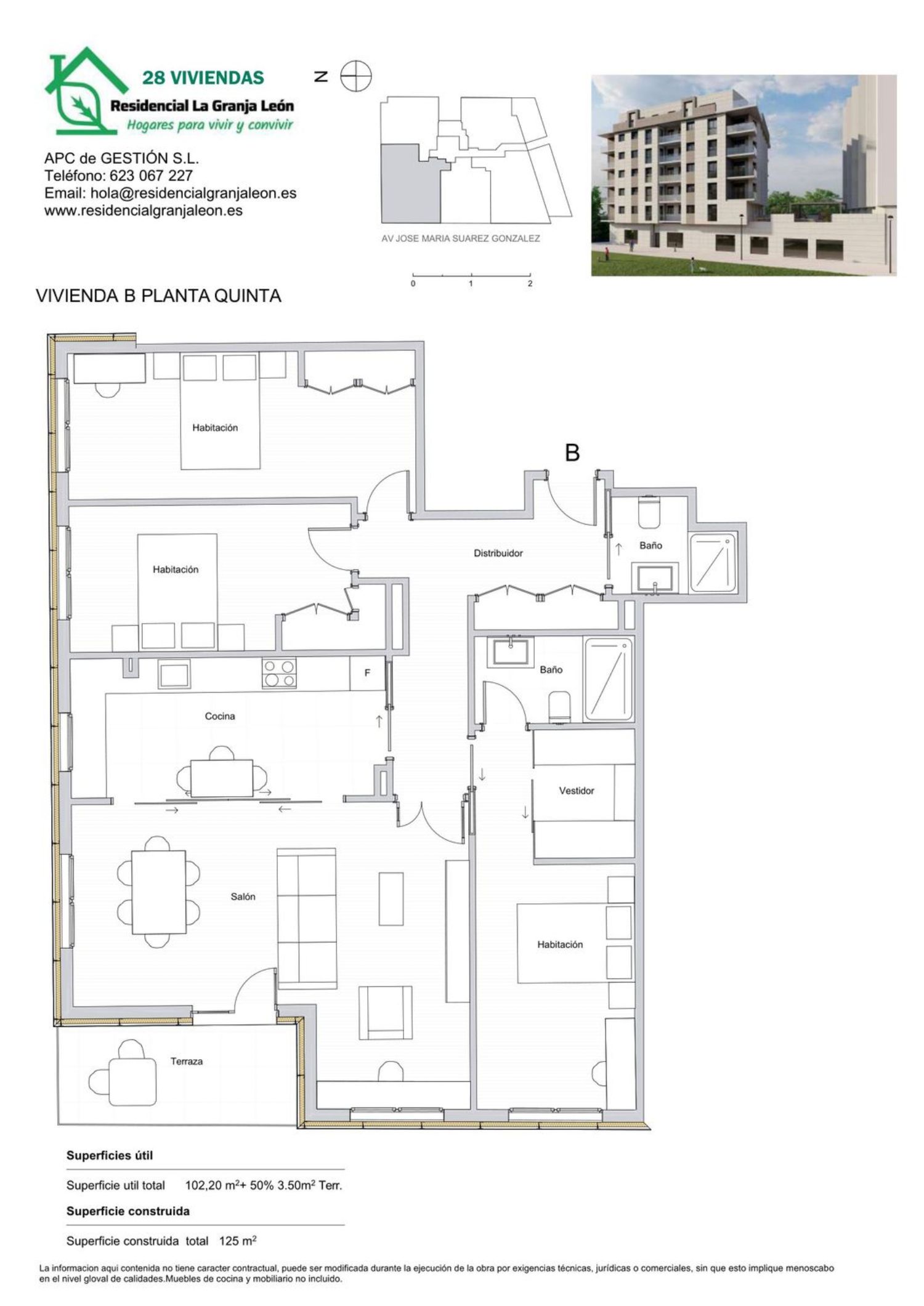 RESIDENCIAL LA GRANJA LEÓN. Nueva promoción de 28 viviendas de OBRA NUEVA en la mejor zona de León, frente al nuevo centro de salud de “El Ejido”, y a unos pasos del parque de La Granja y del Parque Comercial "Reino de León".TRES ÚLTIMAS VIVIENDAS DISPONIBLES, todas ellos muy luminosas, con amplias terrazas y con espacios aptos para conciliar el teletrabajo.CARACTERÍSTICAS DEL EDIFICIO:* Edificio pasivo y sostenible: viviendas de consumo casi nulo.* Calificación energética "A".* Instalaciones centralizadas (contador individual): gas natural + aerotermia + paneles solaresfotovoltaicos.* Suelo radiante en las viviendas, para calefacción y refrigeración.* Sistema de ventilación mecánica controlada con recuperador de calor y sistema de filtrado de aire.* Fachada ventilada con revestimiento cerámico extrusionado.* Carpintería de PVC con rotura de puente térmico, con triple acristalamiento, cristal exterior bajo emisivo y apertura oscilobatiente. Persianas motorizadas.* Gran aislamiento térmico y acústico, tanto en paramentos verticales como horizontales.* Armarios empotrados y vestidores, según planos.* Baños: sanitarios suspendidos, platos de ducha amplios con grifería termostática, lavabo encastrado en mueble de baño.* Hogares inteligentes: Sistema digital con control por voz o smartphone para el mando de laspersianas, termostatos, luces y algunos aparatos eléctricos, tales como enchufes para televisión y cadena de música…* Iluminación empotrada tipo led en toda la vivienda (para luz ambiente).* Amplias zonas comunes “para vivir y convivir”: piscina cubierta climatizada, sauna tipo finlandesa, 270 m2 de terraza ajardinada comunitaria y sala de usos múltiples. La terraza comunitaria está pensada para poder utilizarse durante todo el año; para ello dispone de una pérgola bioclimática.* Preinstalación de electricidad en cada plaza de aparcamiento para la carga de vehículos eléctricos.Entrega de llaves: primer trimestre de 2024. ¡INFÓRMATE!