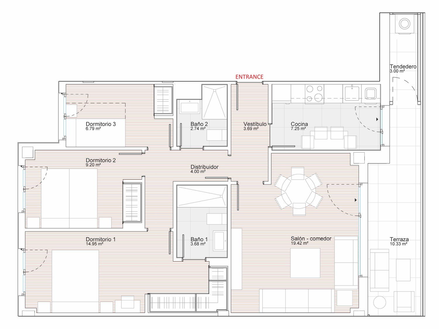 La vivienda (obra nueva) corresponde a la promoción Aires de Vallecas (Fase II); actualmente en construcción. La promoción se encuentra localizada en Avenida de la Suertes esquina con Calle Corral de Almaguer (Ensanche de Vallecas - Madrid).La urbanización consta de 36 viviendas y de las siguientes zonas comunes:-Piscina.-Solarium-Cenador- Zona chillout- Gimnasio.El conjunto de viviendas consta de 4 plantas y una planta de ático. Las terrazas contarán con un cerramiento de vidrio tipo Lumon, pudiendo utilizar el espacio todo el año. Las barandillas de las terrazas serán de vidrio trasparente sin herrajes. Sistema de climatización por suelo radiante y refrescante. La carpintería exterior será de ventanas y puerta – ventana de PVC, oscilobatiente y doble acristalamiento con gas argón en la cámara de aire. Cocina con encimera SILESTONE (modelo Miami White).Es una zona consolidada con servicios públicos cercanos: Centro Comercial La Gavia, colegios, guarderías, instalaciones multideportivas, Ciudad Deportiva Fundación Rayo Vallecano y metro.La vivienda es una tercera planta exterior y consta de una superficie construida de 109,50 m2, con terraza de 11,37 m2 y tendedero de 3,03 m2, aproximadamente. Incluye garaje y trastero.El inmueble dispondrá de las siguientes estancias:-Terraza-Tendedero (exterior)-Salón – comedor (exterior)-1 dormitorio principal (exterior) con baño incorporado-2 dormitorios (exterior)-2 Baños (1 baño incorporado al dormitorio principal)-1 plaza de garaje-1 trastero.La terraza y el tendedero, junto con la cocina y el salón – comedor, dan a la Calle Corral de Almaguer. Los dormitorios, a las zonas comunes de la urbanización.Principales puntos de interés de la zona:-Centro Comercial la Gavia (Carrefour, IKEA, restaurantes, cines, etc)-Mercadona-Colegio Stella Maris-Pumptrack Ensanche de Vallecas-Parque de Valdecardos.-Parque Lola Camarena-Centro de Salud Ensanche de Vallecas-Centro Deportivo Municipal Juan de Dios Román-Metro: La Gavia / Las SuertesAmenabar es la promotora y constructora. El plazo de terminación y entrega de la promoción está previsto para mediados de julio de 2024.El inmueble lo vendo de manera particular y, la escritura de compraventa se formalizará una vez la promotora me entregue las llaves.La información de la promoción puede consultarse en el siguiente link:airesdevallecas.comEn el siguiente link podrá ver fotos de los avances de la construcción:airesdevallecas.com/es/la-obra-hoy.html¡Gran oportunidad!