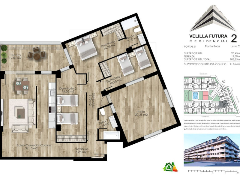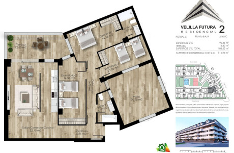 Bienvenidos a RESIDENCIAL VELILLA FUTURA. En nuestro nuevo proyecto (fase 2), apostamos por viviendas: espaciosas, confortables, sostenibles y a tu alcance, integradas en una urbanización con todos los servicios que permiten ser un espacio para la convivencia y en un edificio con estilo, diseño y personalidad propia.Las viviendas tendrán calificación energética A (la máxima), lo que supondrá un importante ahorro en la factura de electricidad y calefacción, además de un ahorro también en los tipos de interés que aplican las entidades financieras al contratar una hipoteca.A destacar el doble aislamiento acústico y térmico en las viviendas, además de estar dotadas con un sistema de suelo radiante refrescante (para calor y frío), lo que ahorra espacio al eliminar los radiadores e implica también un menor consumo energético, siendo más sostenibles. Las ventanas son de PVC con doble acristalamiento tipo climalit y rotura de puente térmico. Las viviendas incorporan también un sistema de ventilación mecánica individual, consistente en la renovación del aire interior de la vivienda adaptándose automáticamente a la tasa de humedad y/o la presencia de ocupantes.Las viviendas dispondrán de armarios empotrados, además de cocina amueblada compuesta por muebles altos y bajos de gran capacidad con encimera y equipada con fregadero, grifo con dispositivos aireadores para reducir los consumos, horno, microondas, placa vitro-cerámica de inducción y campana extractora.Todas las viviendas tienen terraza. En el precio se incluyen una plaza de garaje y trastero.La promoción dispone de amplias zonas comunes con:-Local Social multiusos.-Piscina con amplia zona de solarium.-Cabina de control de conserjería, zona ajardinada y área de juegos infantiles.