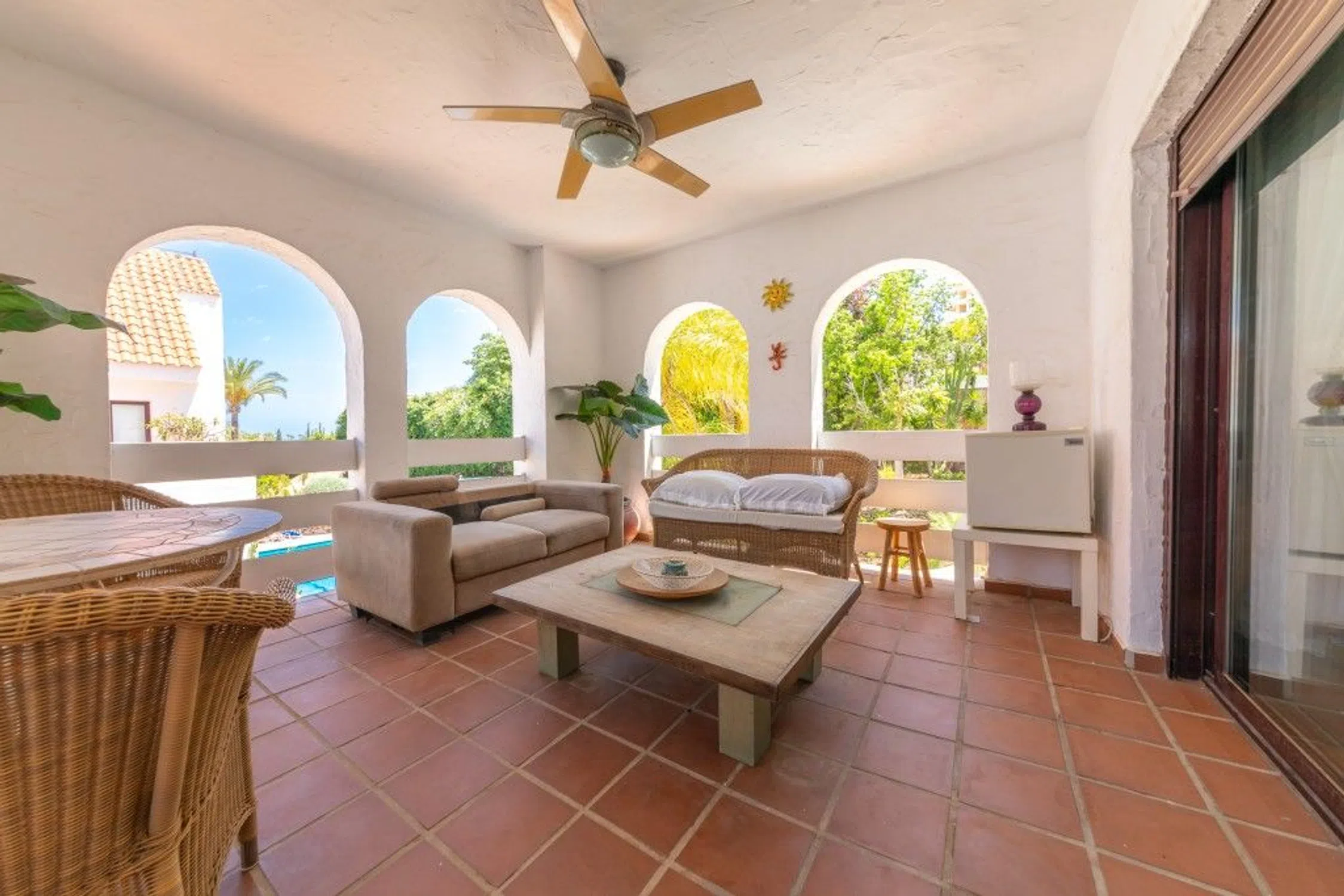 Este apartamento, decorado con mucho gusto, se encuentra en La Maestranza, una comunidad cerrada y segura de apartamentos y áticos en el corazón de Nueva Andalucía. Está a pocos pasos de Central Plaza, con su supermercado y restaurantes, así como del Marbella Arena. Puerto Banús, con sus playas, tiendas de diseño y puerto deportivo, también está a poca distancia a pie. Una ubicación ideal para disfrutar de los campos de golf de Nueva Andalucía y de todos los servicios de Marbella. El apartamento está situado en una planta baja elevada, con una terraza orientada al sur que da a los jardines y la piscina comunitaria. Incluye una plaza de garaje privada con acceso por ascensor a la planta del apartamento. El recibidor da paso a un salón comedor inusualmente amplio, con ventanas en dos fachadas — una con balcón francés y la otra con acceso a una terraza cubierta enmarcada por arcos de privacidad y vistas al jardín. La cocina está equipada con horno, placa y lavavajillas integrados, y hay una zona de lavandería separada con lavadora y secadora. Otras características incluyen aire acondicionado frío y calor. Una vivienda práctica y bien situada en una comunidad segura — ideal para quienes desean estar cerca de las tiendas, restaurantes y playas de Nueva Andalucía y Puerto Banús.