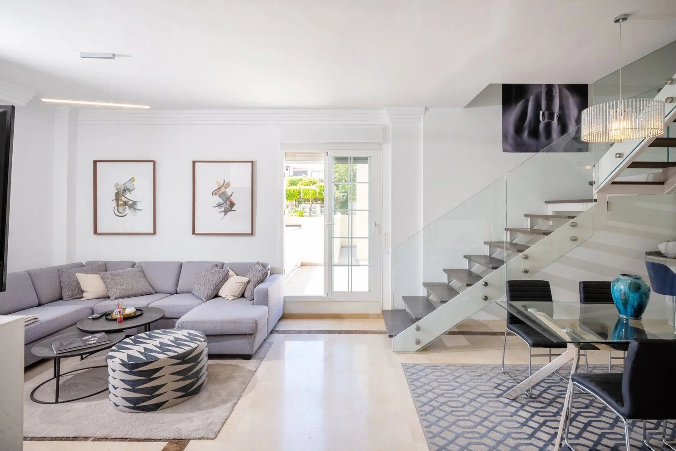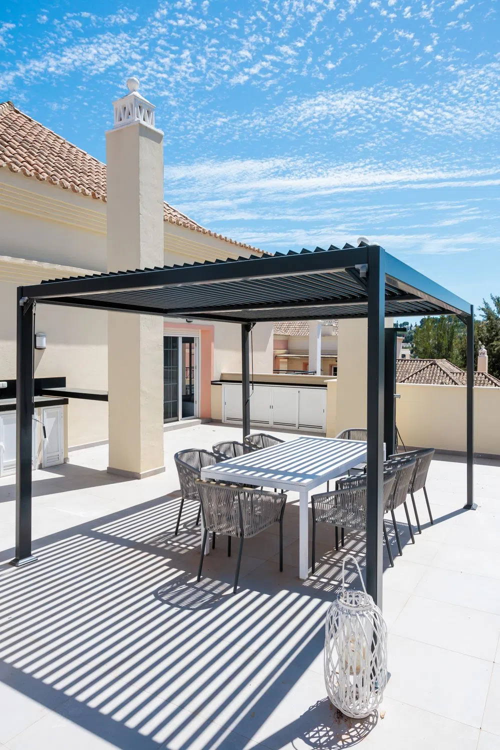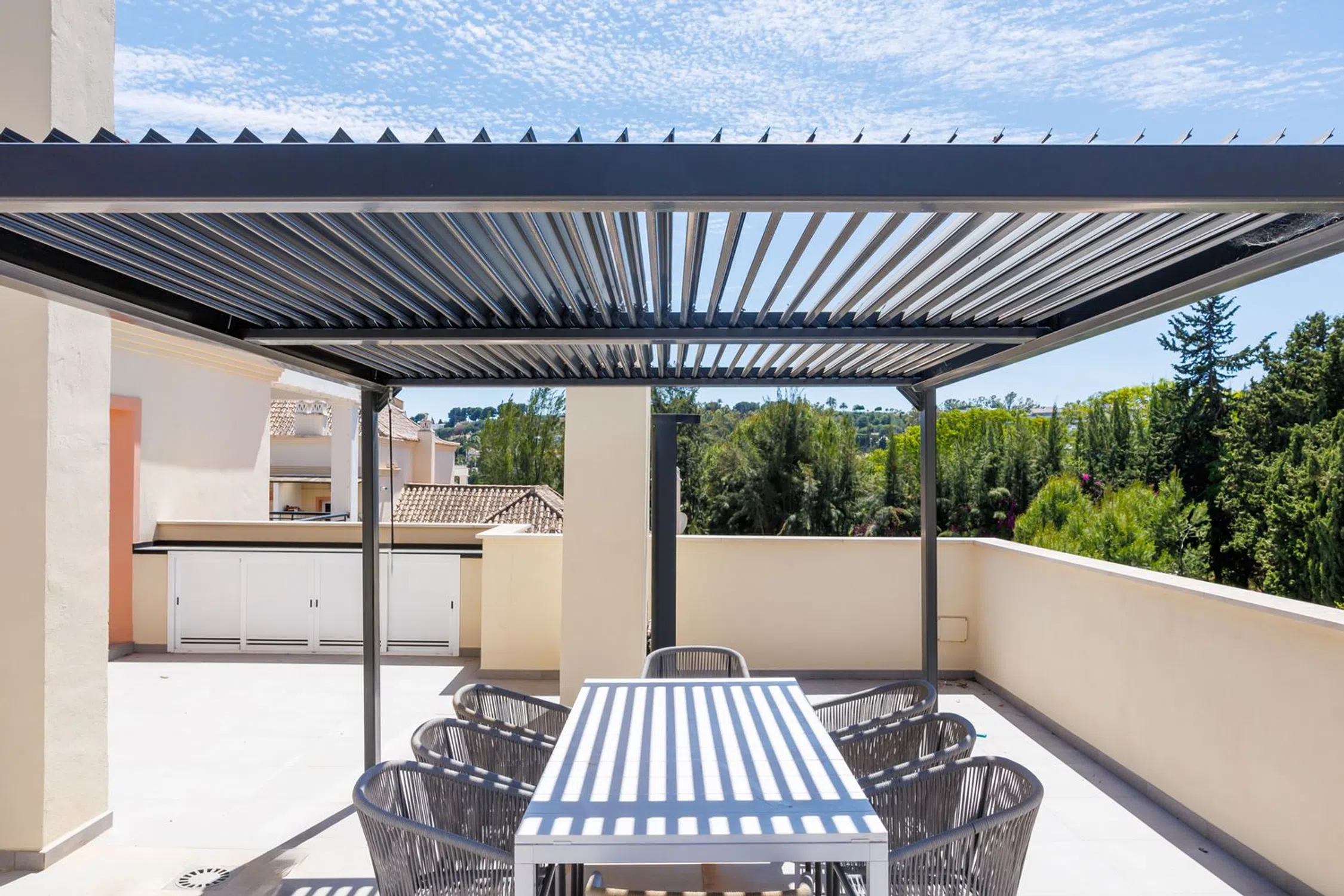 Gran ático duplex con vistas parciales al mar y a la montaña en Marbella River Garden, Nueva Andalucía. Construido y reformado hace dos años con materiales de alto estándar, la propiedad consta de: vestíbulo; gran salón comedor con chimenea de 50m2; moderna cocina abierta con electrodomésticos de gama alta; aseo de invitados; una gran terraza de 117 m2 con increíbles vistas a la montaña y al campo de golf de las Brisas con cocina exterior y barbacoa; dos dormitorios dobles que comparten baño con bañera, En la planta de arriba gran dormitorio master, con baño en suite y vestidor con mas de 40 m2, que da paso a una terraza con vistas parciales al mar. La propiedad incluye dos plazas de garaje y dos trasteros. La urbanización cuenta con conserjería y servicio de seguridad las 24 horas, jardines y piscina. Una maravillosa propiedad a tan sólo 5 minutos en coche de Puerto Banús y la playa.