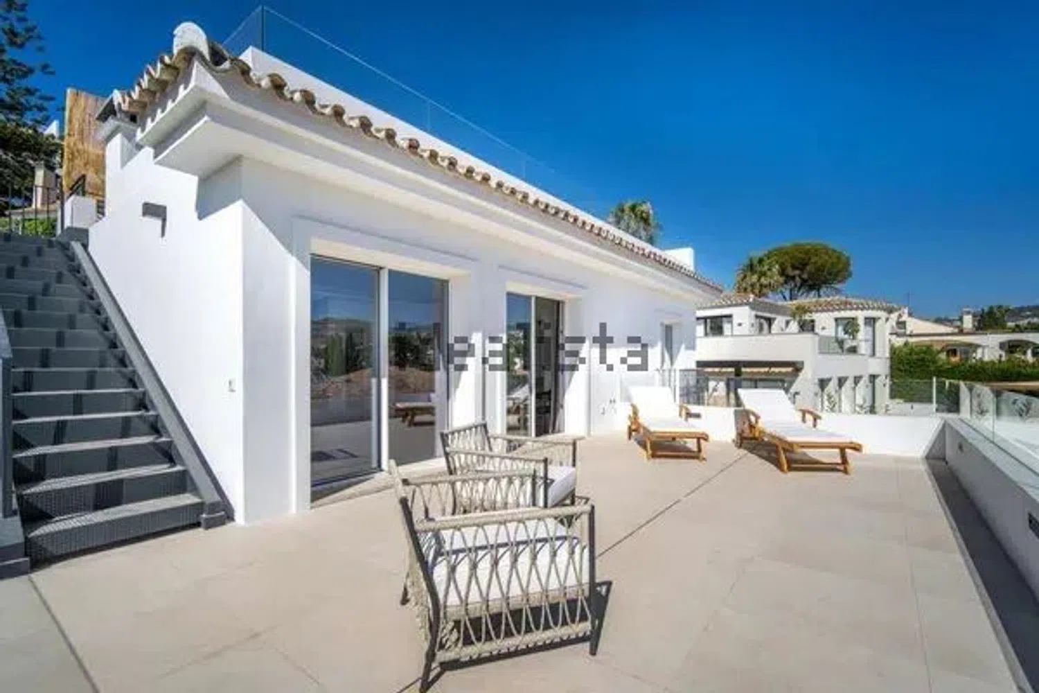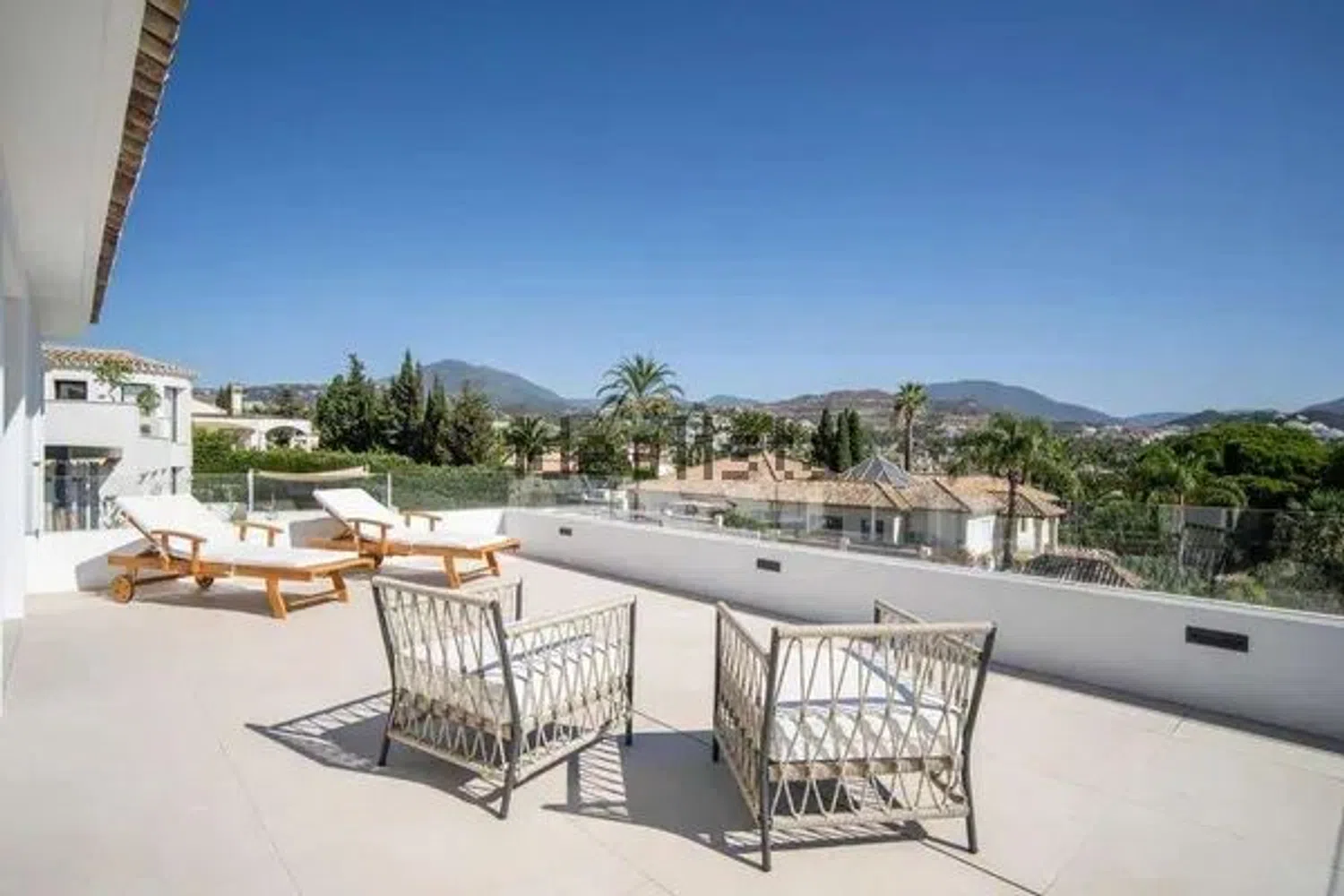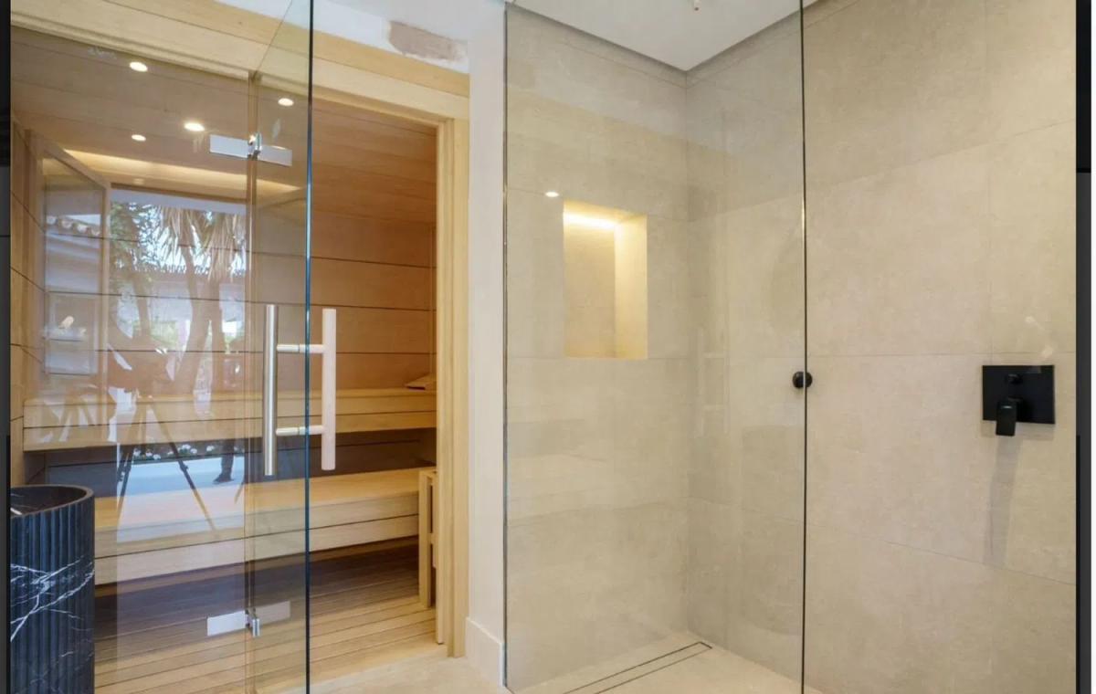 Esta moderna villa está situada en Nueva Andalucía, está totalmente reformada en 2023 y tiene hermosas vistas al campo de golf Las Brisas y a la montaña de La Concha. 5 Dormitorios 5 Baños 448m2 Vivienda 120m2 Terrazas 802m2 Parcela En la planta baja hay un elegante salón-comedor con chimenea, una cocina abierta y aquí también se encuentran dos dormitorios con baño en suite. Desde la sala de estar tiene acceso directo a las amplias terrazas con comedor y sala de estar, jardín paisajístico, sauna y piscina. En la primera planta se encuentra el dormitorio principal con baño en suite, una terraza privada con impresionantes vistas y otro dormitorio con baño en suite. Otro dormitorio con baño en suite tiene su propio acceso, idealmente puede ser utilizado para el personal. Una azotea donde podrá disfrutar de hermosas vistas a la montaña de La Concha y a los campos de golf.