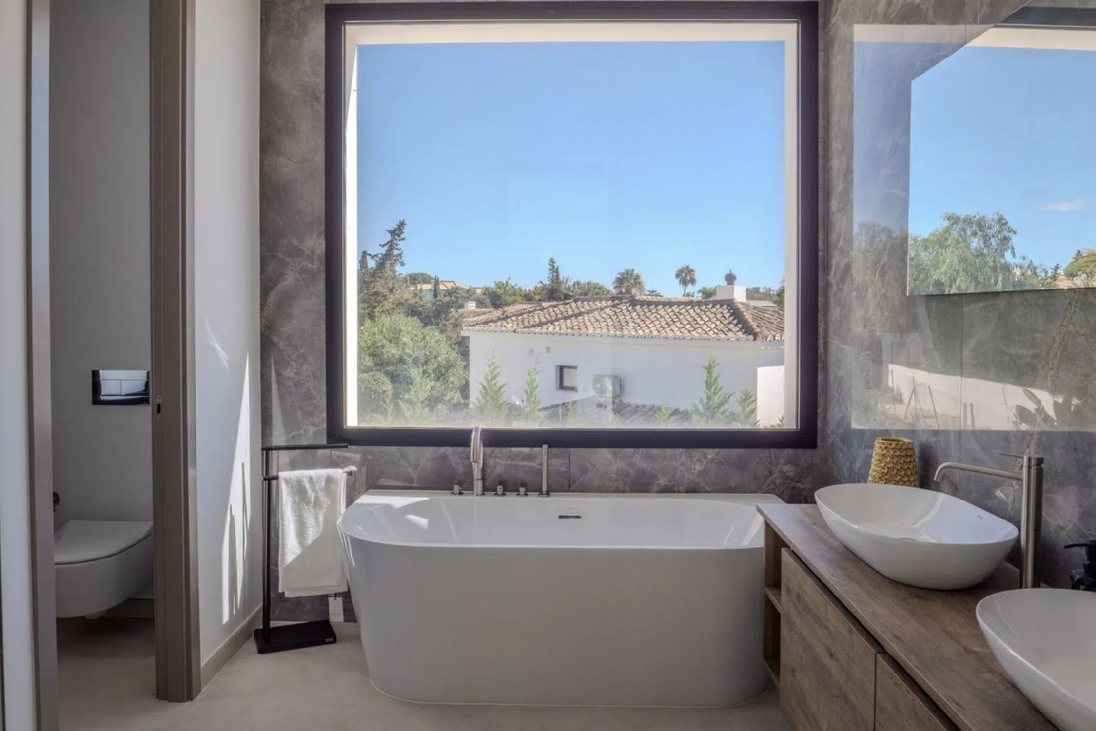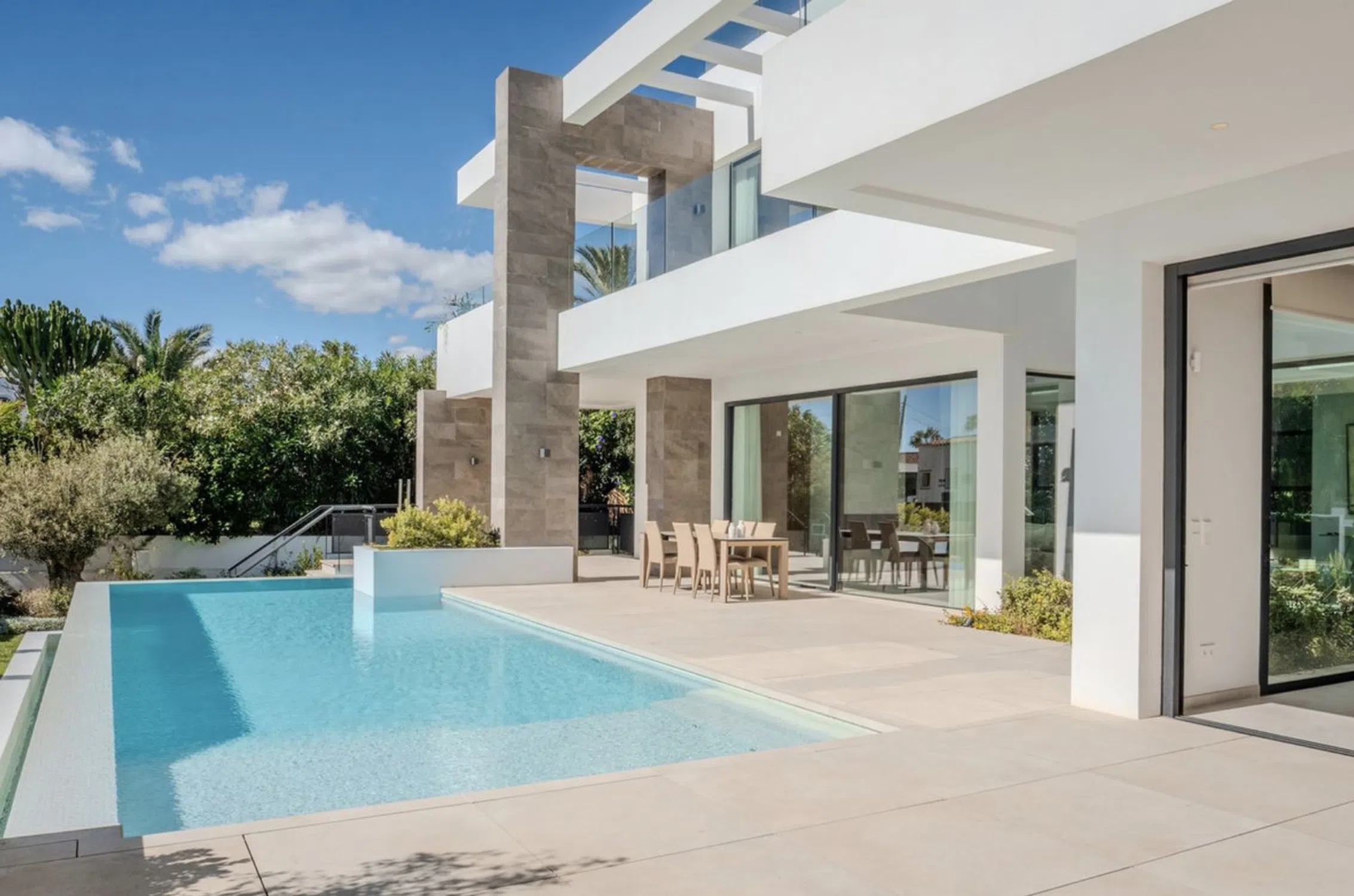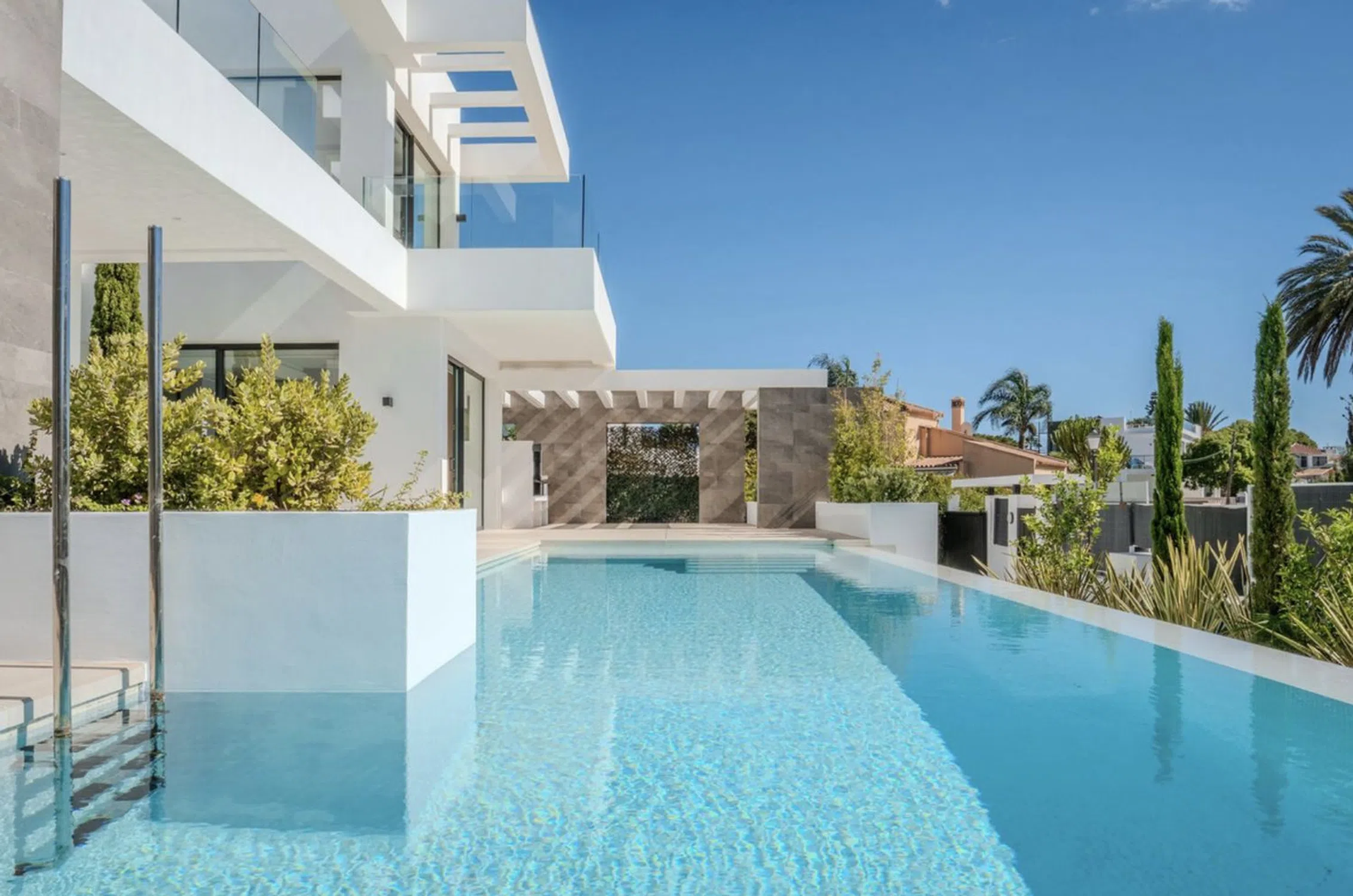 Excepcional villa contemporánea de nueva construcción ubicada en el prestigioso enclave residencial de Marbesa Beach, en la zona de Elviria. Esta codiciada ubicación es conocida por su ambiente tranquilo, exclusividad y proximidad a la costa. A pesar de su tranquila ubicación, la propiedad goza de una excelente conexión con la red de carreteras principal, zonas comerciales y servicios esenciales. La villa se asienta sobre una generosa parcela de 779,72 m² y ofrece una impresionante superficie habitable interior de 390,45 m². Al entrar en la vivienda, le da la bienvenida una amplia sala de estar de planta abierta con una elegante chimenea y una elegante y moderna cocina con comedor contiguo. Electrodomésticos de alta gama y puertas corredizas de cristal de altura completa inundan el interior de luz natural, creando un ambiente luminoso y acogedor durante todo el día. La sala de estar se abre a la perfección al jardín, la terraza cubierta y la impresionante piscina turquesa, que incluye una exclusiva ventana subacuática que ilumina el trastero inferior. La terraza se complementa con una barbacoa de piedra empotrada, perfecta para disfrutar al aire libre. Desde esta planta, también se pueden disfrutar vistas parciales al mar. La planta principal incluye un espacioso dormitorio de invitados con baño privado en suite, así como un aseo de invitados independiente. Una imponente escalera flotante con diseño tipo galería conduce a la planta superior, donde dos dormitorios bellamente decorados con baño en suite, cada uno con acceso a su propia terraza privada. Uno de ellos es la impresionante suite principal, que cuenta con un amplio vestidor y un lujoso baño con bañera, ducha a ras de suelo y lavabo doble. Ambos dormitorios disfrutan de encantadoras vistas al mar. Desde esta planta, una escalera exterior conduce al amplio solárium de 100 m² en la azotea. Este excepcional espacio ofrece impresionantes vistas panorámicas al mar y amplio espacio para una sala de relajación, jacuzzi, zona de fitness al aire libre, zona de barbacoa u otros espacios de ocio. La planta baja de la villa alberga un lavadero, una sala técnica, un baño y tres zonas versátiles ideales para gimnasio, home cinema, sala de juegos o dormitorio adicional, ofreciendo flexibilidad para adaptarse a diferentes estilos de vida.