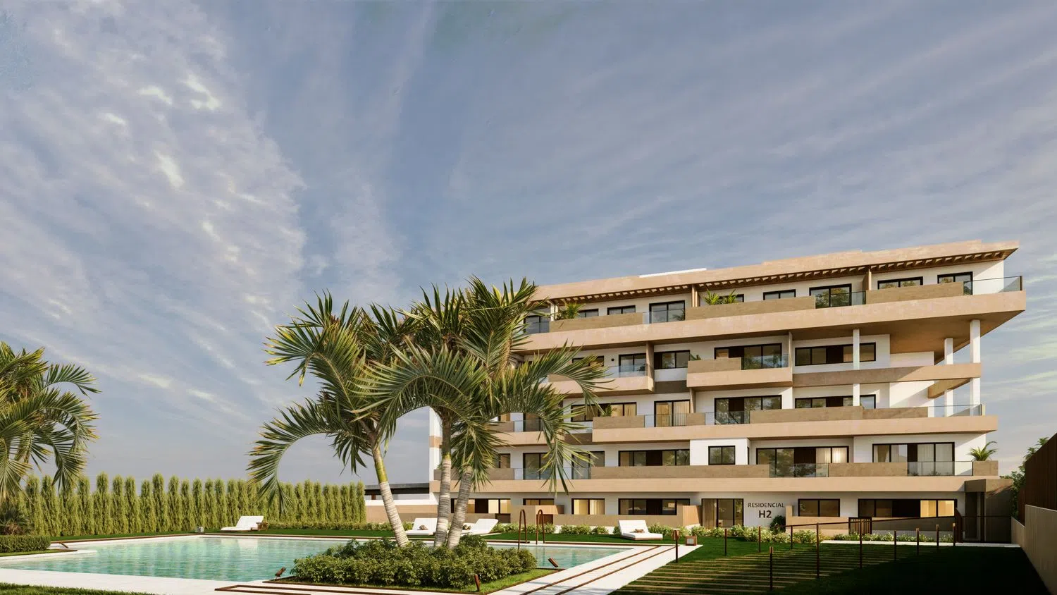 RESIDENCIAL H2 состоит из студий и квартир с 2-3 спальнями. Все апартаменты имеют просторные террасы для наслаждения свежим воздухом. В стоимость жилья включены место на подземной парковке и кладовая комната. Общие зоны комплекса прекрасно подходят для отдыха и развлечений. Здесь есть бассейн, достойный курорта, и вы сможете наслаждаться им в любое время.