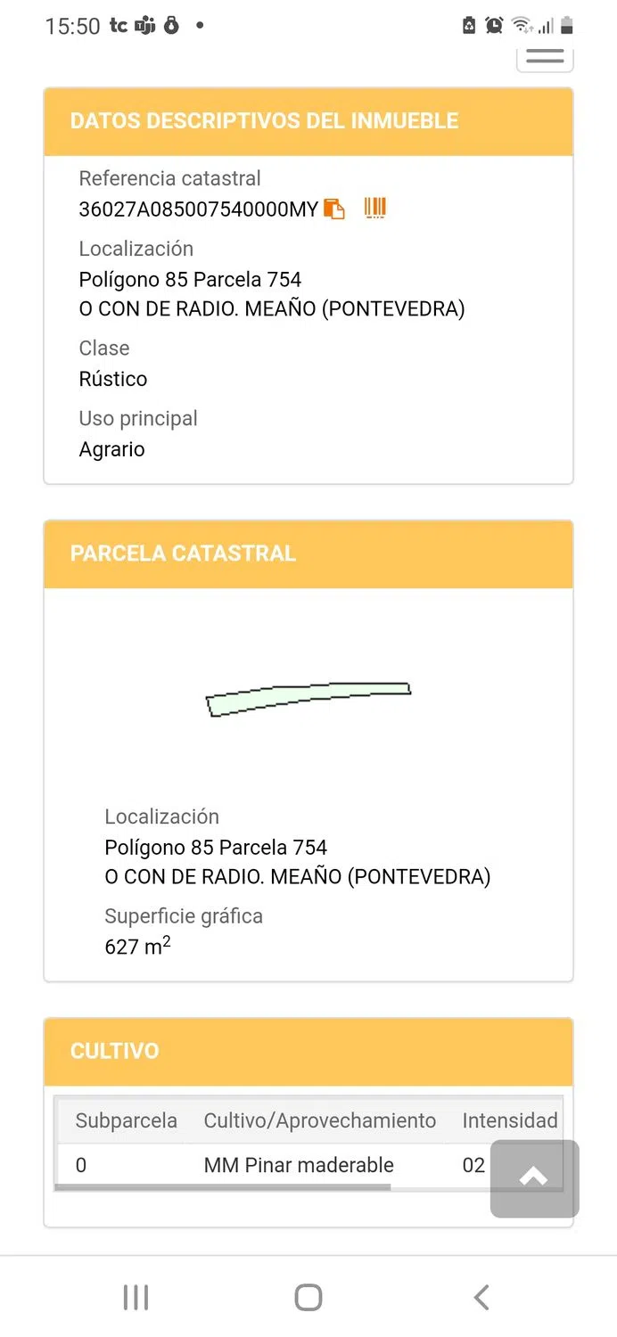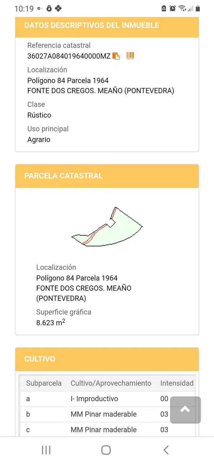 Se venden montes en el concello de meaño, a 6 €/ m2. Contacto: Rogelio Referencias catastrales: 36027a0 00mz polígono 84 parcela 1964 fonte dos cregos. 8.623 m2. 36027a0 00mu polígono 85 parcela 493 lameiros. 2.091 m2. 36027a0 00mb polígono 85 parcela 497 lameiros. 1.158 m2 36027a0 00mi polígono 84 parcela 893 loureiro. 538 m2. 36027a0 00mg polígono 85 parcela 626 sobre xil. 226 m2. 36027a0 00ml polígono 84 parcela 496 loureiro. 213 m2. 36027a0 00my polígono 85 parcela 754 o con de radío 627 m2.