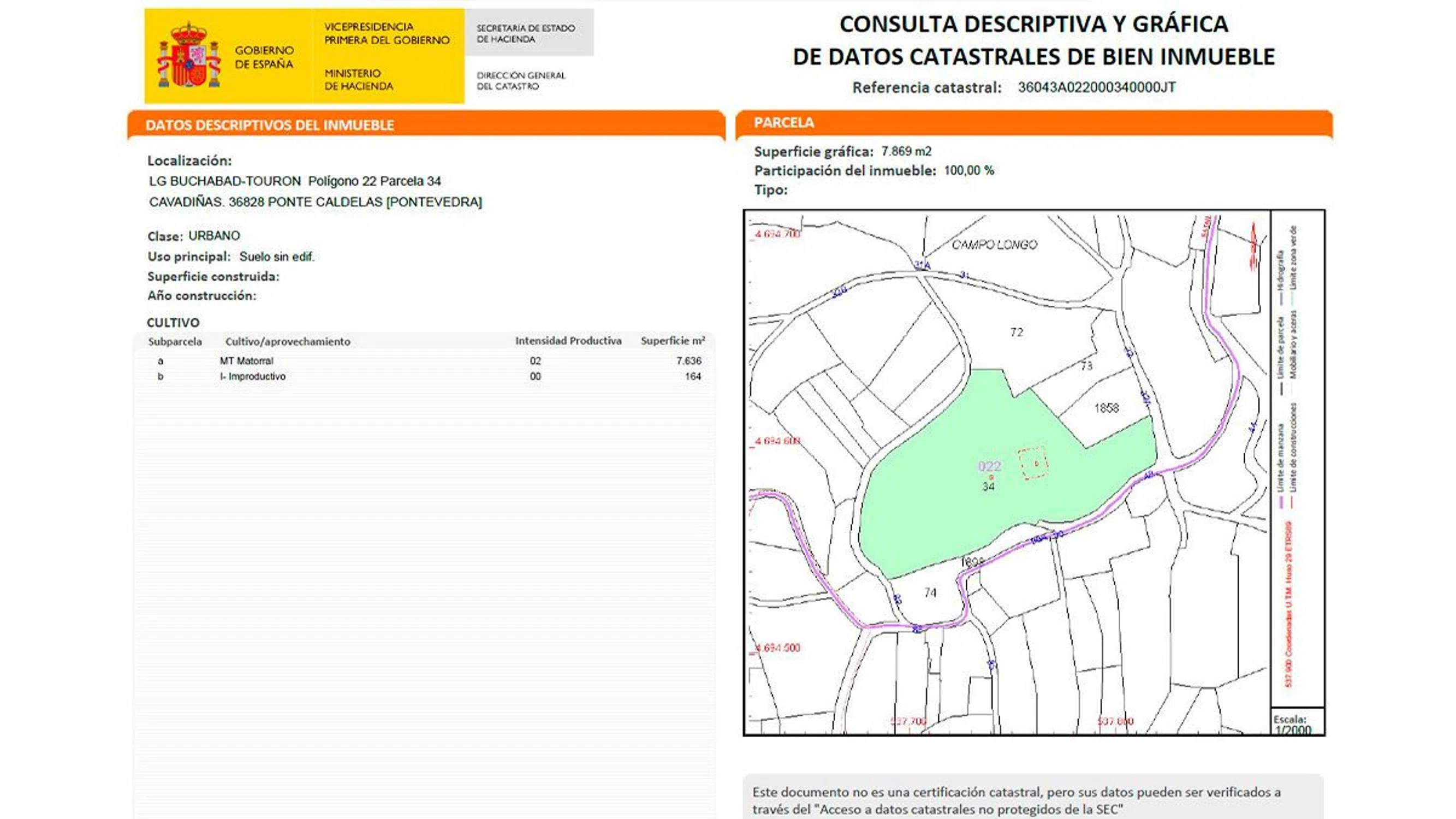 Suelo, Ubicado en BUCHABAD-TOURON Pg 22 Parc. 34 CAVADIÑAS. Ref catastral: 36043A022000340000JT Descubre la posibilidad de dar vida a tus sueños en esta Suelo de núcleo rural uso residencial sito en Ponte Caldelas (Pontevedra) Cuenta con una superficie de 7800,00 m2. ¡No dudes en consultarnos sin compromiso!