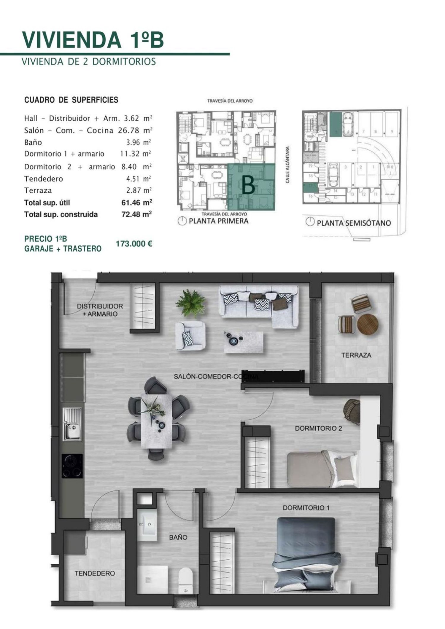 Se trata de un proyecto de 12 viviendas de uno y dos dormitorios con plaza de garaje y trastero. Alicatado con plaqueta cerámica en cocina y baños. • Pavimento de gres porcelánico en toda la vivienda. • Pintura plástica lisa sobre yeso color blanco en el resto de estancias de la vivienda. • Rodapié blanco en cuartos secos. • Gres antideslizante en terrazas y tendederos. Carpintería exterior de aluminio con rotura de puente térmico bicolor (marrón al exterior y blanco en interior) con doble acristalamiento de baja emisividad y cámara con gas argón para conseguir una alta eficiencia energética. Incluye sistema de microventilación. Climatización a través de suelo radiante y refrescante producido por instalación de Aerotermia, con producción mixta de agua caliente sanitaria y refrigeración.