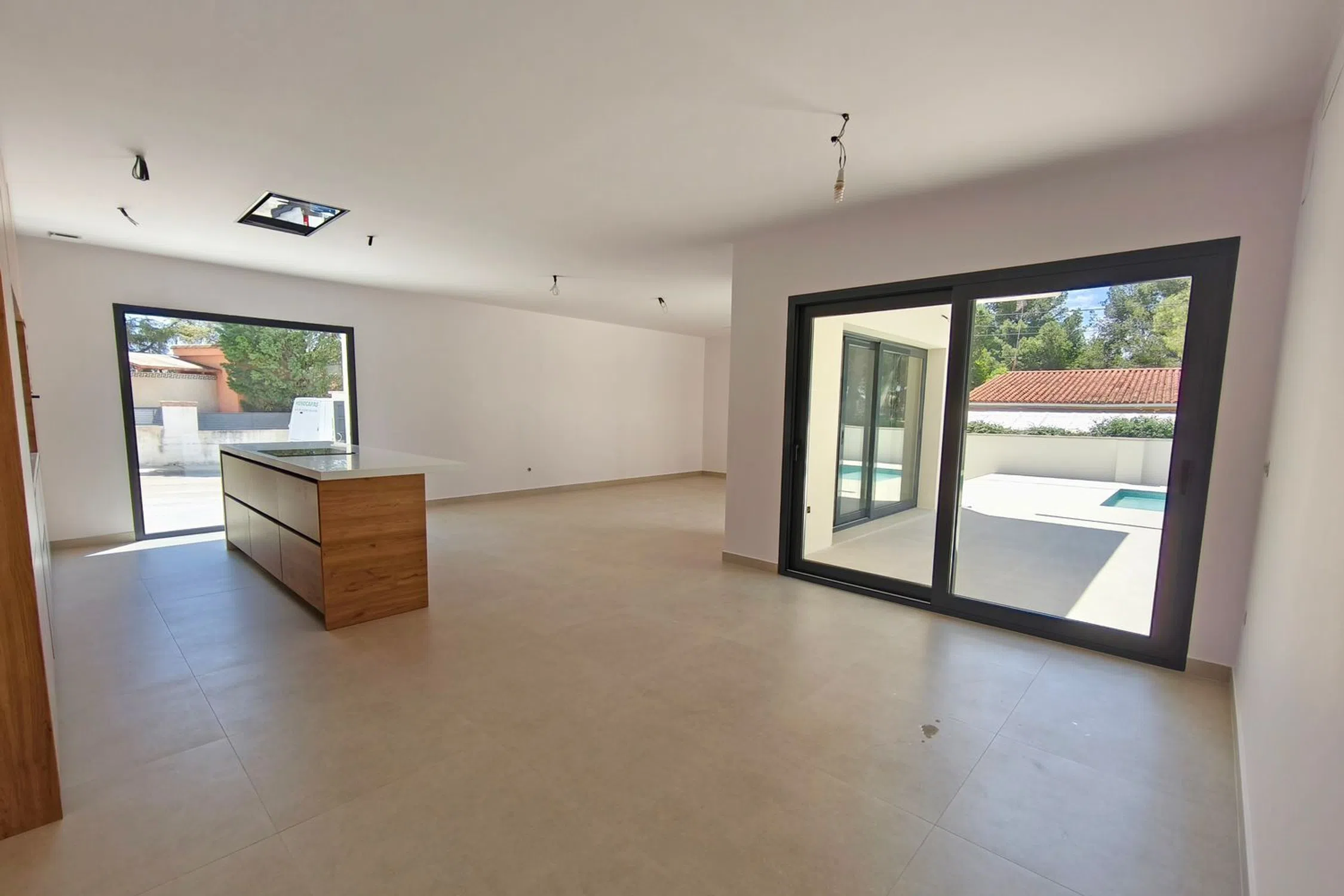 Во дворе находится терраса, соединенная с бассейном и зоной для пляжа, а также парковка с декоративным бетонным покрытием, дорожка с керамическими плитками и искусственным газоном, остальная часть участка будет окончен гравийной и плодородной землей для создания сада на ваш вкус. Предусмотрены несколько точек подвода воды.