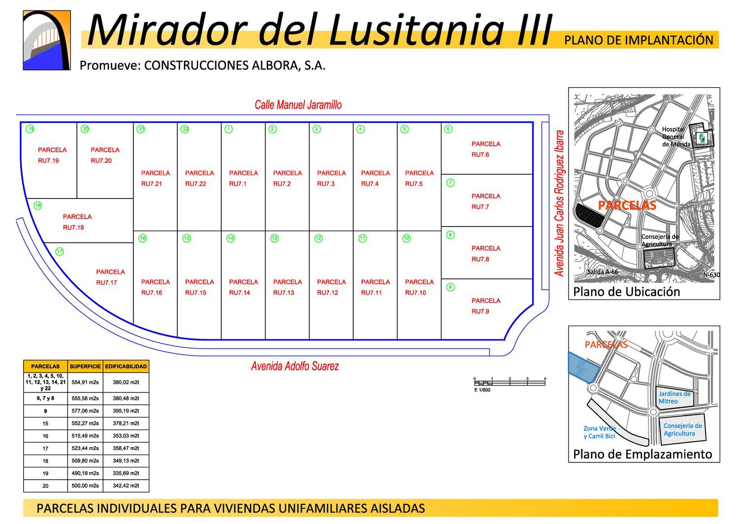ULTIMAS PARCELAS A LA VENTA PARA AUTOCONSTRUCCIÓN DEL MIRADOR DEL LUSITANIA, Parcelas que permiten a cada propietario disfrutar de una vivienda unifamiliar aislada con piscina privada, así como de un extenso jardín particular.Las parcelas se encuentran en un entorno inmejorable, con una suave pendiente que hace de la ladera un excelente mirador a la ciudad monumental de Mérida.En MIRADOR DEL LUSITANIA hemos diseñado parcelas que permitan que las viviendas tengan una arquitectura contemporánea que permita potenciar nuestros sentidos, y jugar con los espacios interiores y exteriores de manera que puedan llegar a confundirse.MIRADOR DEL LUSITANIA ofrece parcelas rectangulares de 550 m2 de superficie y 380 m2 de edificabilidad máxima, que permiten una gran versatilidad en el diseño de cada vivienda.En MIRADOR DEL LUSITANIA encontrará el espacio y el bienestar que anhela para su familia, diseñando y creando su hogar a su gusto y necesidades.